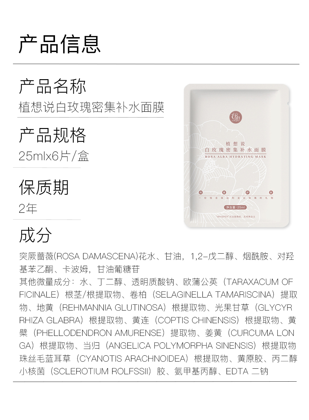 植想说纯素护肤密集补水保湿烟酰胺大马士革天然有机白玫瑰面膜