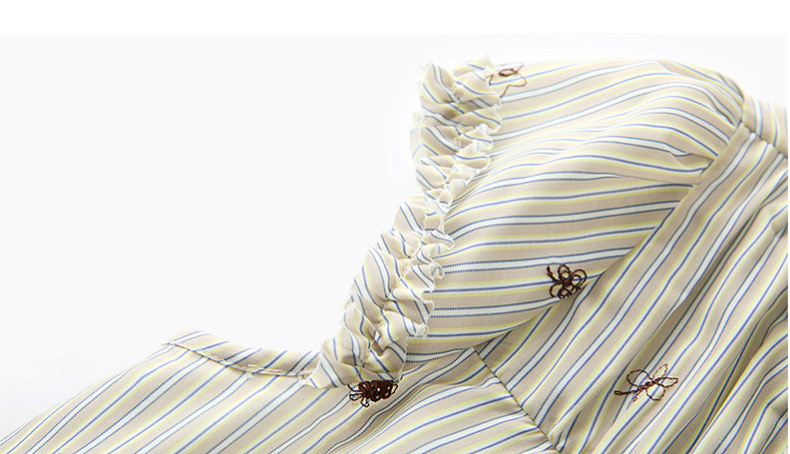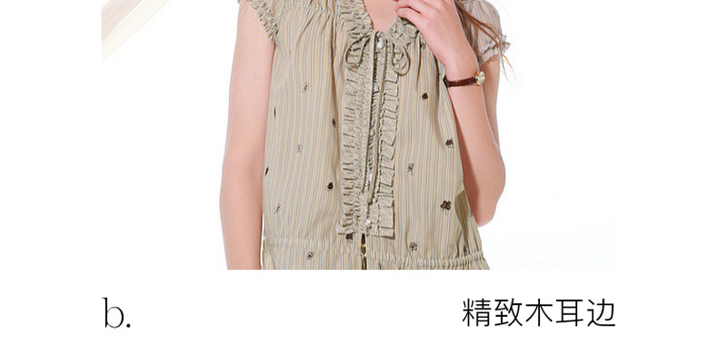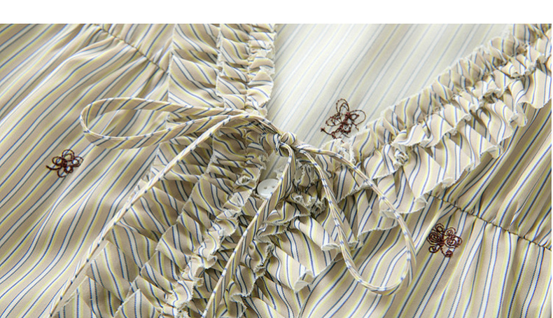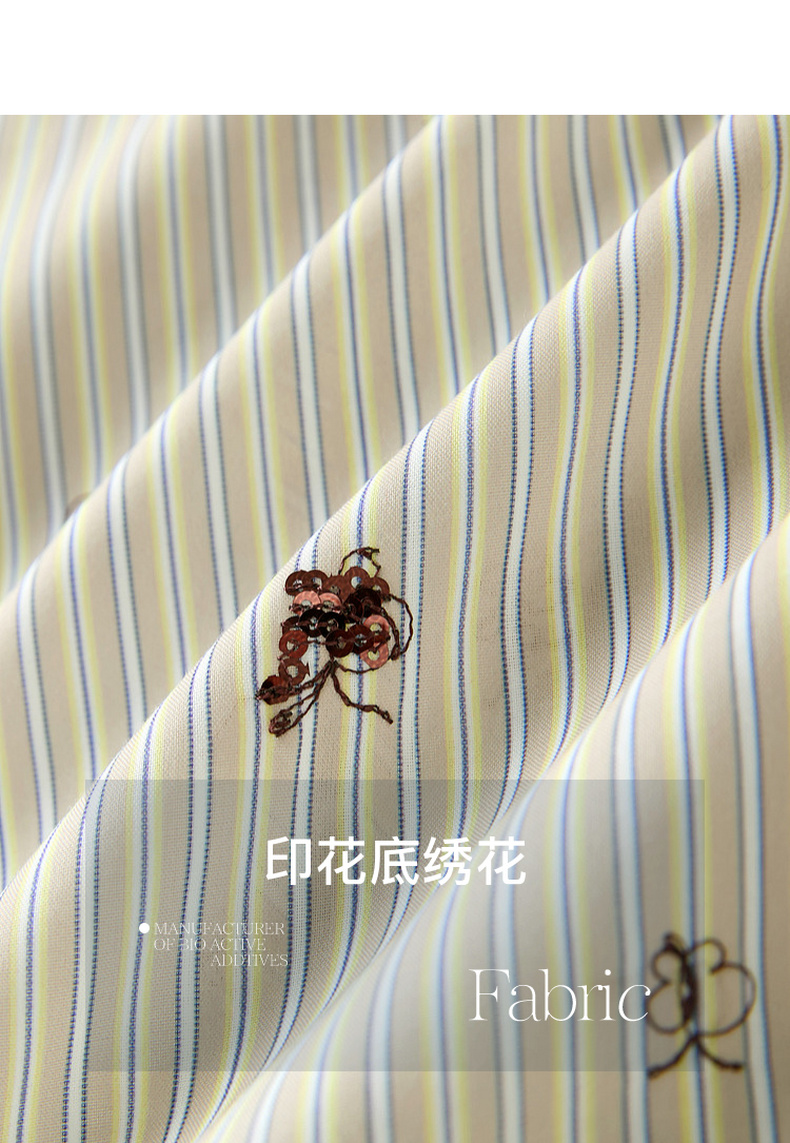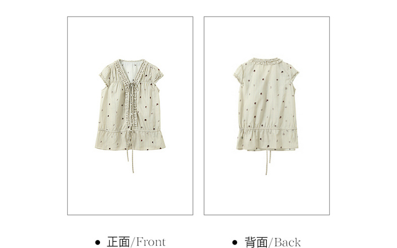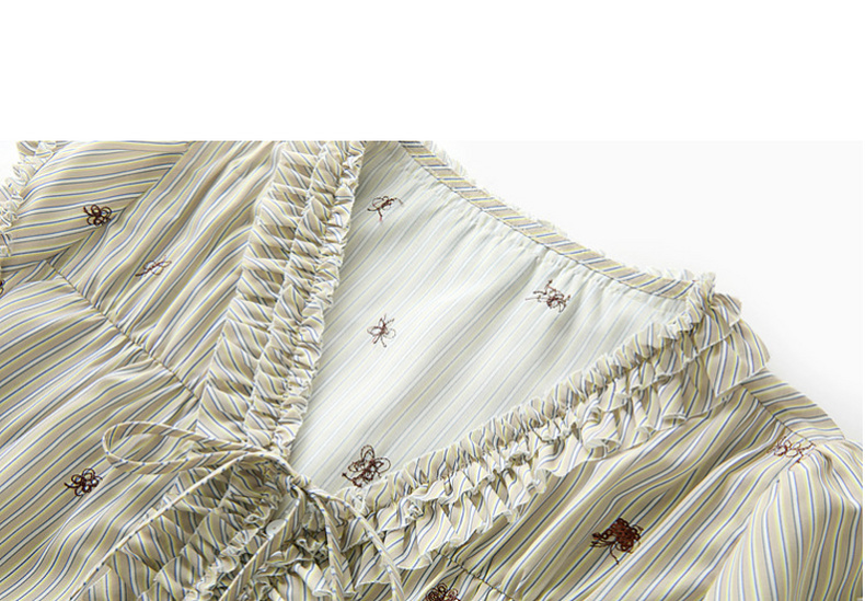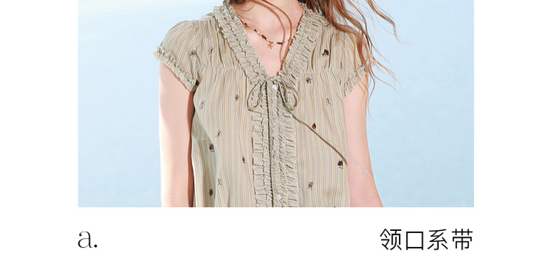 三彩2026夏季新款条纹绣花衬衫小衫V领系带短袖上衣衬衣M