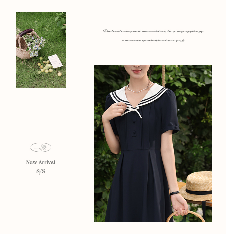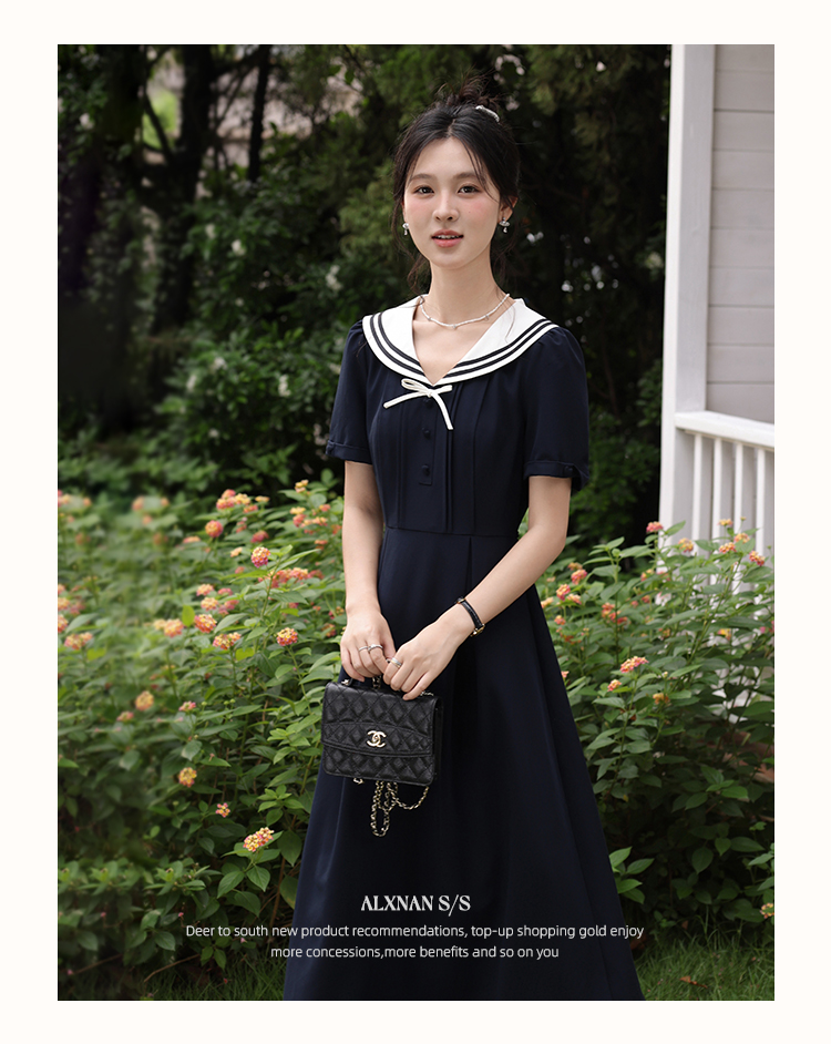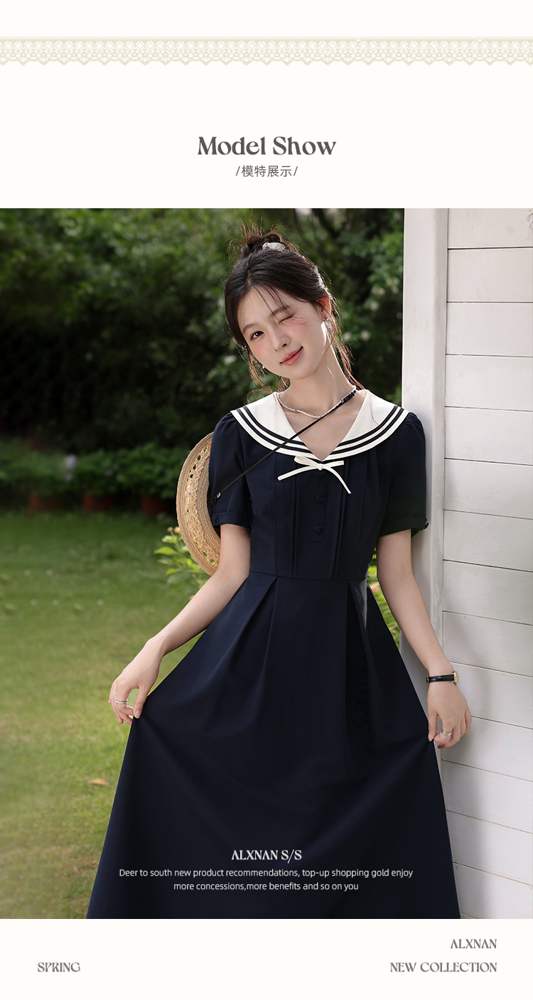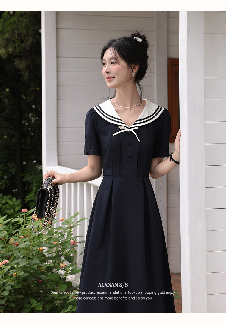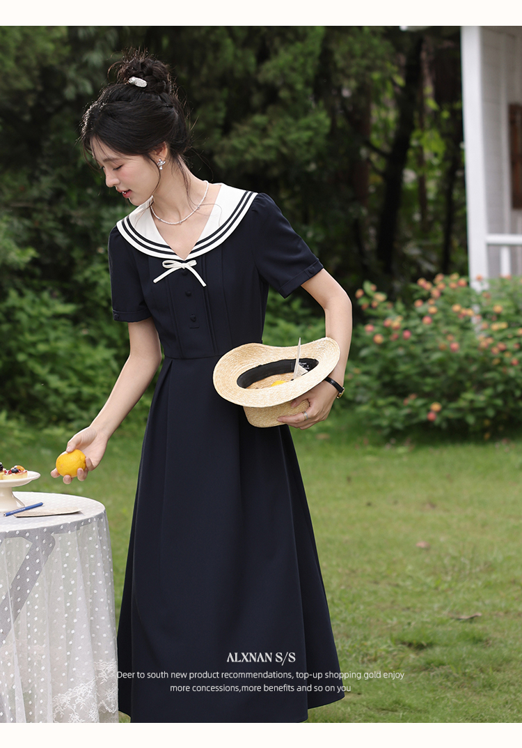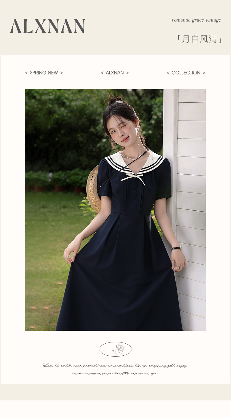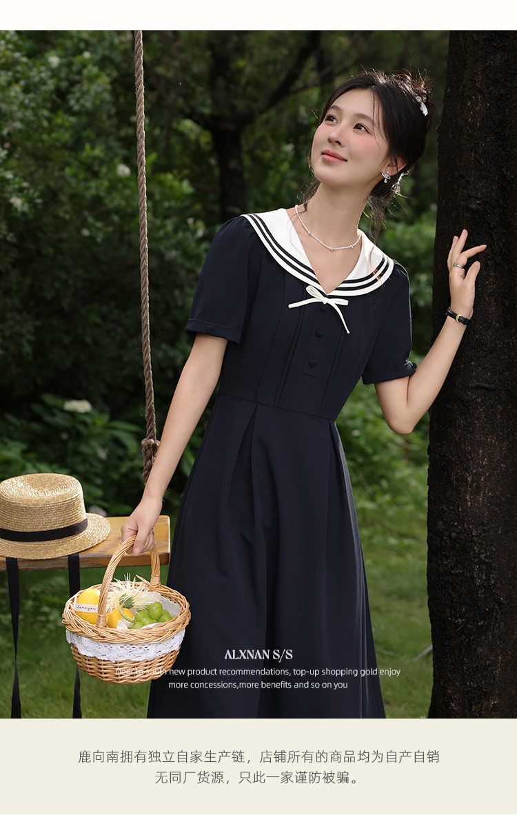 鹿向南「月白风清」藏蓝色海军领连衣裙女夏气质法式短袖长款裙子