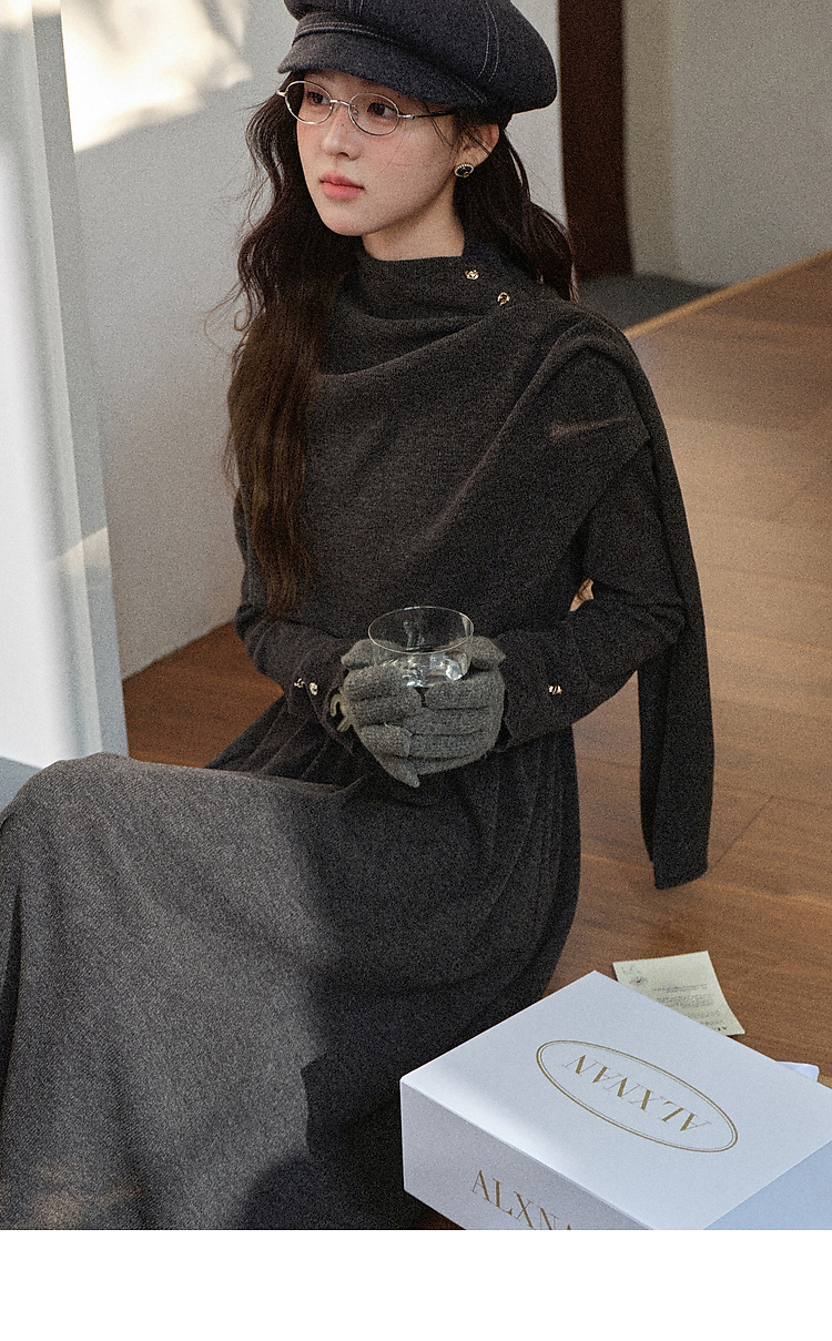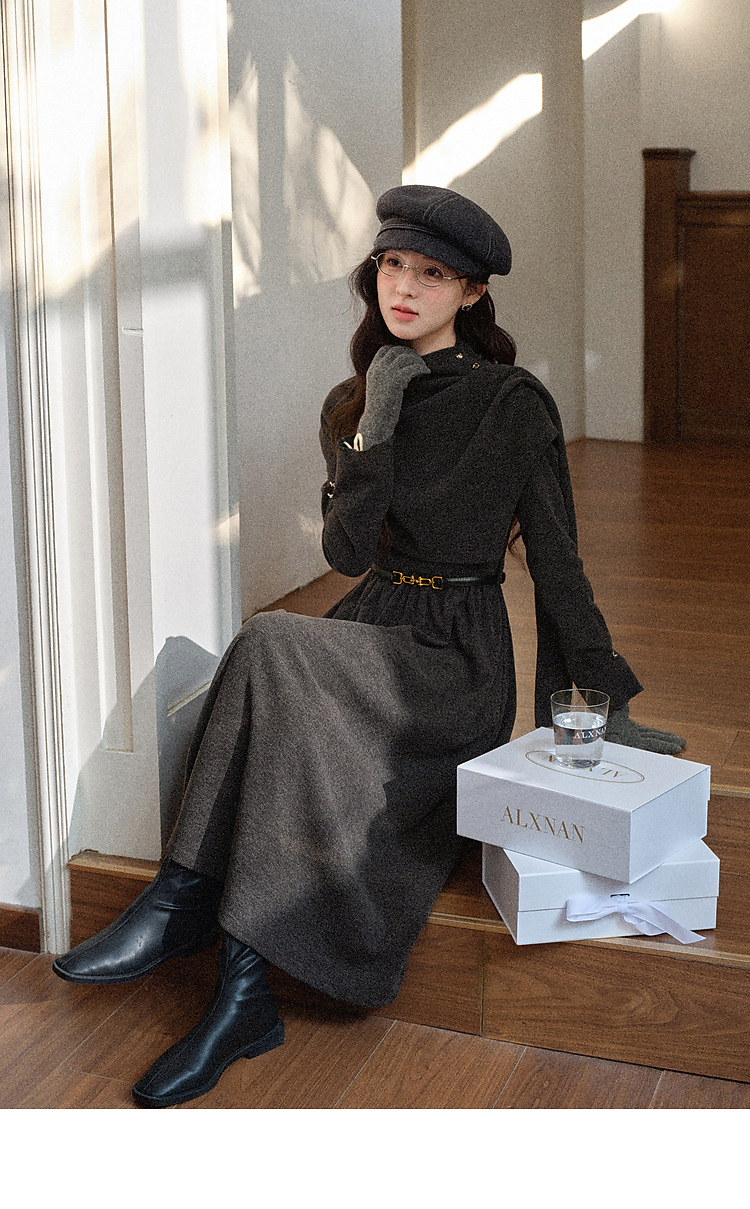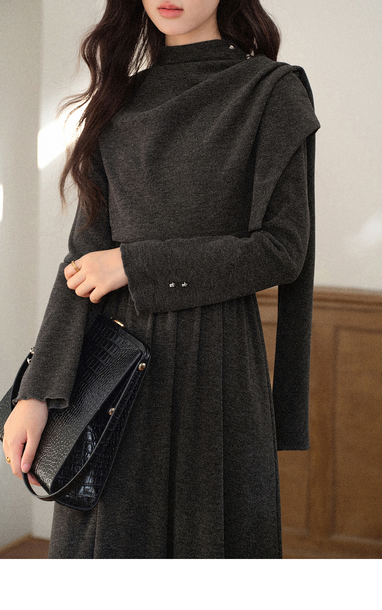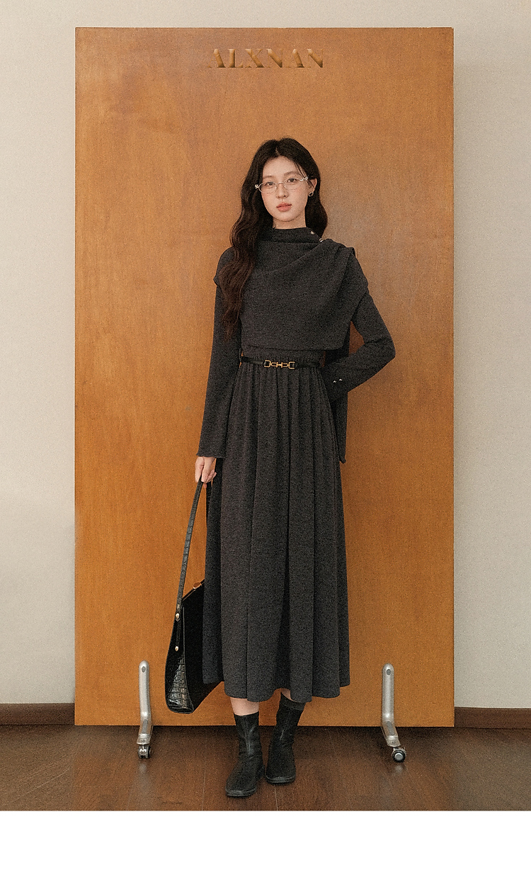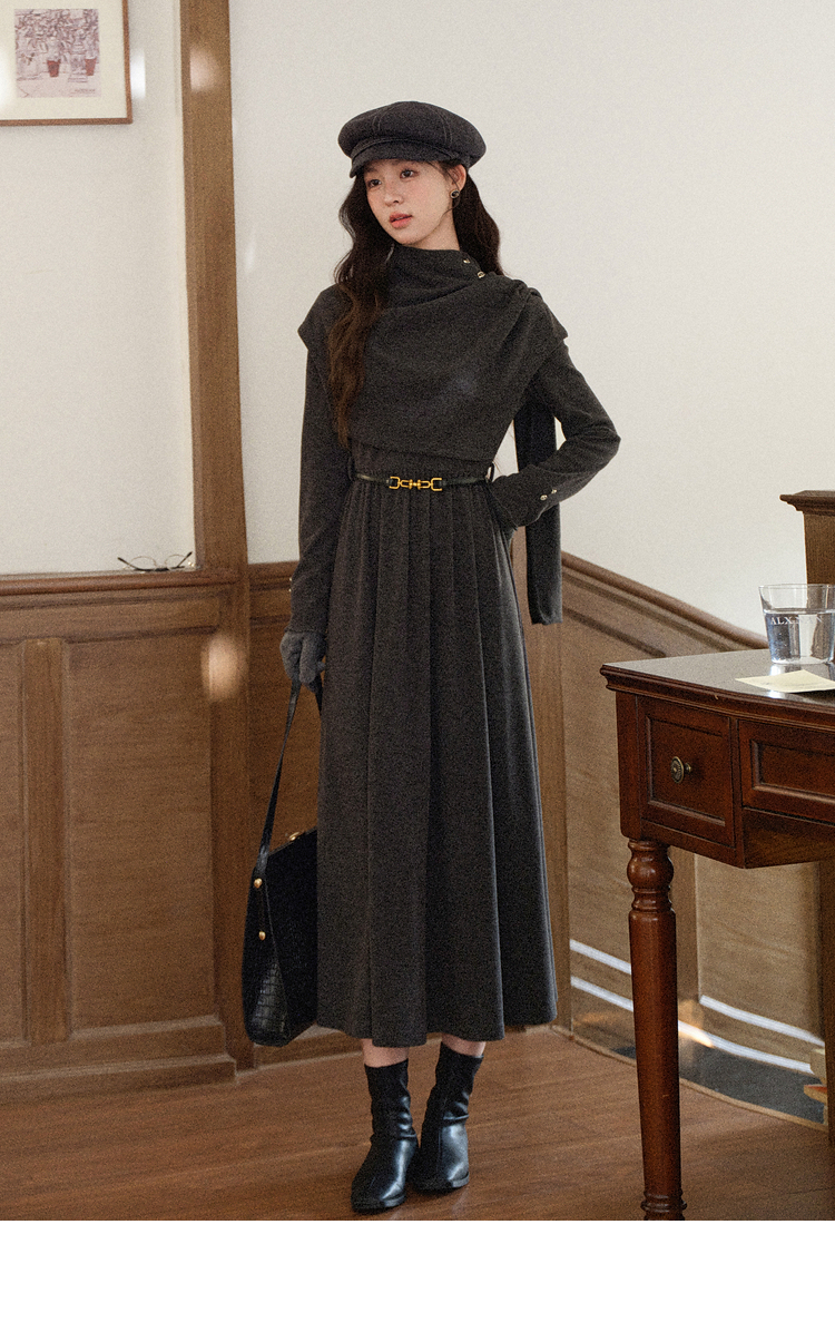 鹿向南「赫本千金」设计感半高领黑色显瘦连衣裙披肩两件套女初秋