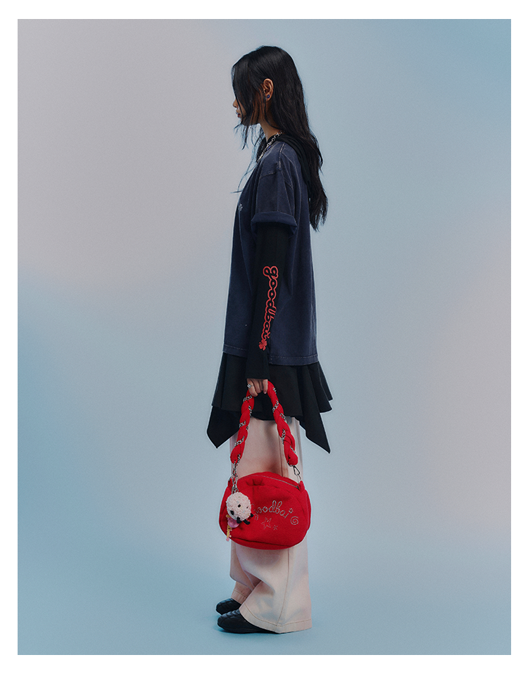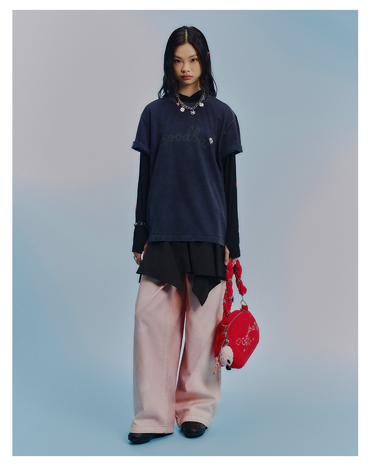 GOODBAI GOODEES 机器小猫logo做旧图案印花撞色oversize长袖T恤