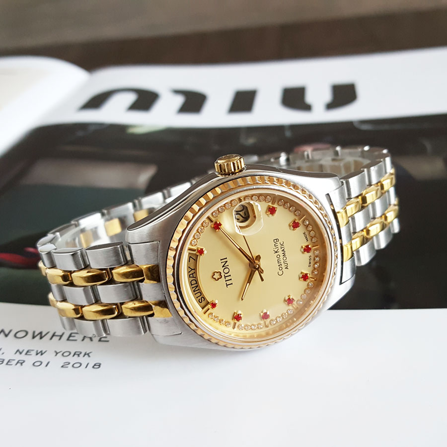 【95新】TITONI 梅花777自动机械机芯日期、星期显示38MM(男款)COSMO KING系列精钢镀金201125TJ17