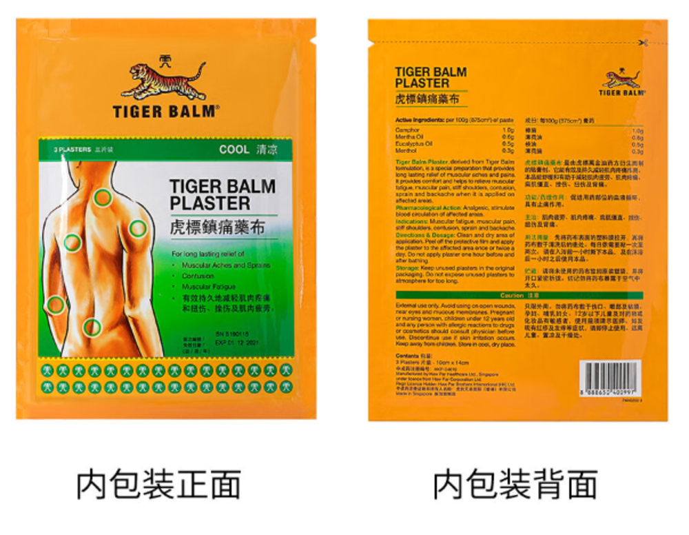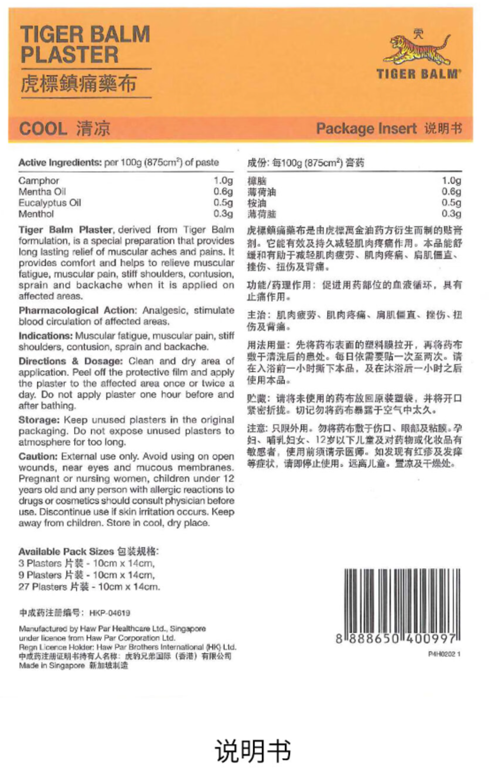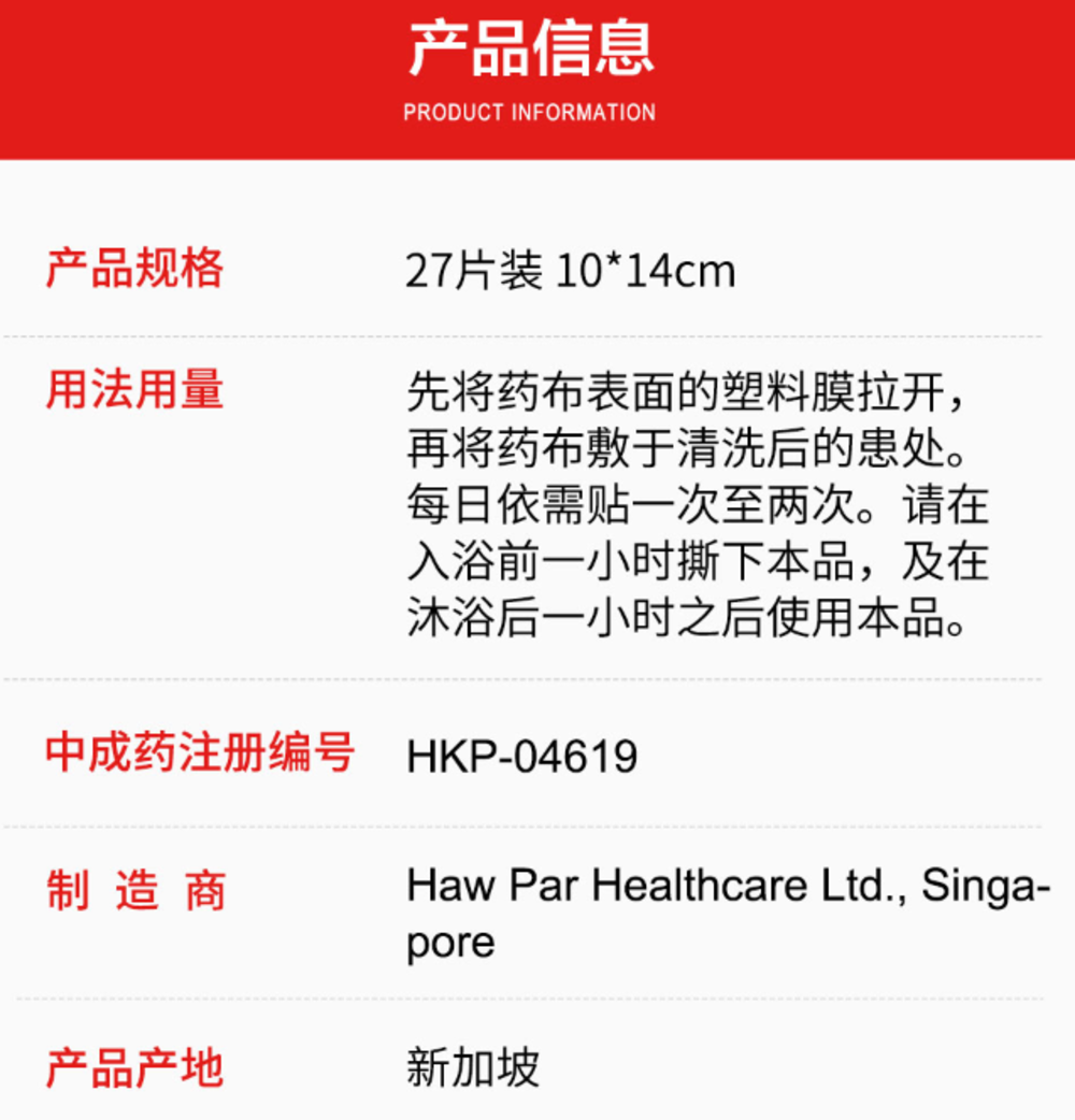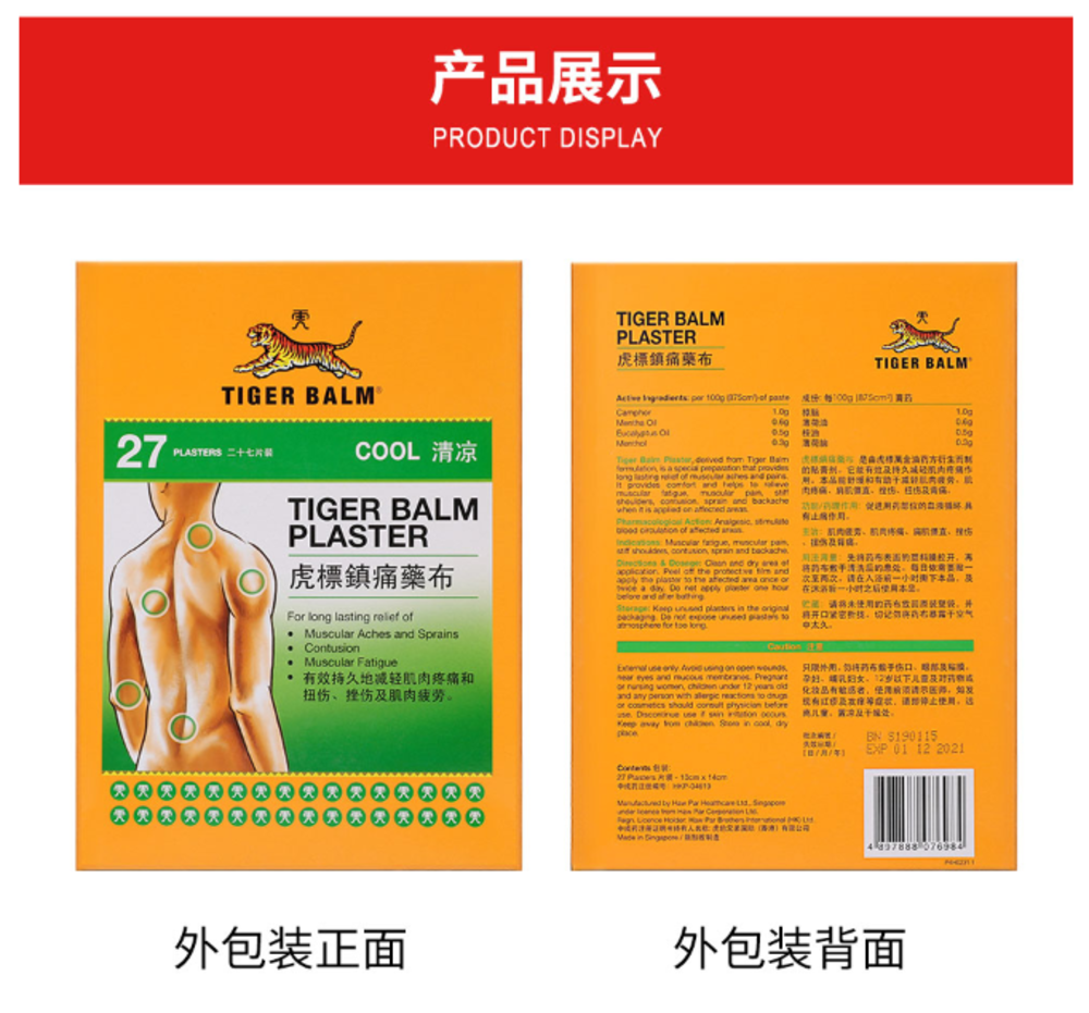 【香港直邮】肌肉疲劳疼痛扭伤挫伤 正品虎标〈绿色〉冷感镇痛药布(27片装)