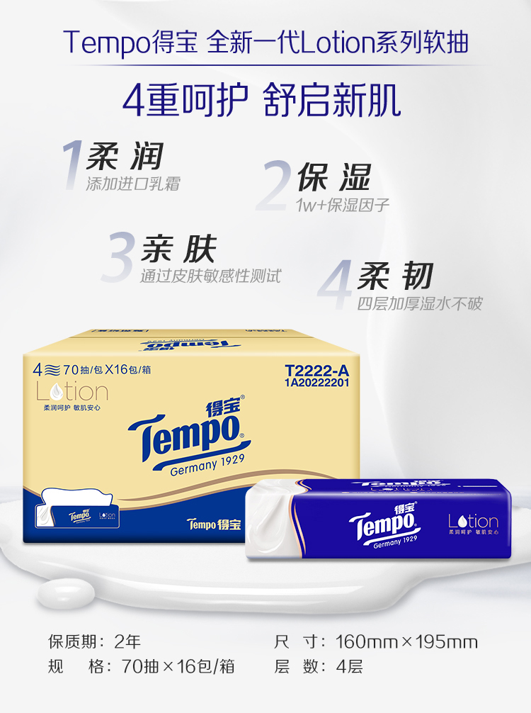 f『得宝Tempo』lotion抽取式乳霜纸面巾纸70抽*16包/箱