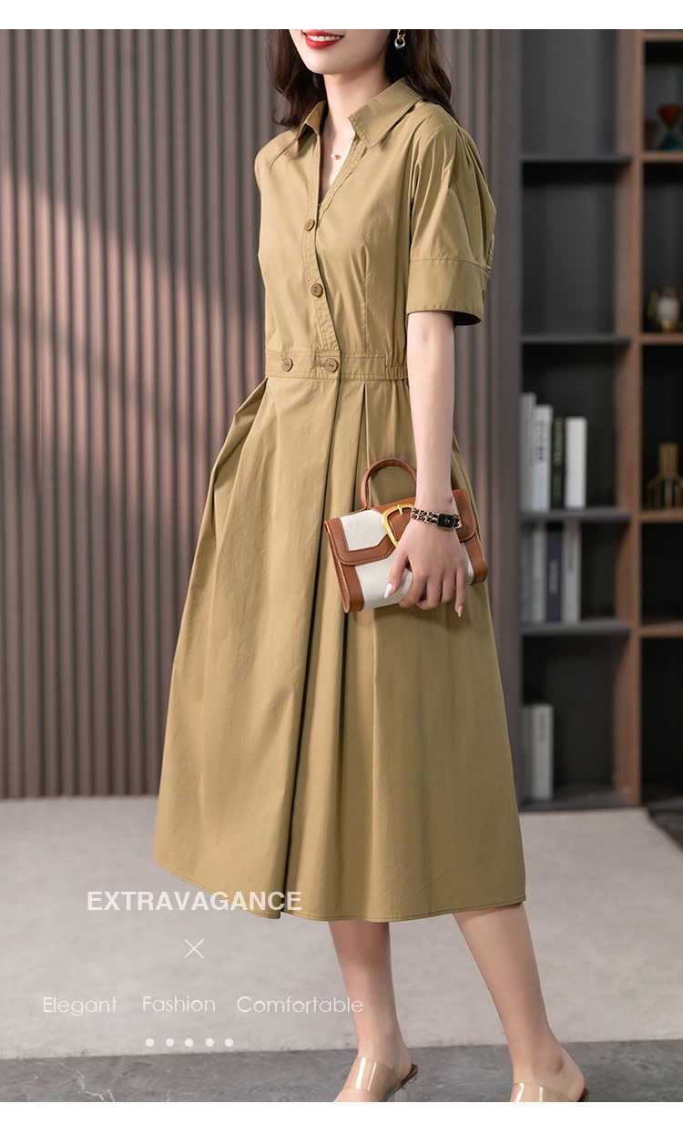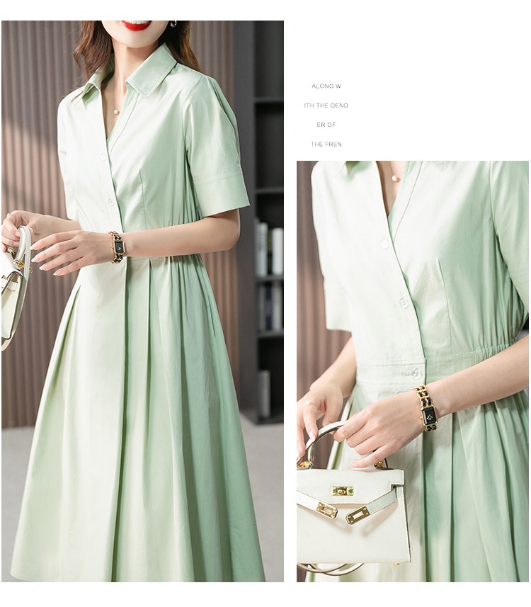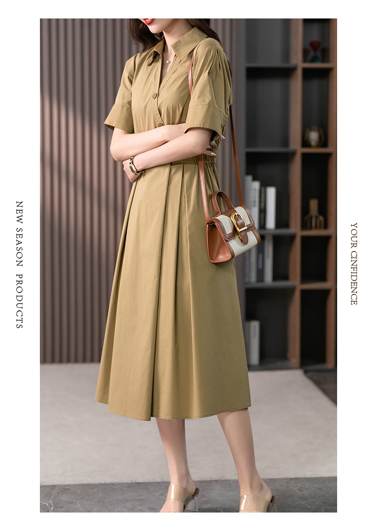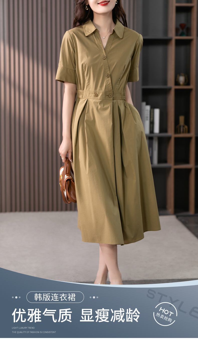 YX【现货7天】高级感V领连衣裙女中长款2024夏季新款韩版高腰显瘦衬衫长裙