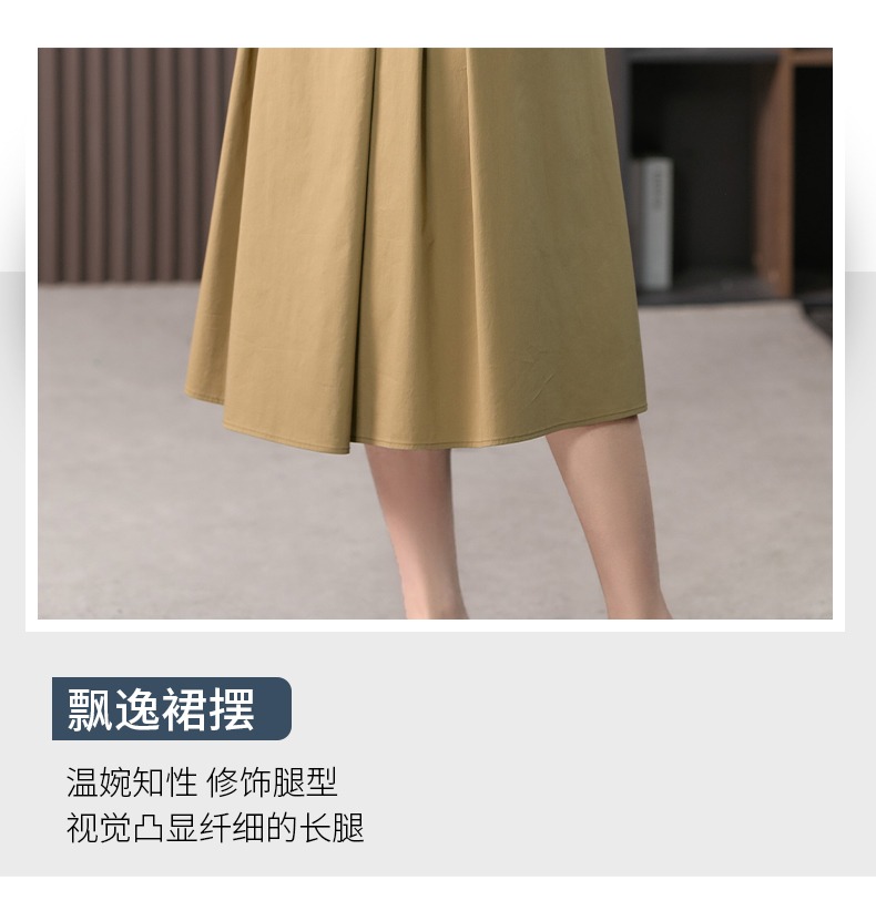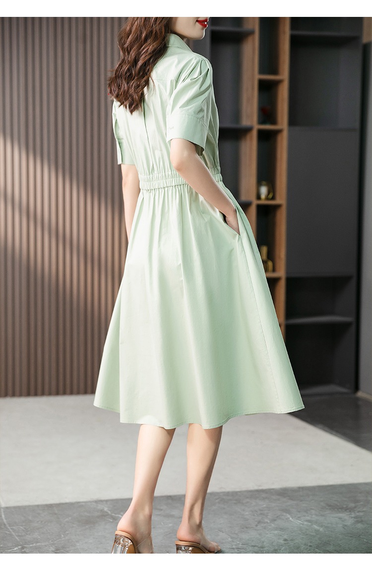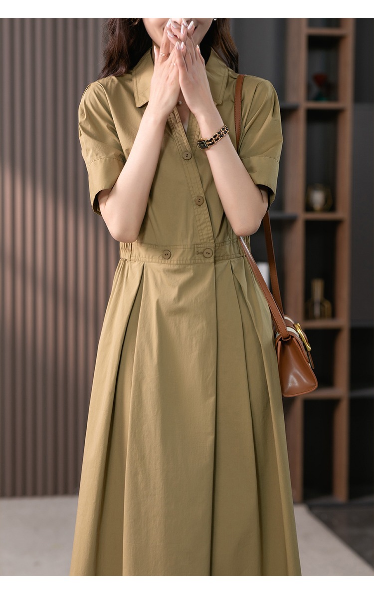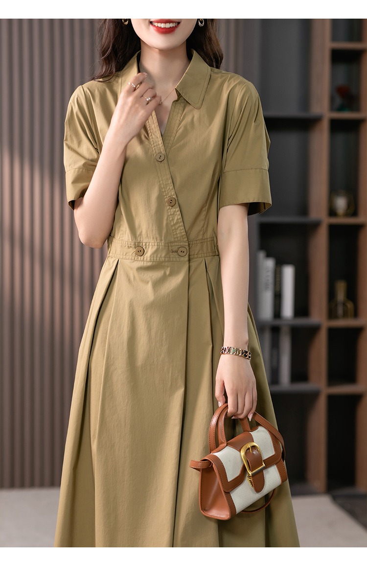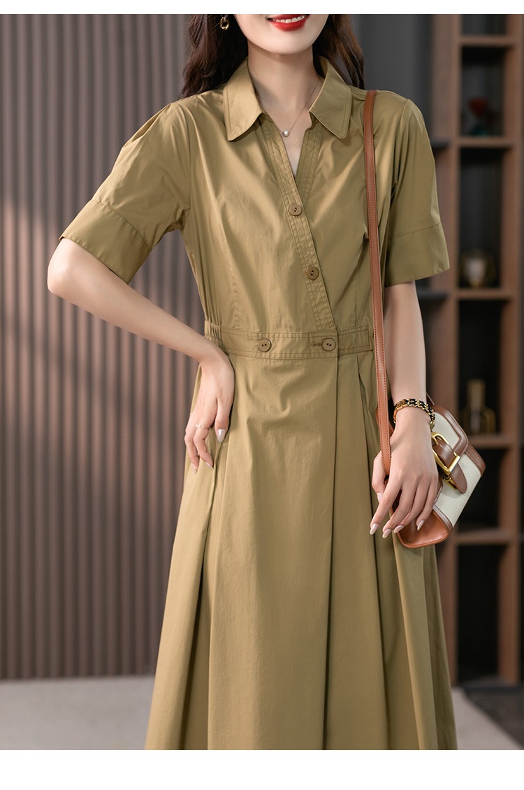YX【现货7天】高级感V领连衣裙女中长款2024夏季新款韩版高腰显瘦衬衫长裙