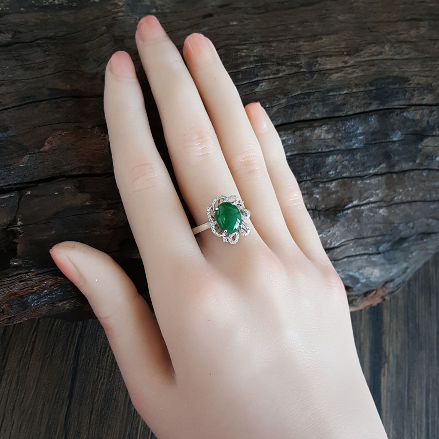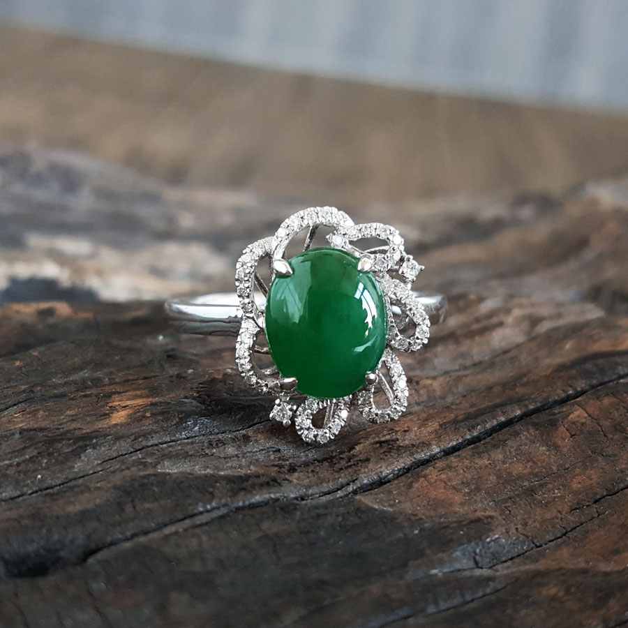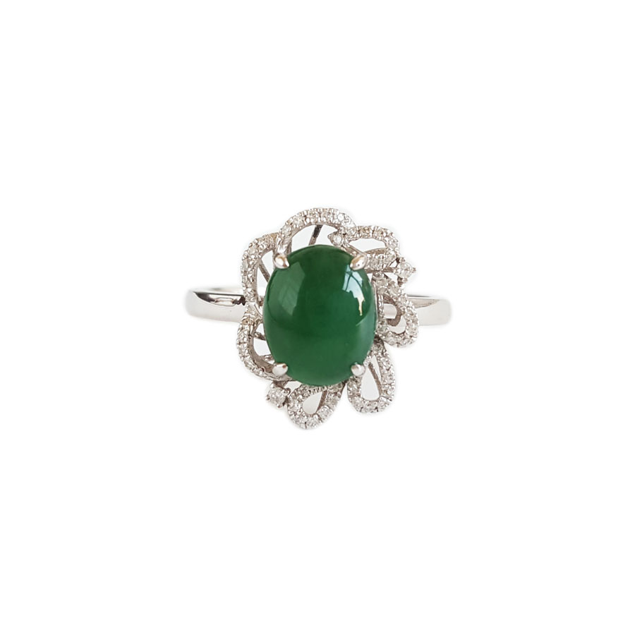 名称 | AU750精品白金镶天然糯冰种满绿蛋面翡翠戒指 |