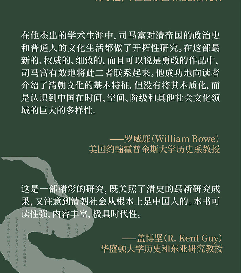 当我们在讲“ 世界上没有完全相同的两片树叶 ”这句话时,是否能够想到,两片看起来形状、颜色、大小都不同的树叶,之所以都被称为树叶,是其作为物质的本质属性大体相同。将这样的思维视角放入历史长河中,同一片土地上的人性人心、深层次的文化基因、社会心理,也具有相当强韧的延续性。为今天的读者讲述清朝人的文化传统与生活方式,让我们通过了解古人而了解自己,是本书的重要价值。——郑小悠,中国国家图书馆副研究员在他杰出的学术生涯中,司马富对清帝国的政治史和普通人的文化生活都做了开拓性研究。在这部的、权威的、细致的,而且可以说是勇敢的作品中,司马富有效地将此二者联系起来。他成功地向读者介绍了清朝文化的基本特征,但没有将其本质化,而是认识到中国在时间、空间、阶级和其他社会文化领域的巨大的多样性。——罗威廉(William Rowe),美国约翰霍普金斯大学历史系教授这是一部精彩的研究,既关照了清史的研究成果,又注意到清朝社会从根本上是中国人的。本书可读性强,内容丰富,极具时代性。——盖博坚(R. Kent Guy),华盛顿大学历史和东亚研究教授