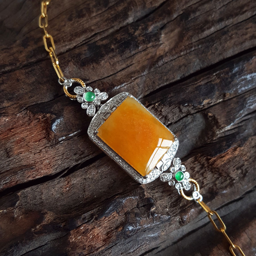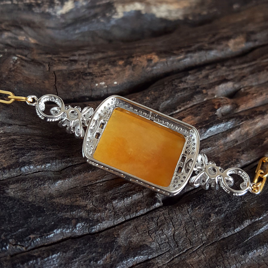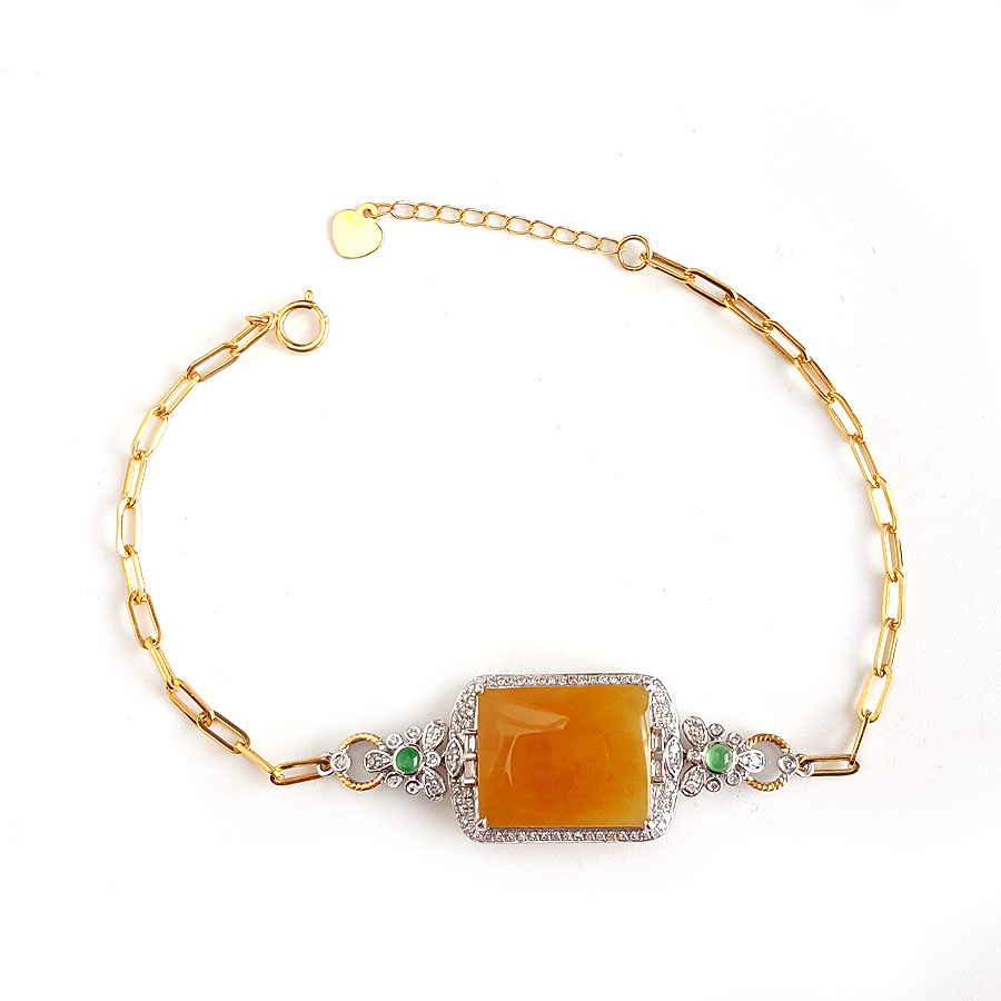 名称 | AU750双色金豪镶钻镶天然细腻糯种平安无事牌黄翡手链 |