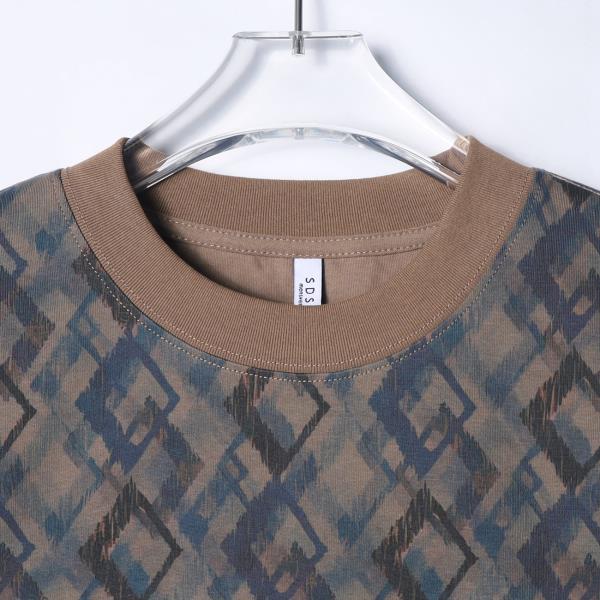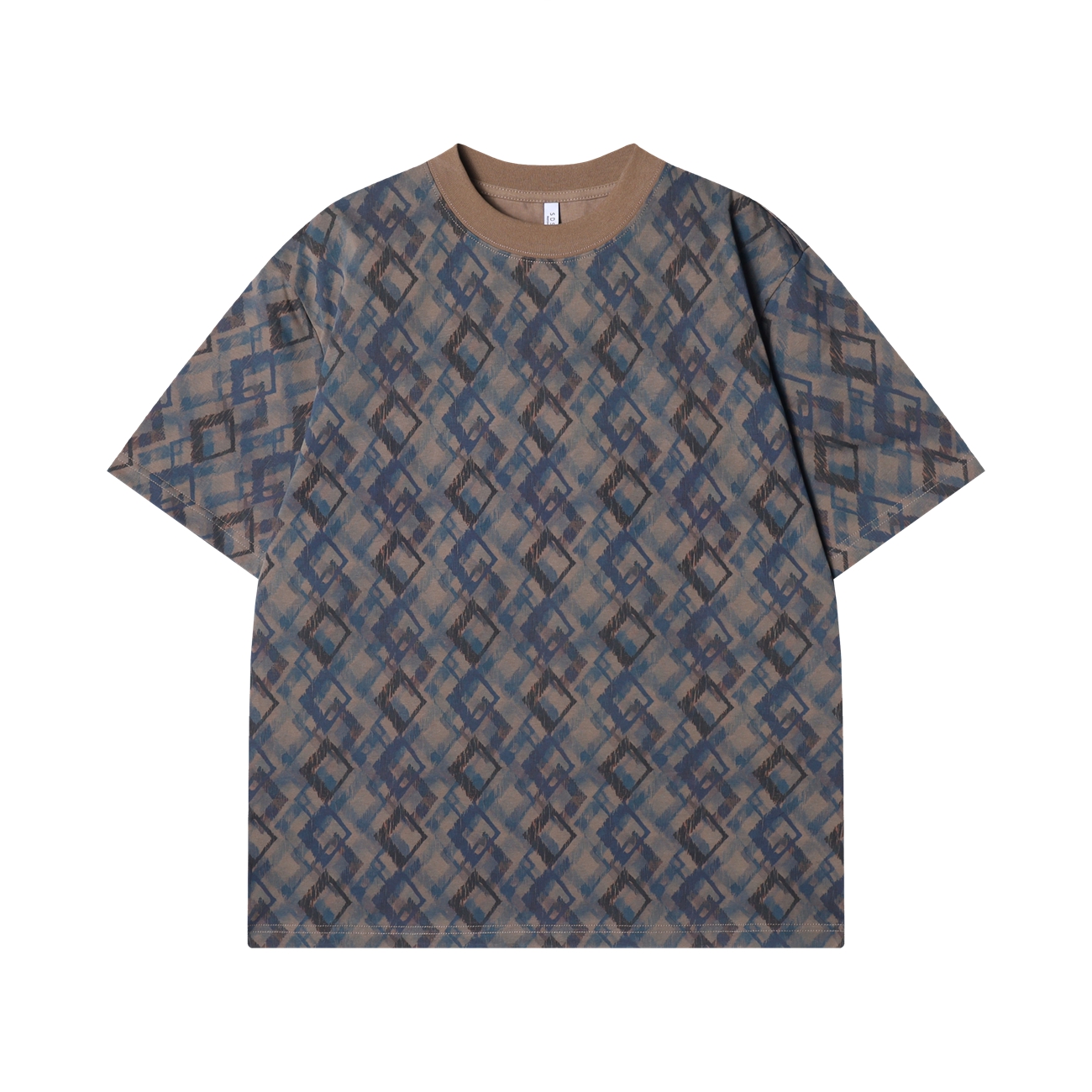夏季高级感新款美式撞色菱形圆领短袖T恤复古宽松男士套头上衣