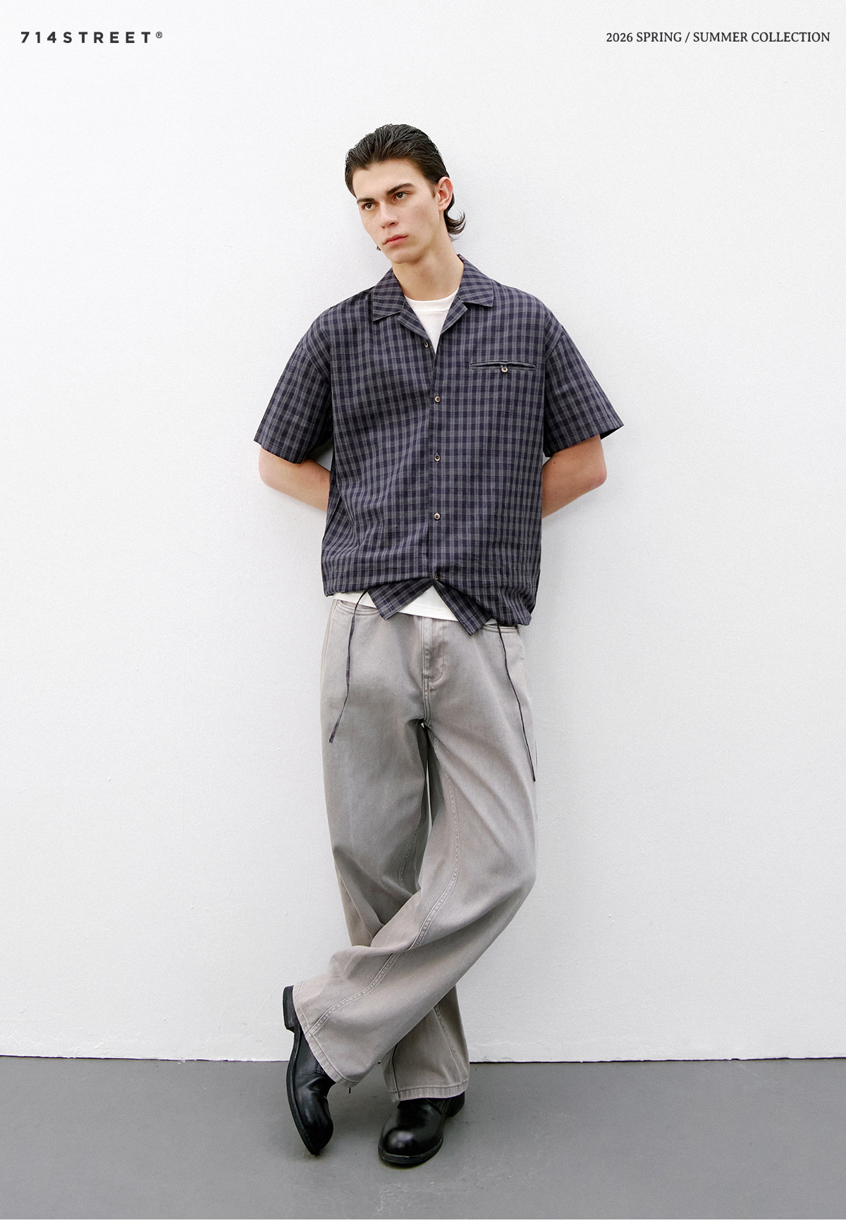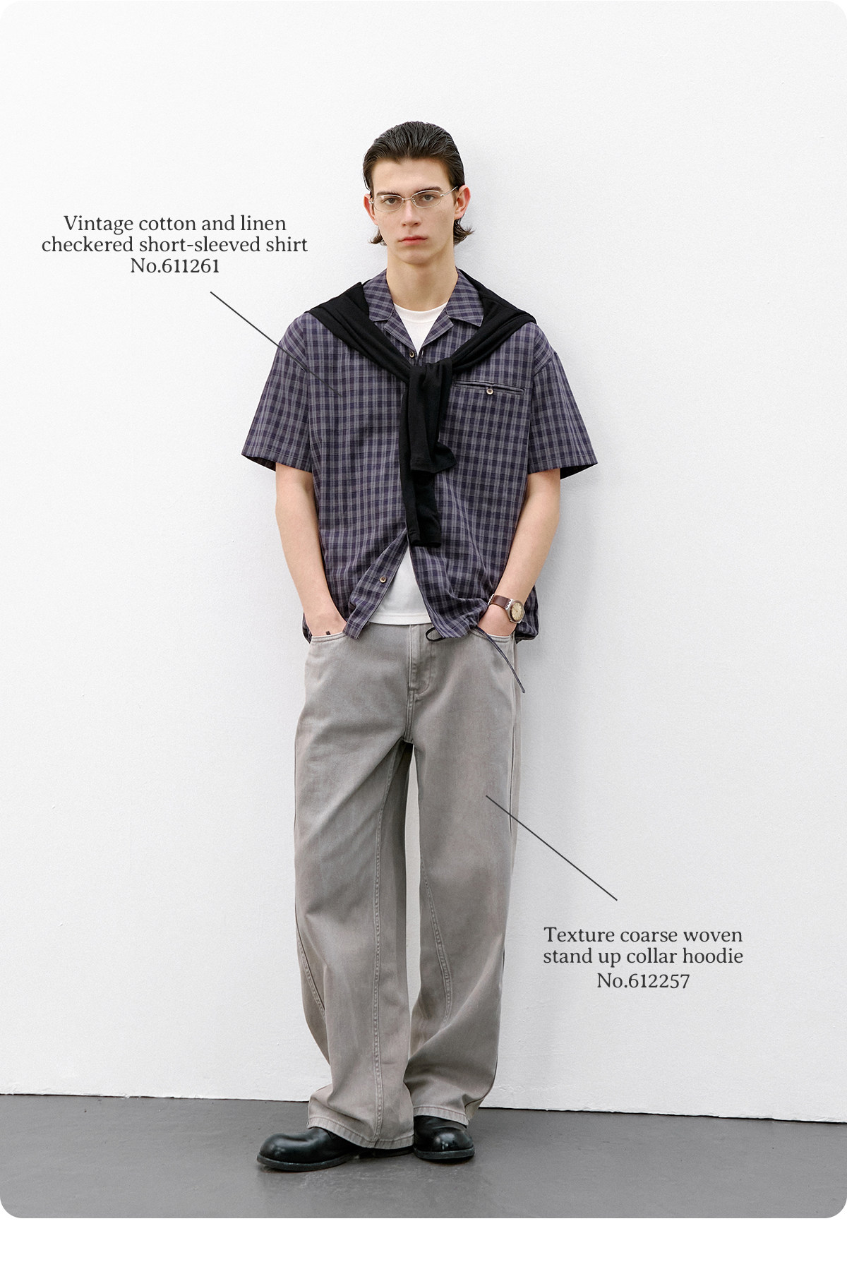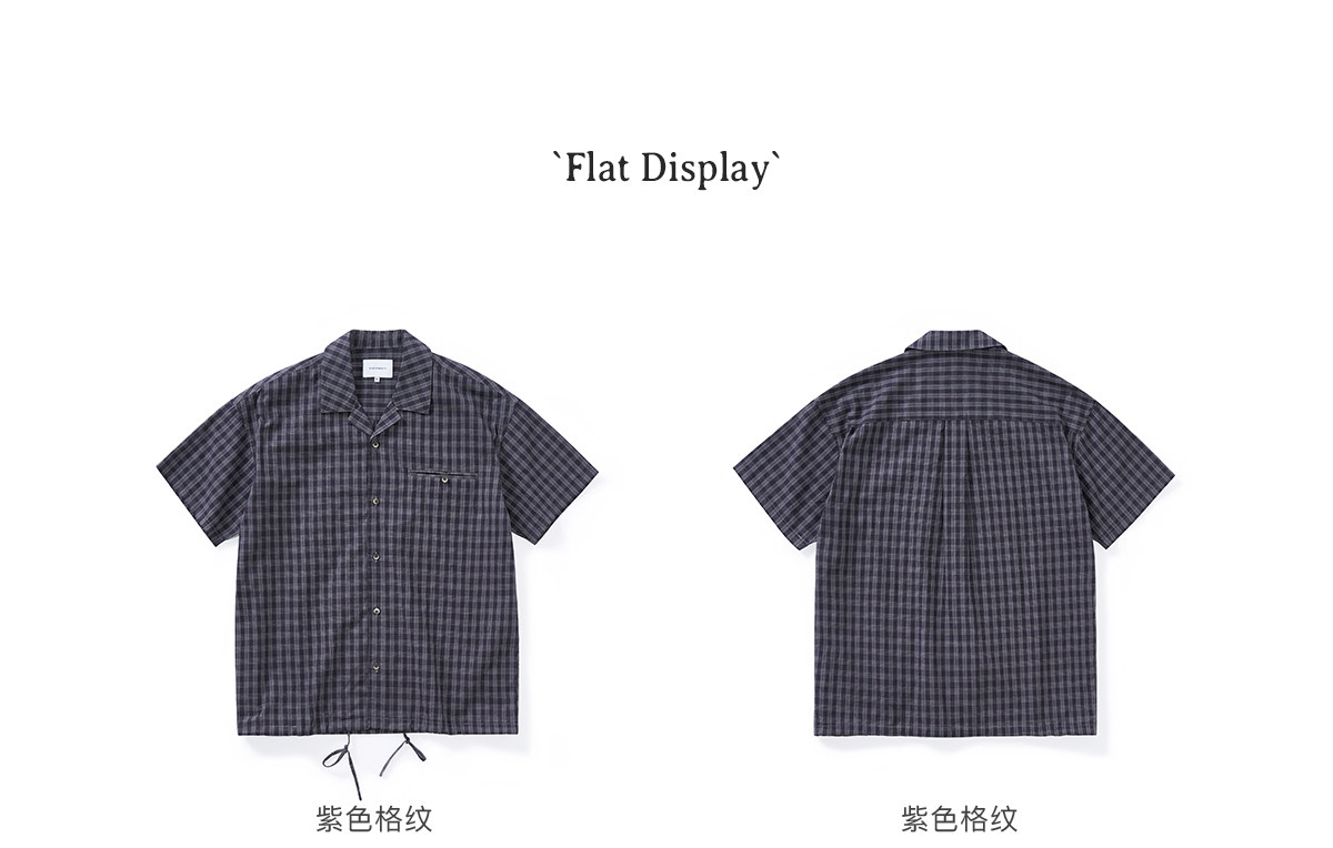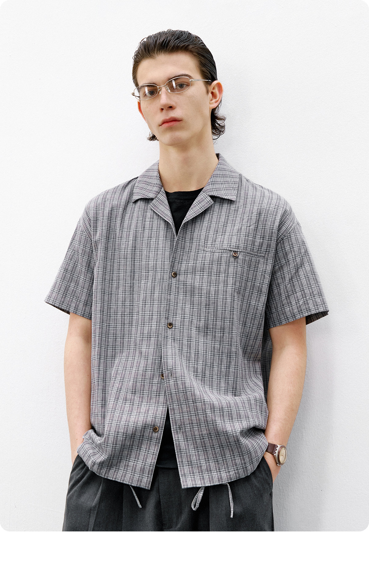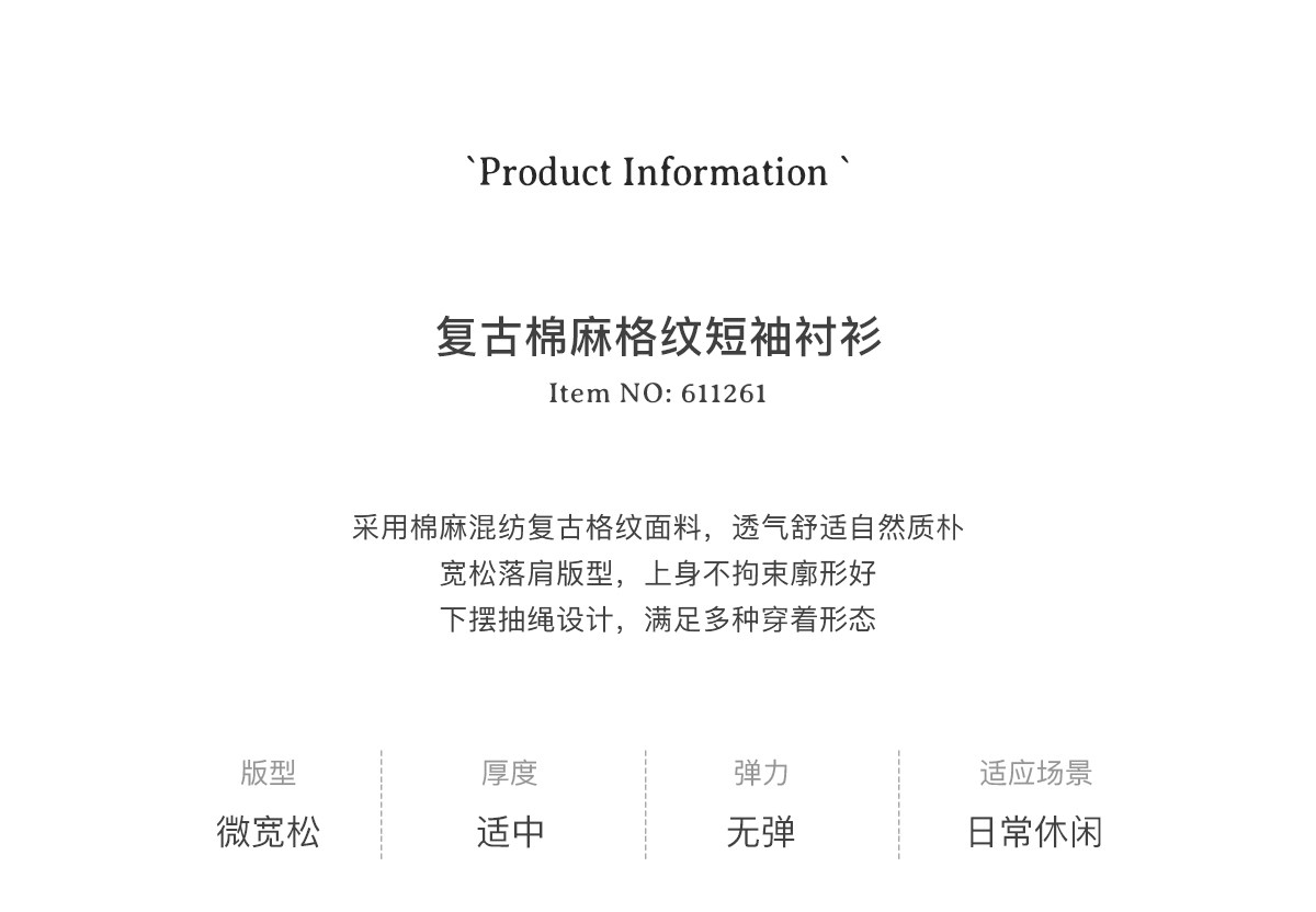 714street复古亚麻格子衬衫男2026夏季潮牌宽松落肩棉麻短袖衬衣