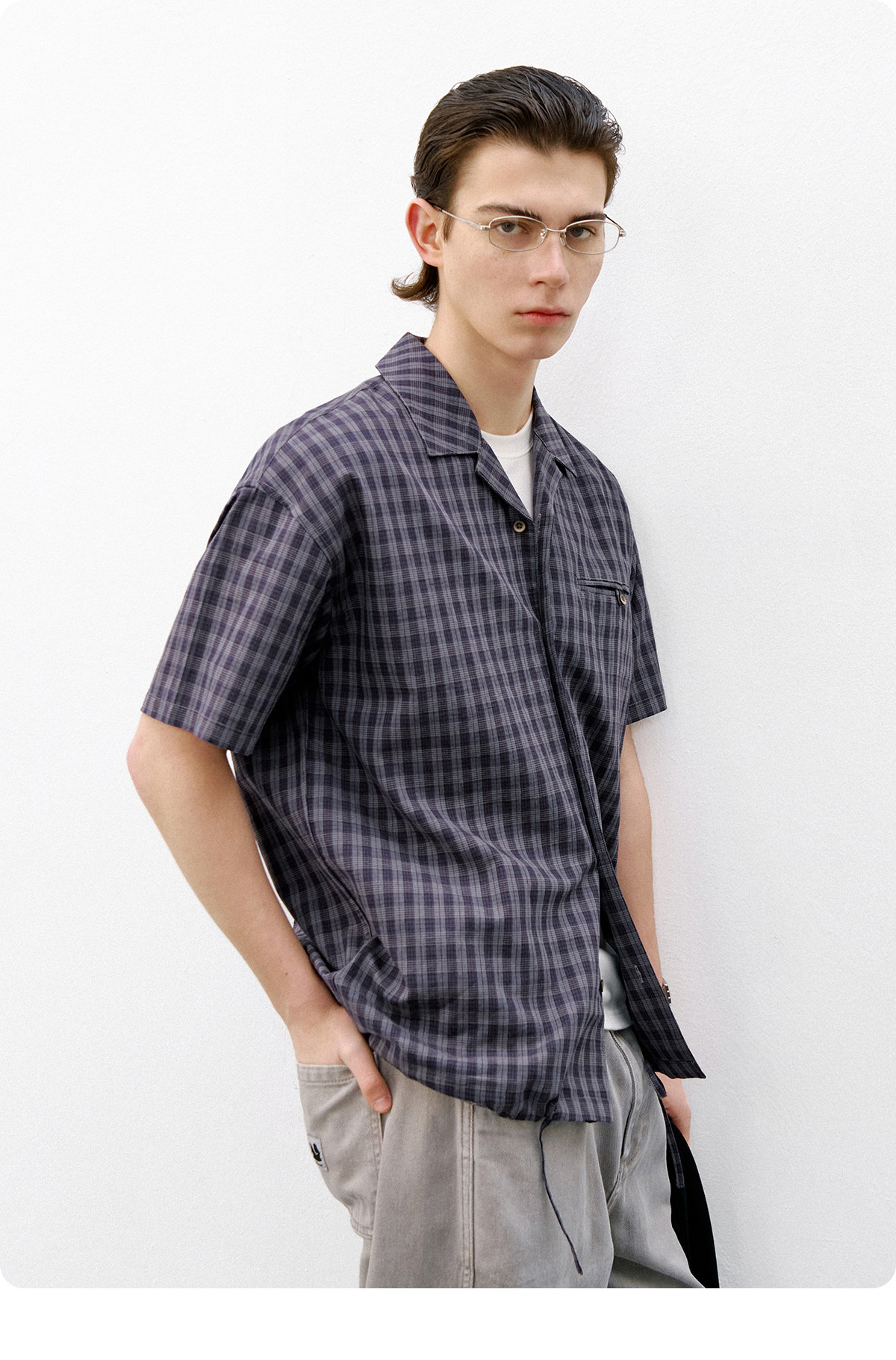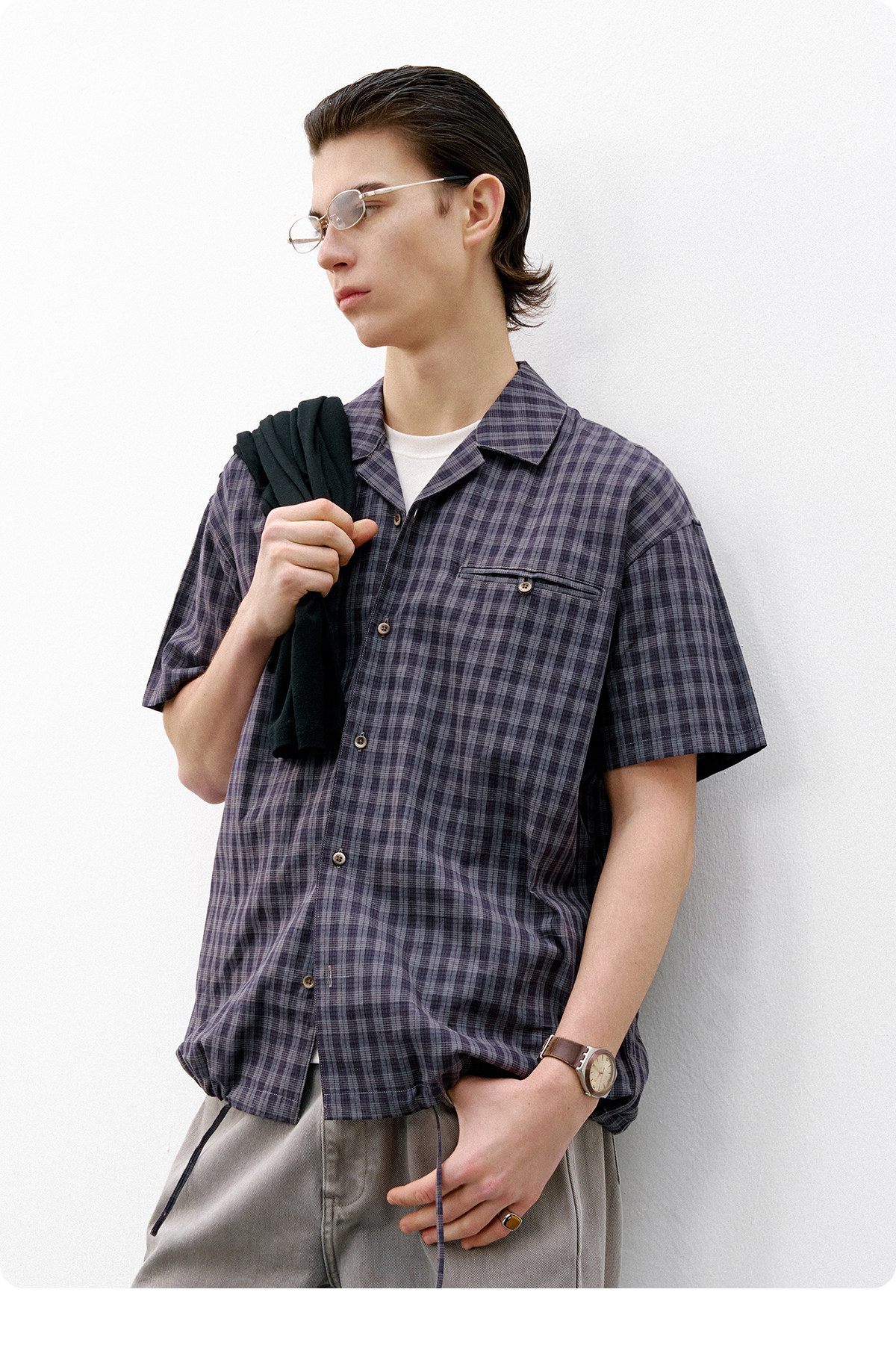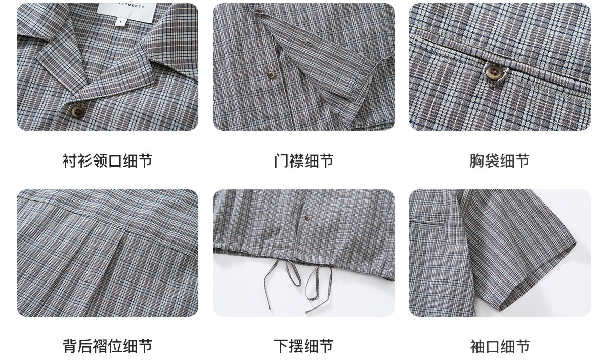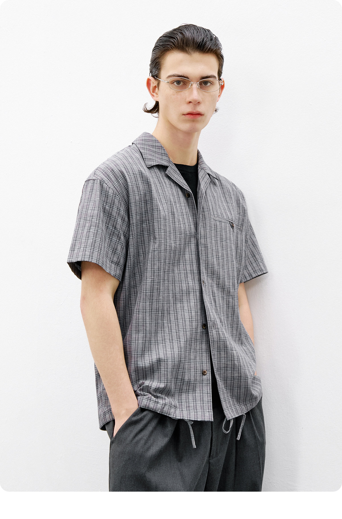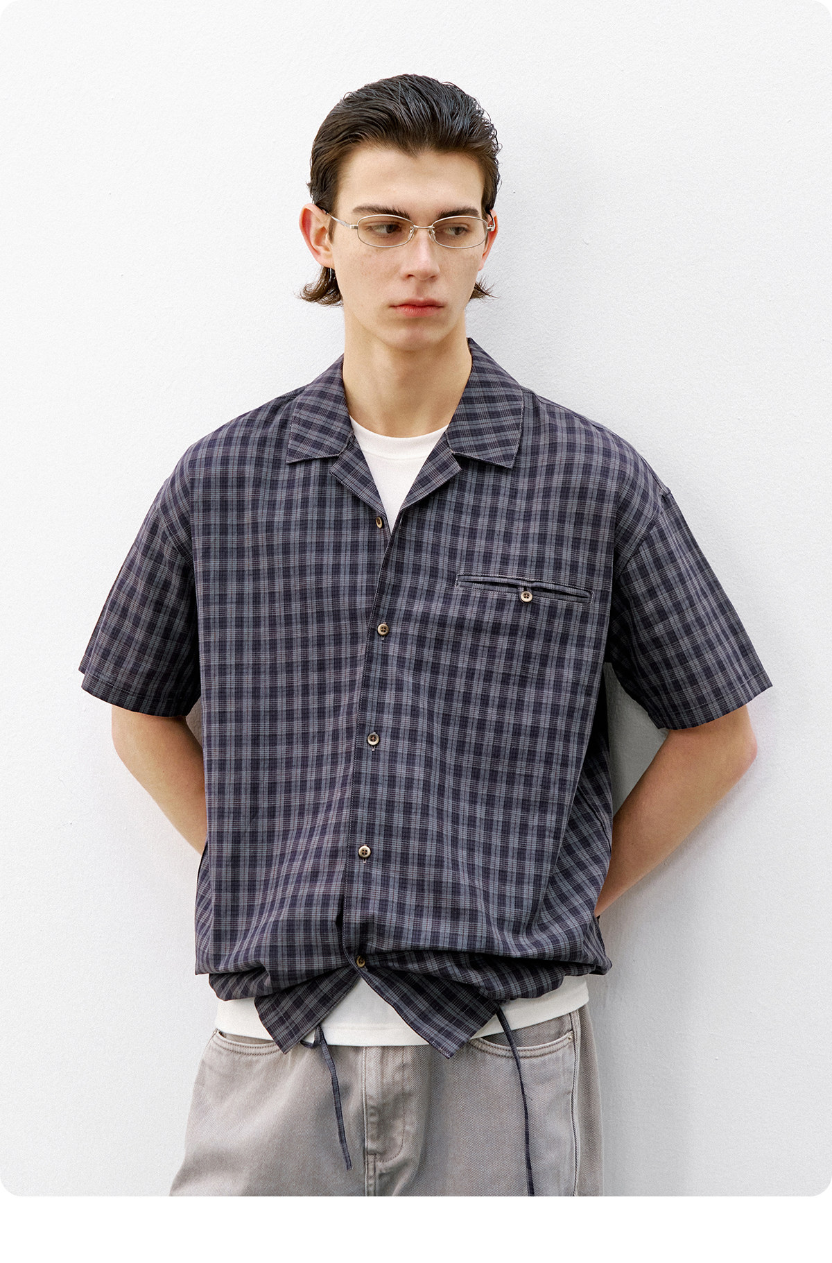 714street复古亚麻格子衬衫男2026夏季潮牌宽松落肩棉麻短袖衬衣