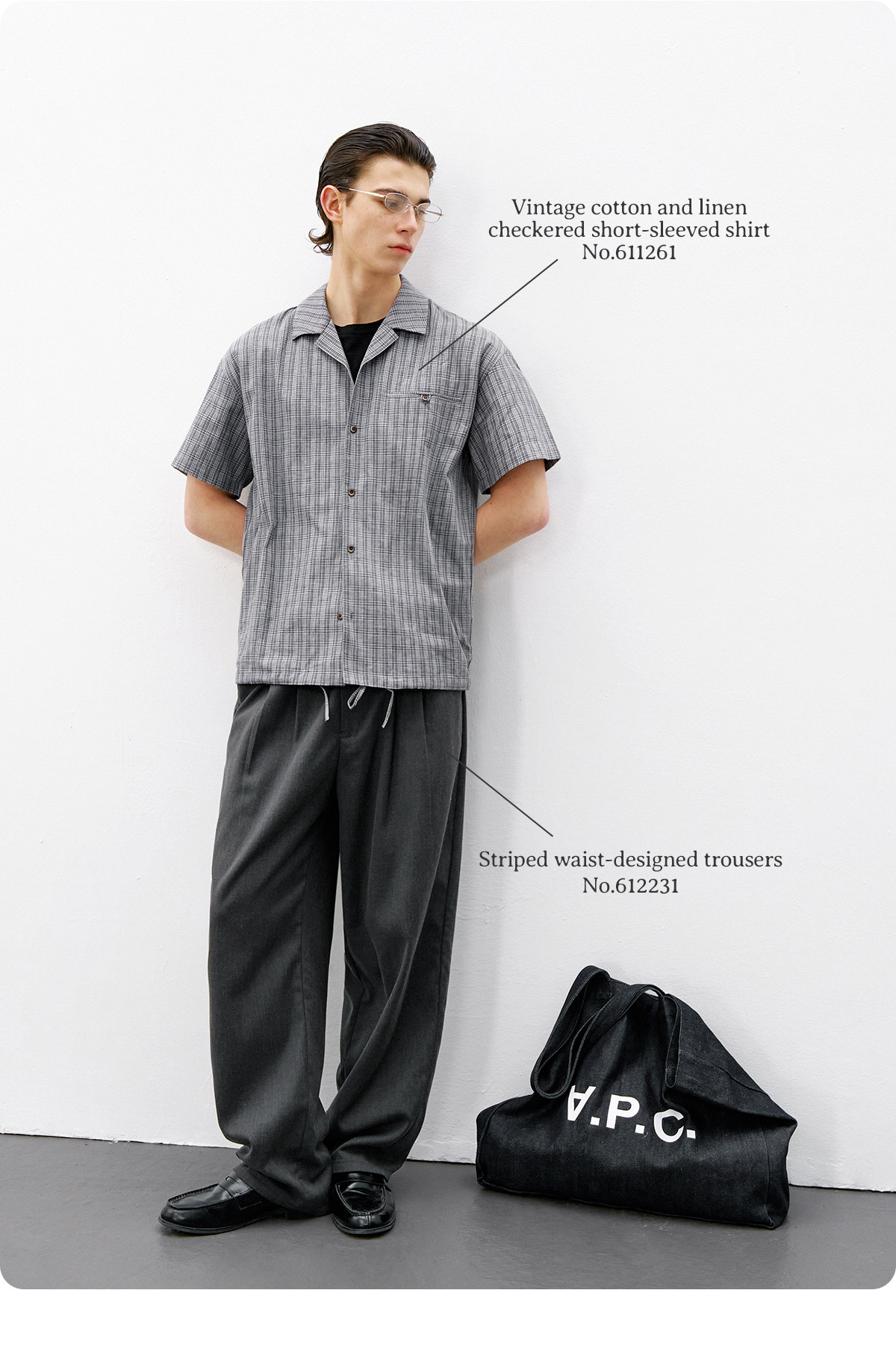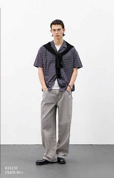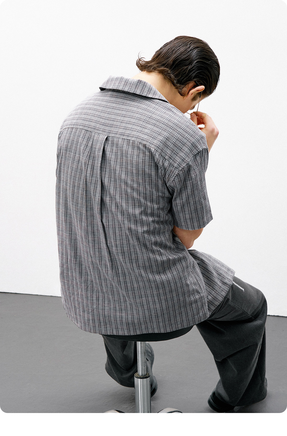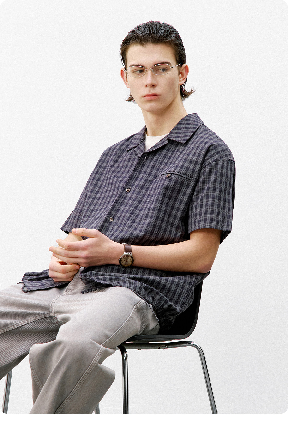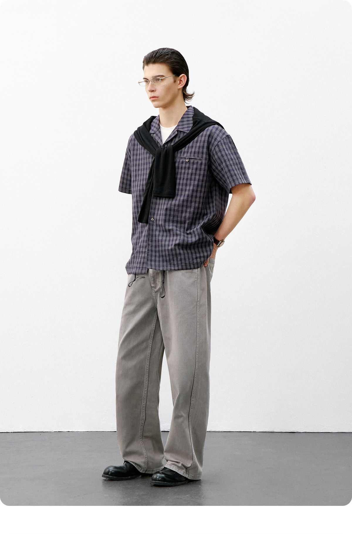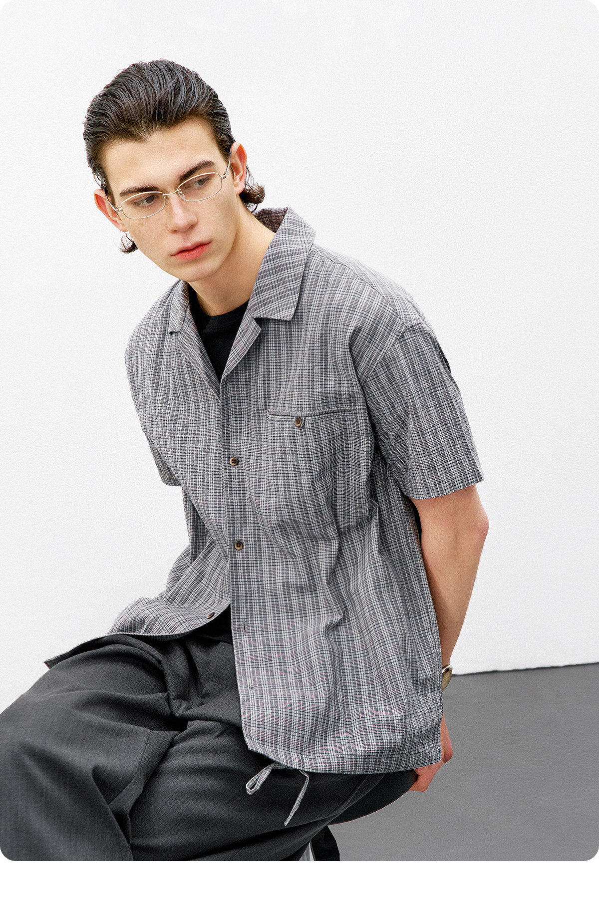 714street复古亚麻格子衬衫男2026夏季潮牌宽松落肩棉麻短袖衬衣