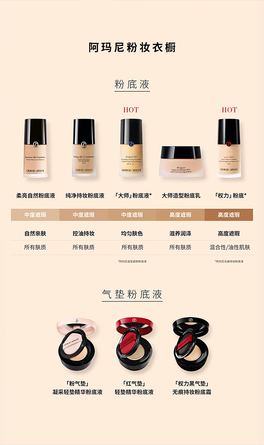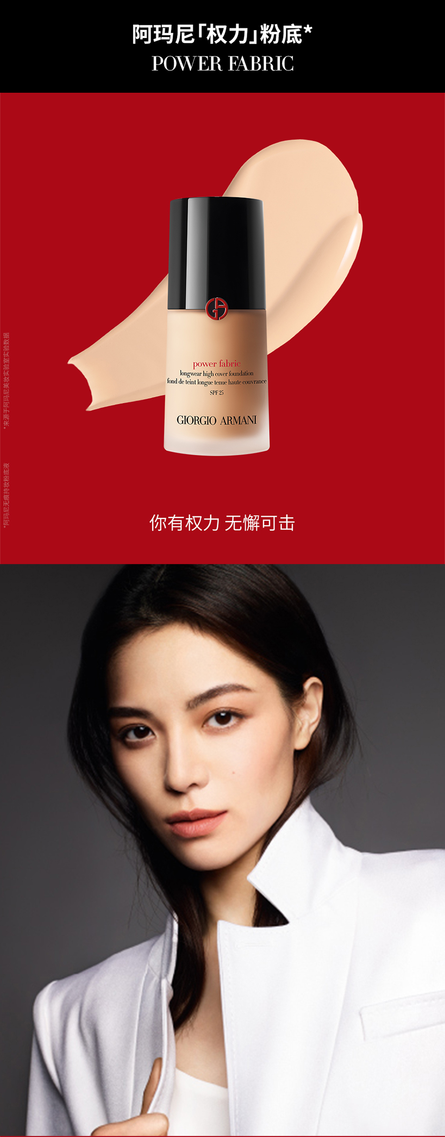 GIORGIO ARMANI创制全新Power Fabric持久零瑕粉底液,集持久遮瑕与轻盈透亮效果于一身,塑造完美肤色,恍如第二层肌肤般均匀剔透,无论任何情况下依然亮丽无瑕。power fabric经悉心研制,采用崭新技术,细致遮盖瑕疵,营造均匀剔透肤色,不着痕迹。无重质感修饰肌肤之余,塑造哑致持久一整天