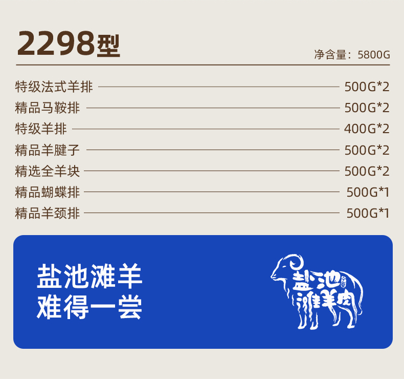 | 鹏程万里2298型 | 特级法式羊排 500*2 精品马鞍排 500*2 特级羊排 400*2 精品羊腱子 500*2 精选全羊块 500*2 精品蝴蝶排 500*1 精品羊颈排 500*1 |