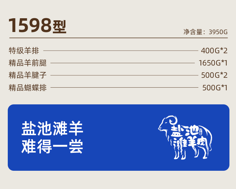 | 龙凤呈祥1598型 | 特级羊排 400g*2 精品羊前腿 1650g*1 精品羊腱子 500g*2 精品蝴蝶排 500g*1 |