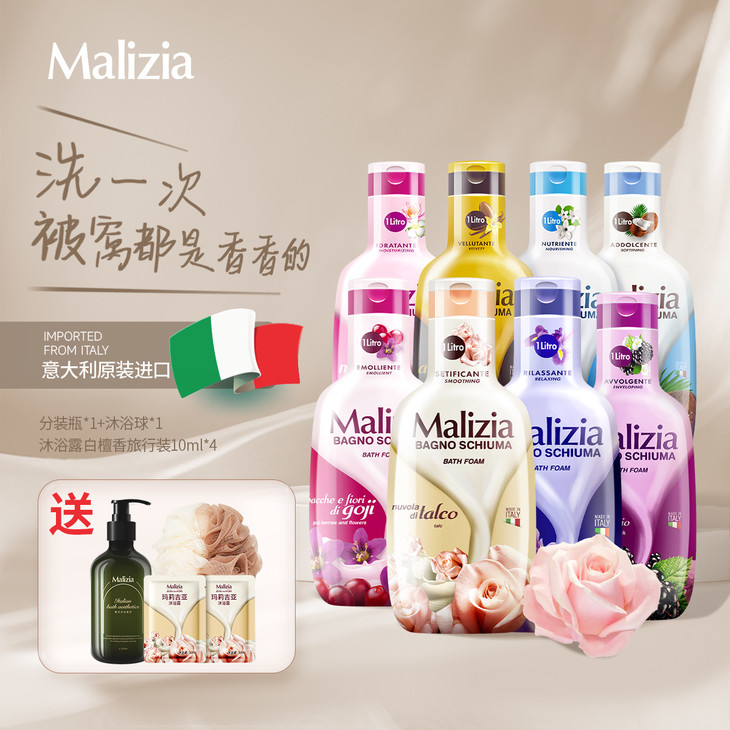 [屁侠推荐]意大利Malizia/玛莉吉亚 香氛沐浴露 持久留香 植萃滋润美肌 多种香型 1000ml家庭装 (买2瓶赠分装瓶+沐浴露小样10ml*2)