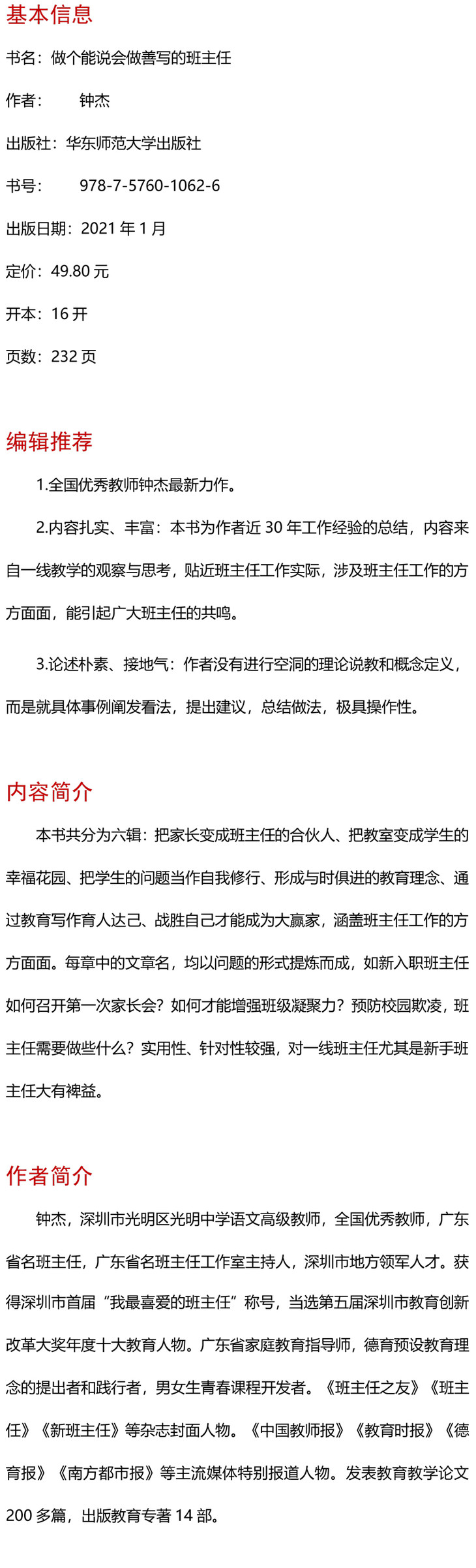一个班主任,要成为学生的“朋友”,而不是学生的“敌人”;一个班集体,要成为学生心中的“乐园”,而不是学生心中的“地狱”。如何做好班主任?来这里取经!本书精选86篇文章,多侧面多角度地呈现了班级管理的诸多话题,有问题有对策,有科学的方法也有无私的爱,专治班级管理的各种“疑难杂症”,是年轻班主任必不可少的“修炼”宝典。