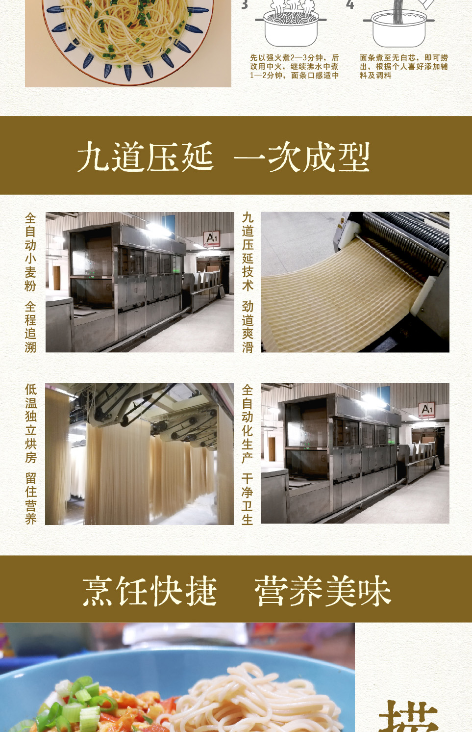 【食用方法】将适量水放入锅中煮沸,面条分散放入沸水中,用筷子搅拌,煮3-5分钟,面条煮至无白芯,口感适中即可捞出,根据个人喜好添加辅料及调料。