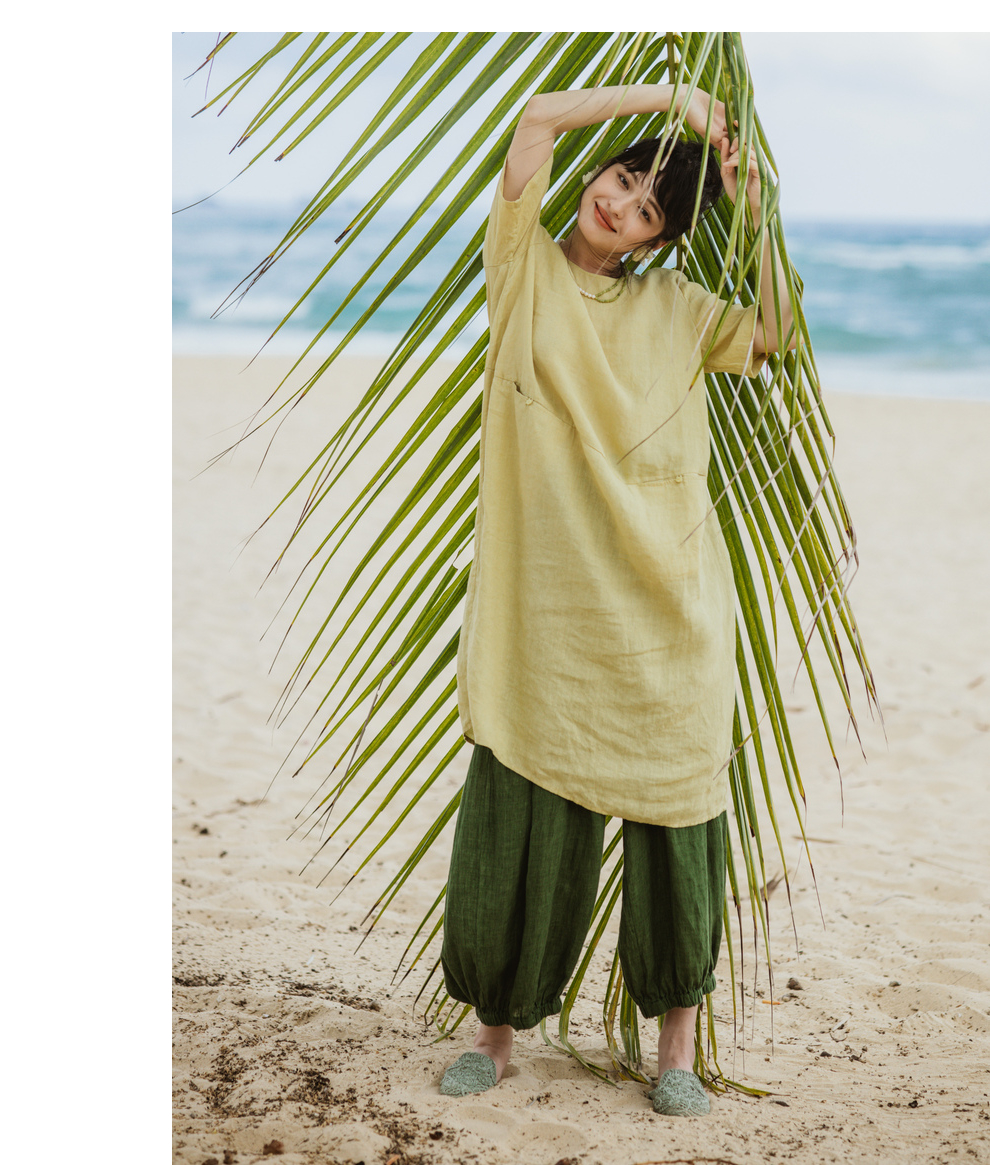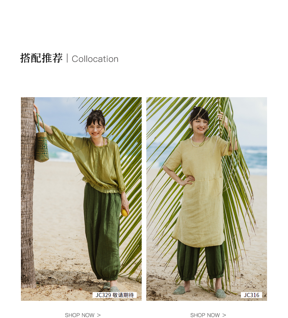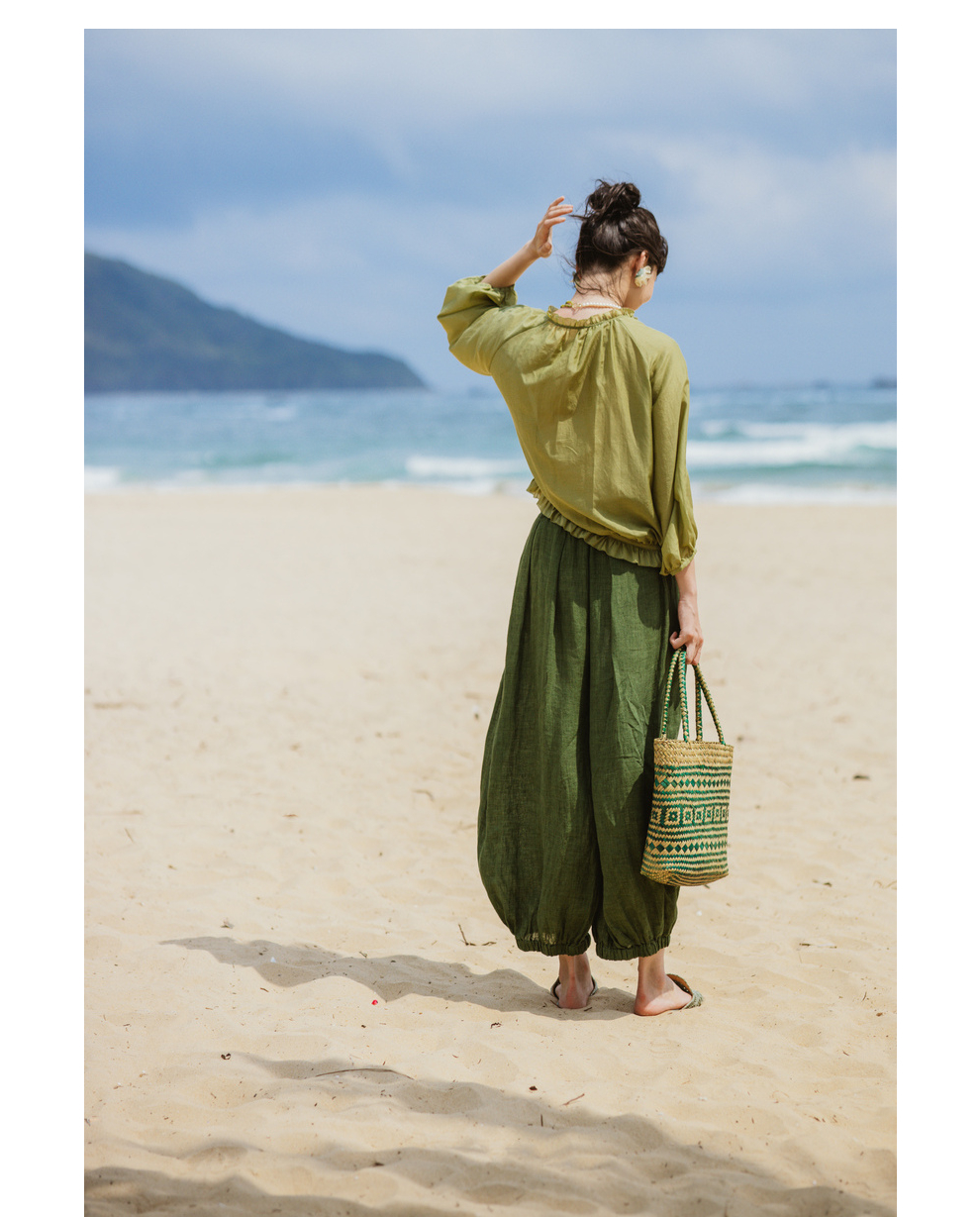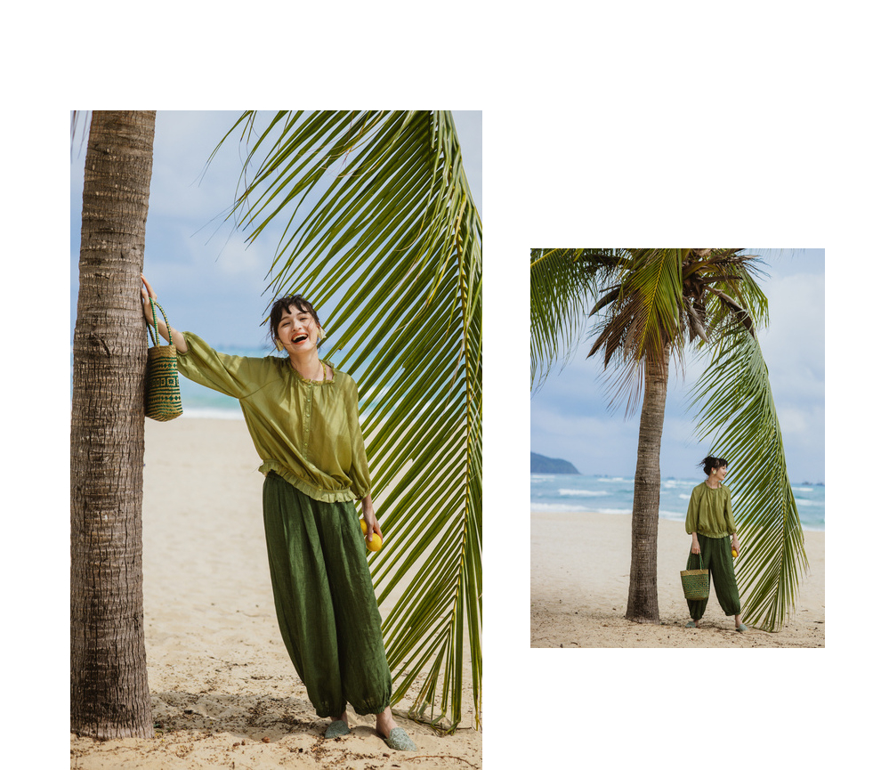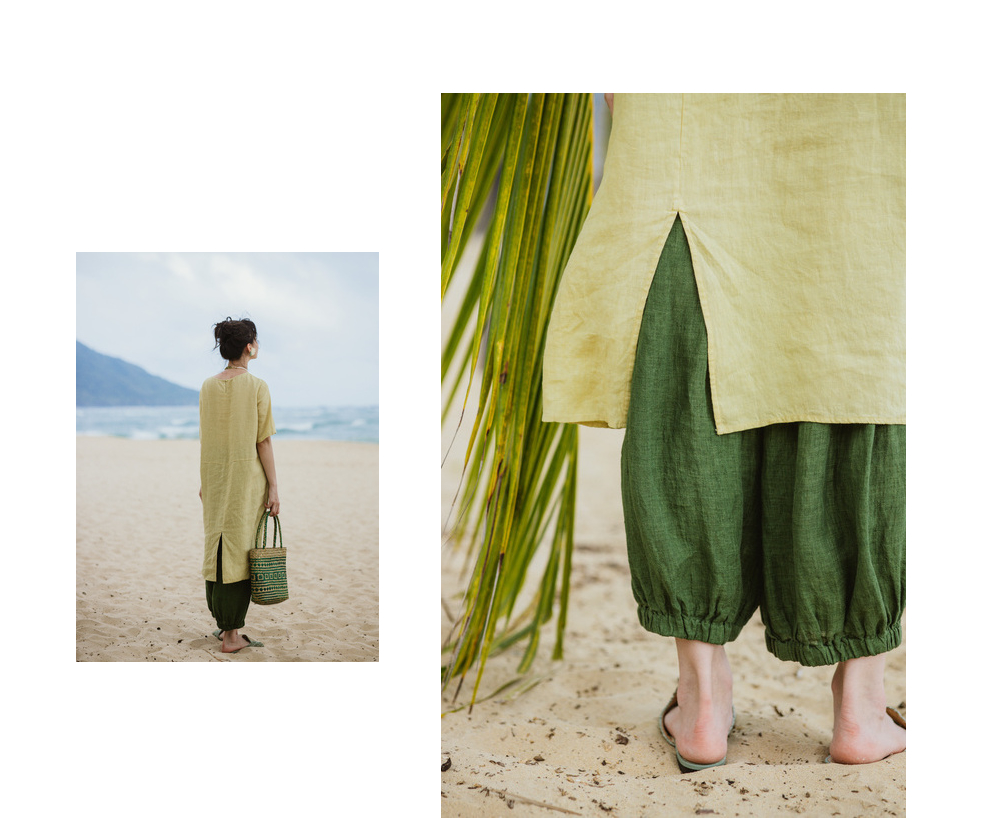 绽放旅行女装300朵/雨林绿色高支棉麻亚麻女高端套装长裤
