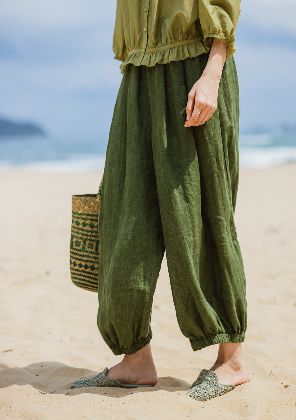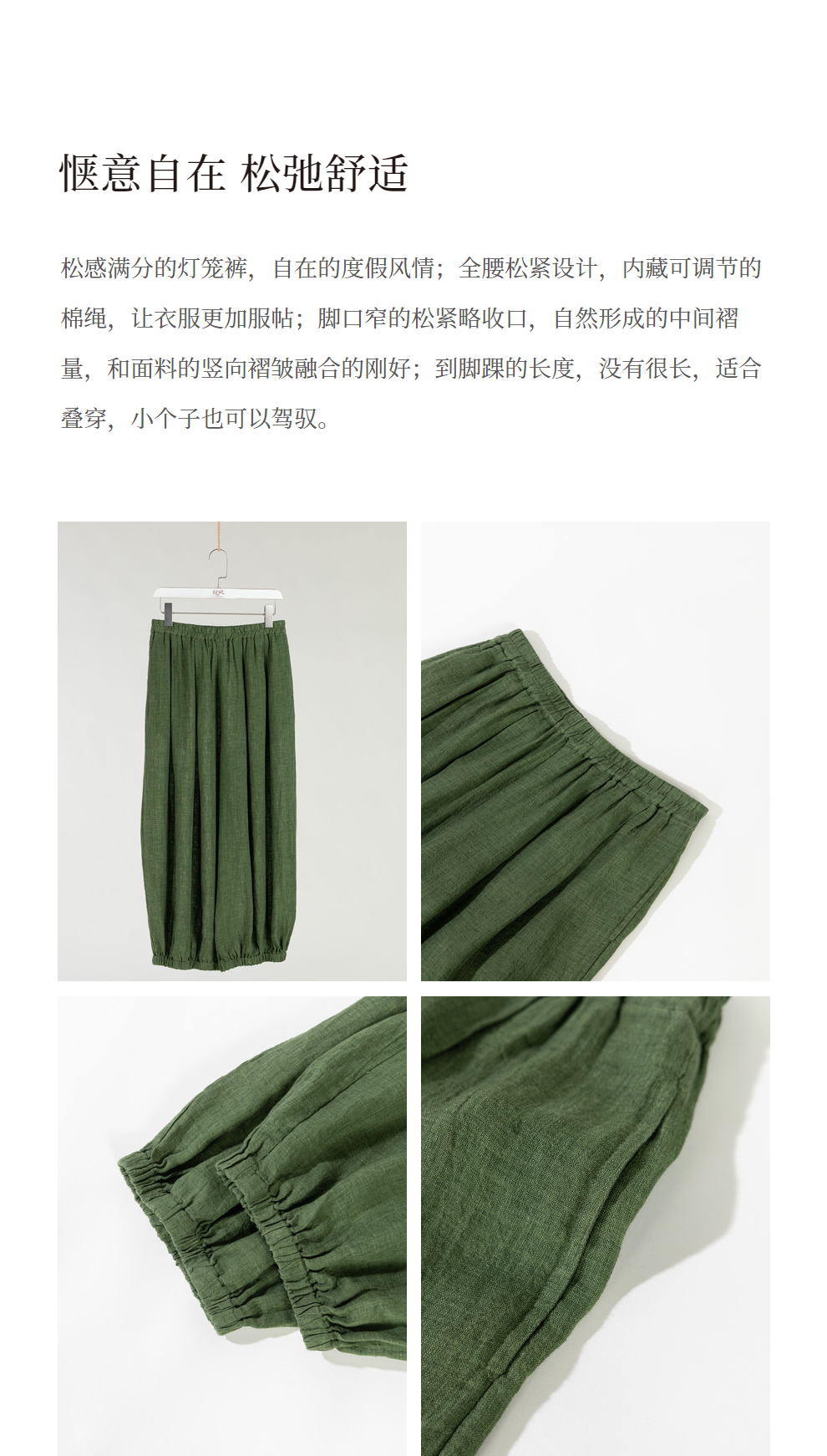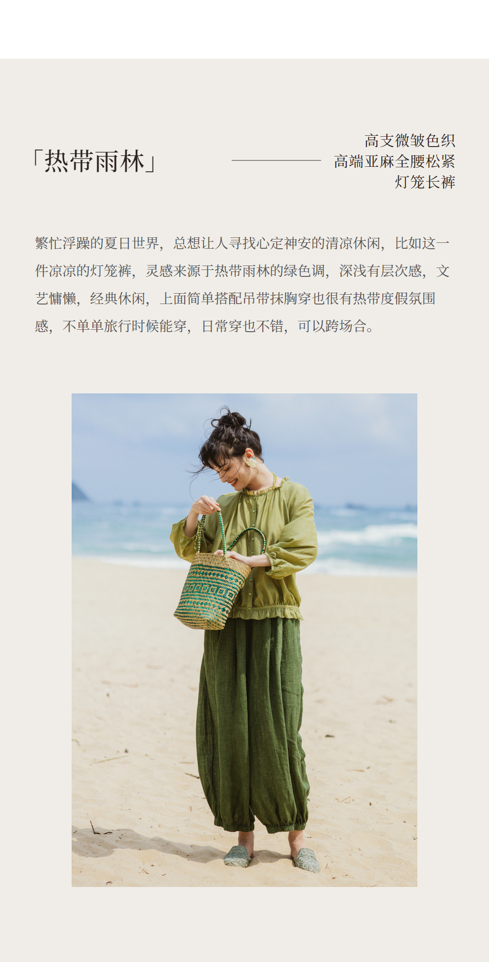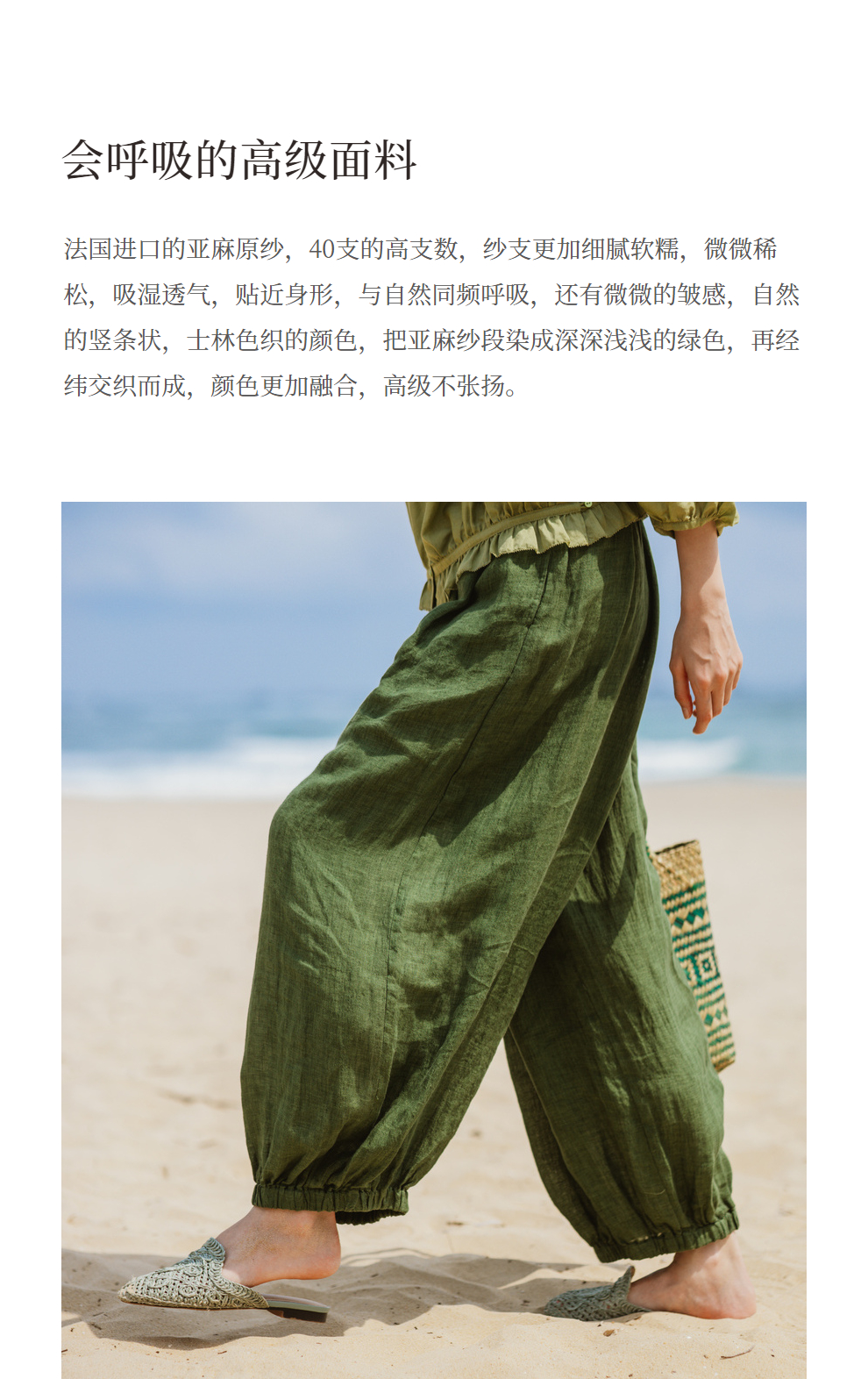 绽放旅行女装300朵/雨林绿色高支棉麻亚麻女高端套装长裤