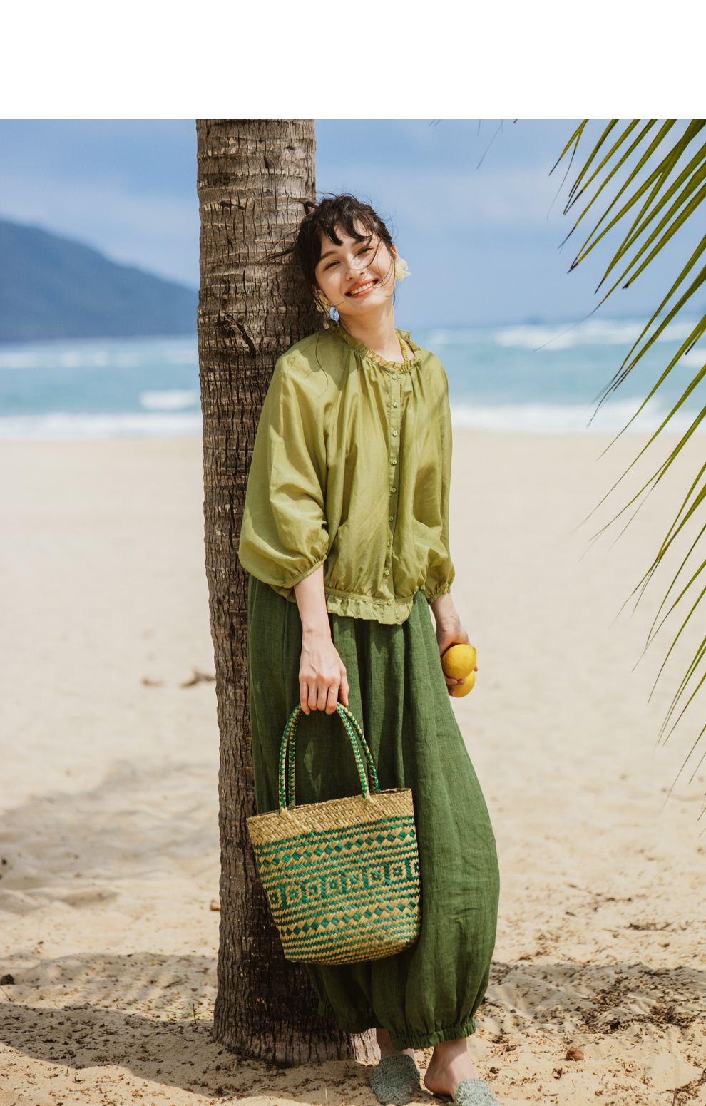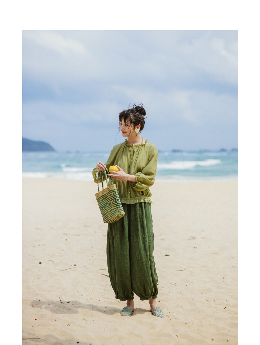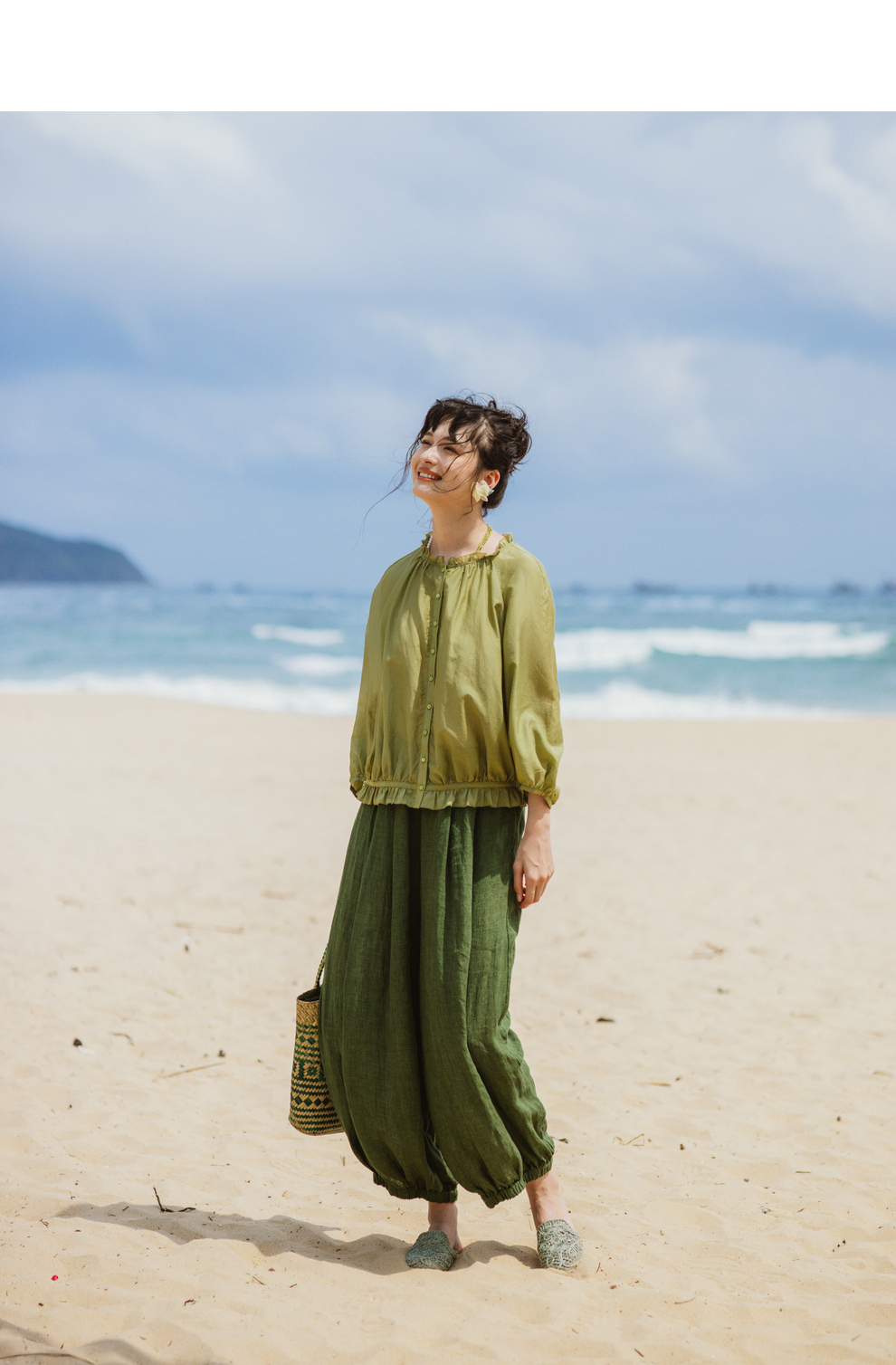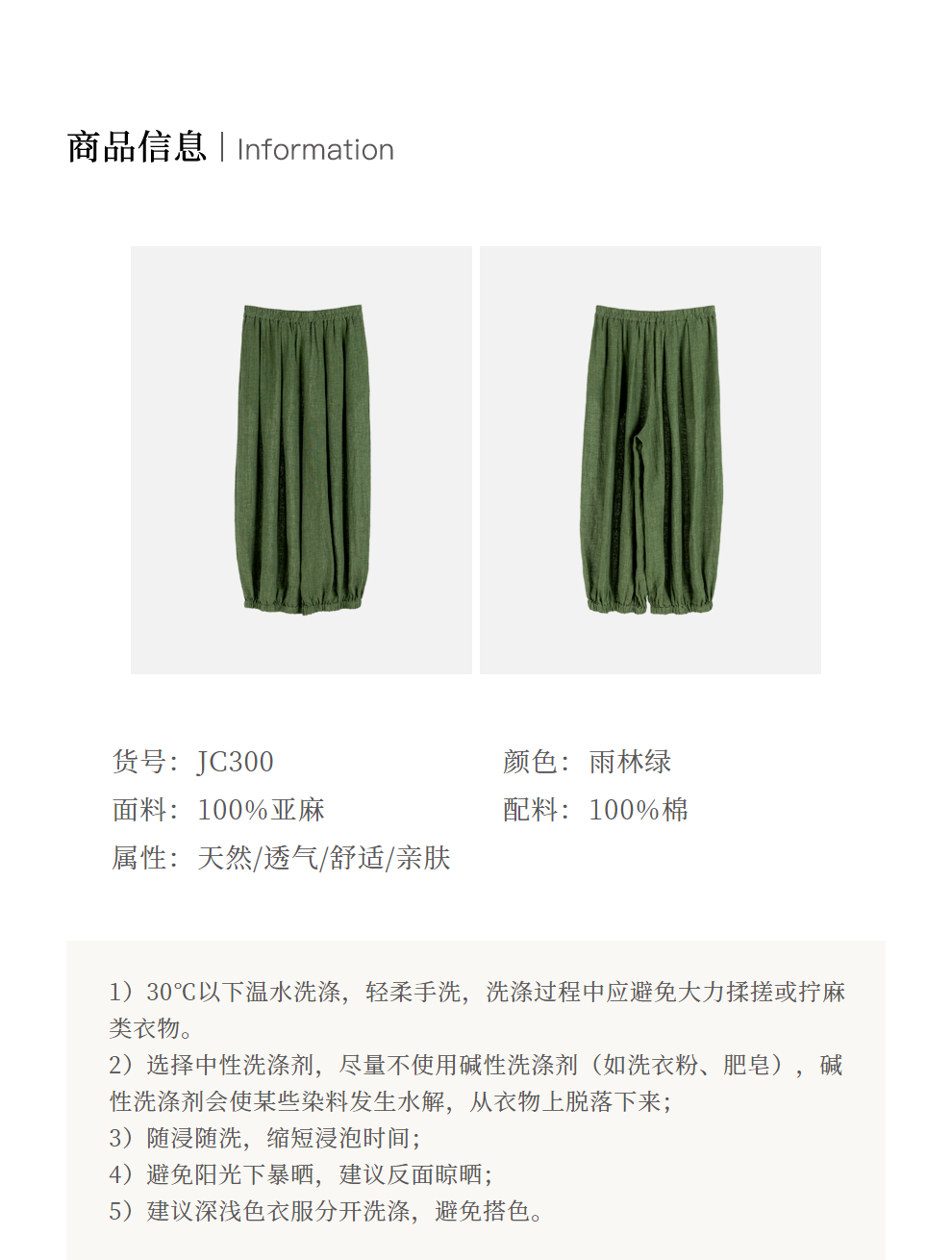 绽放旅行女装300朵/雨林绿色高支棉麻亚麻女高端套装长裤