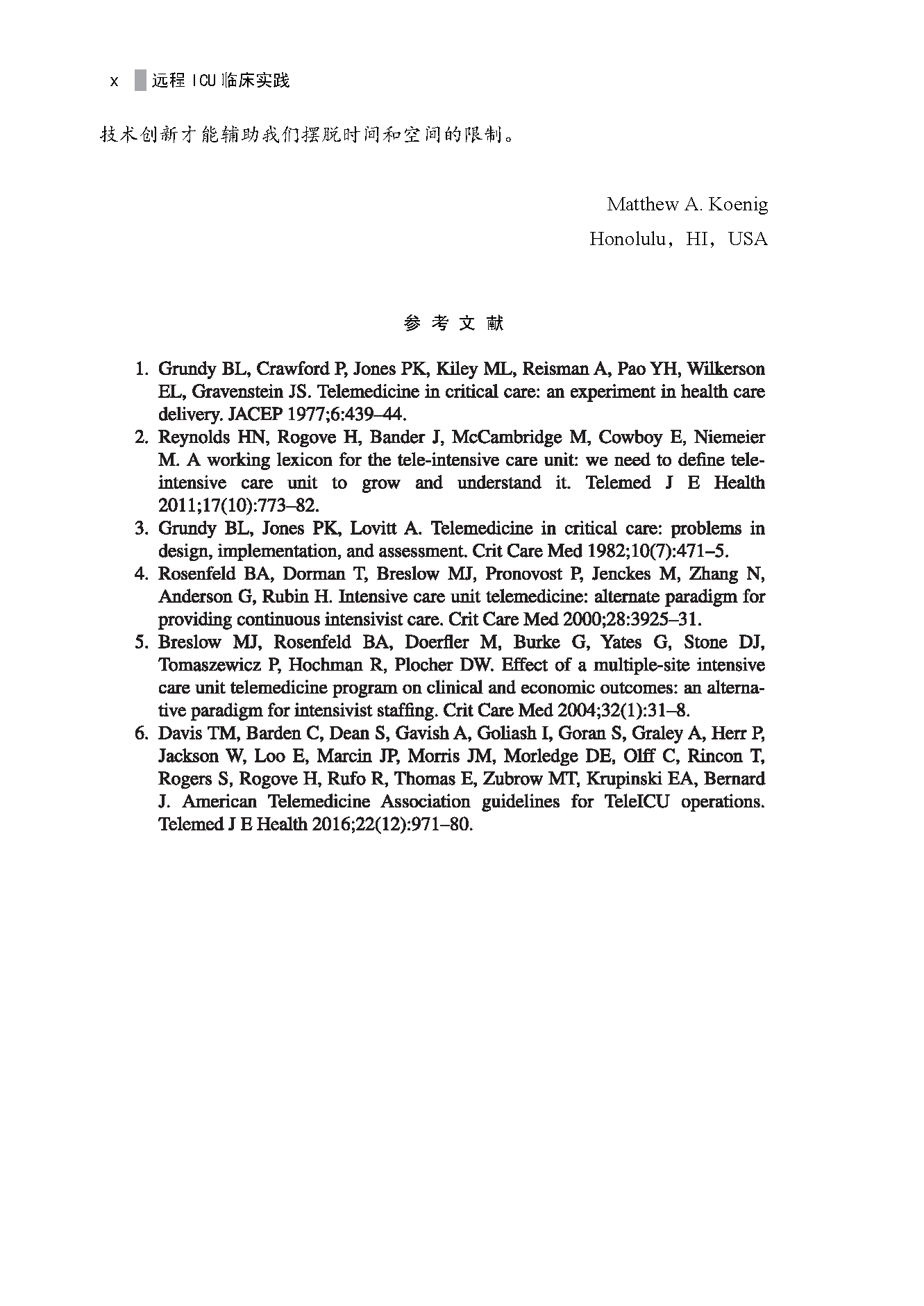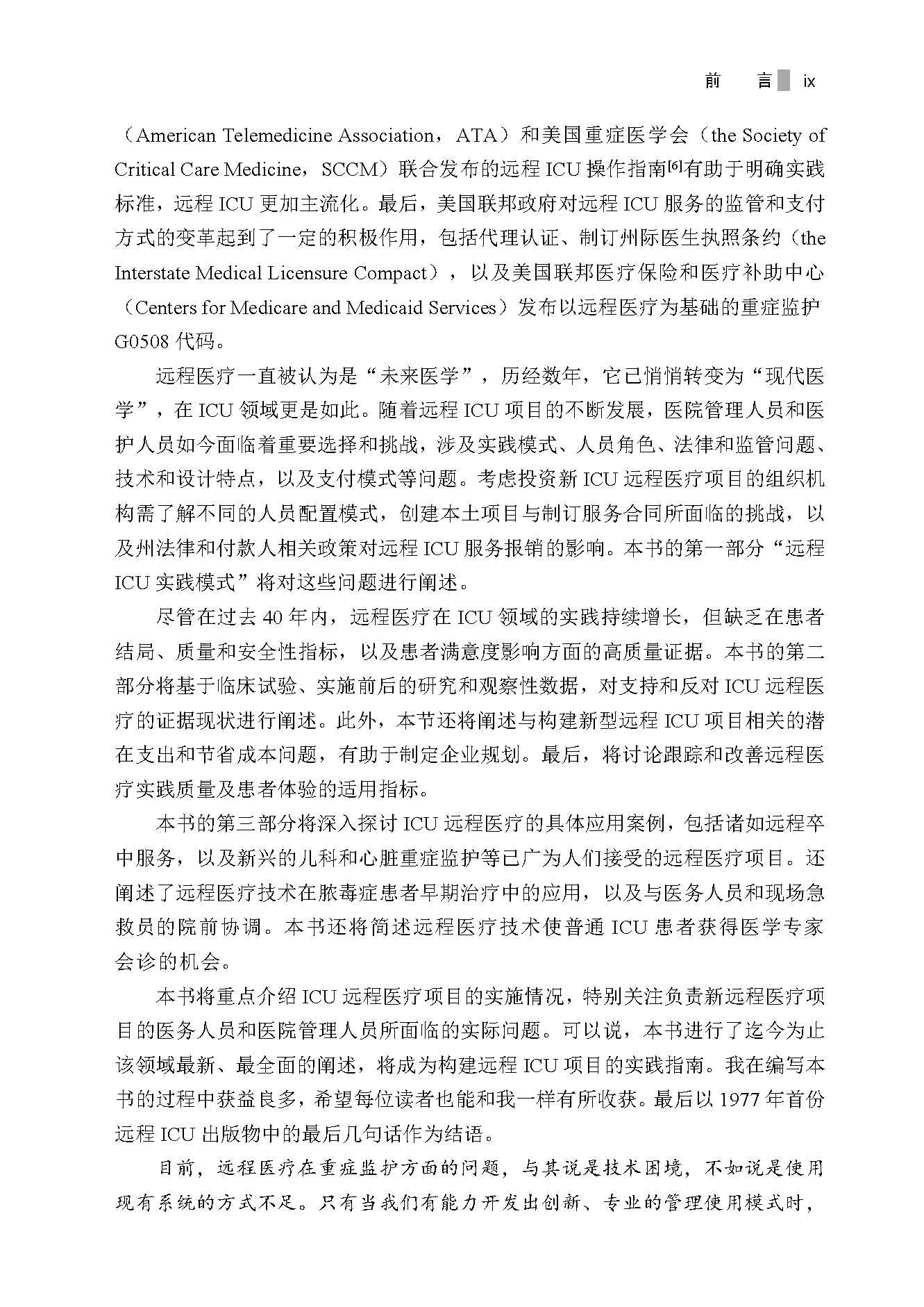 本书围绕远程ICU实践模式、质量和成果及临床应用三部分,对该领域进行全面系统的阐述,内容涵盖国外远程ICU的发展历史、技术特点、医疗保险、法律监管、安全性和质量指标、患者结局、构建新型远程ICU项目相关成本效益问题等,尤其深入探讨了远程ICU医疗的具体应用案例及项目实施情况,如远程卒中和神经重症监护、新兴的心脏和儿科重症监护、远程ICU在脓毒症患者早期治疗中的应用,以及医务人员和现场急救员的院前协调等。