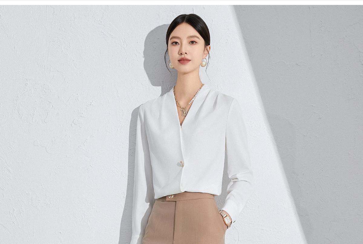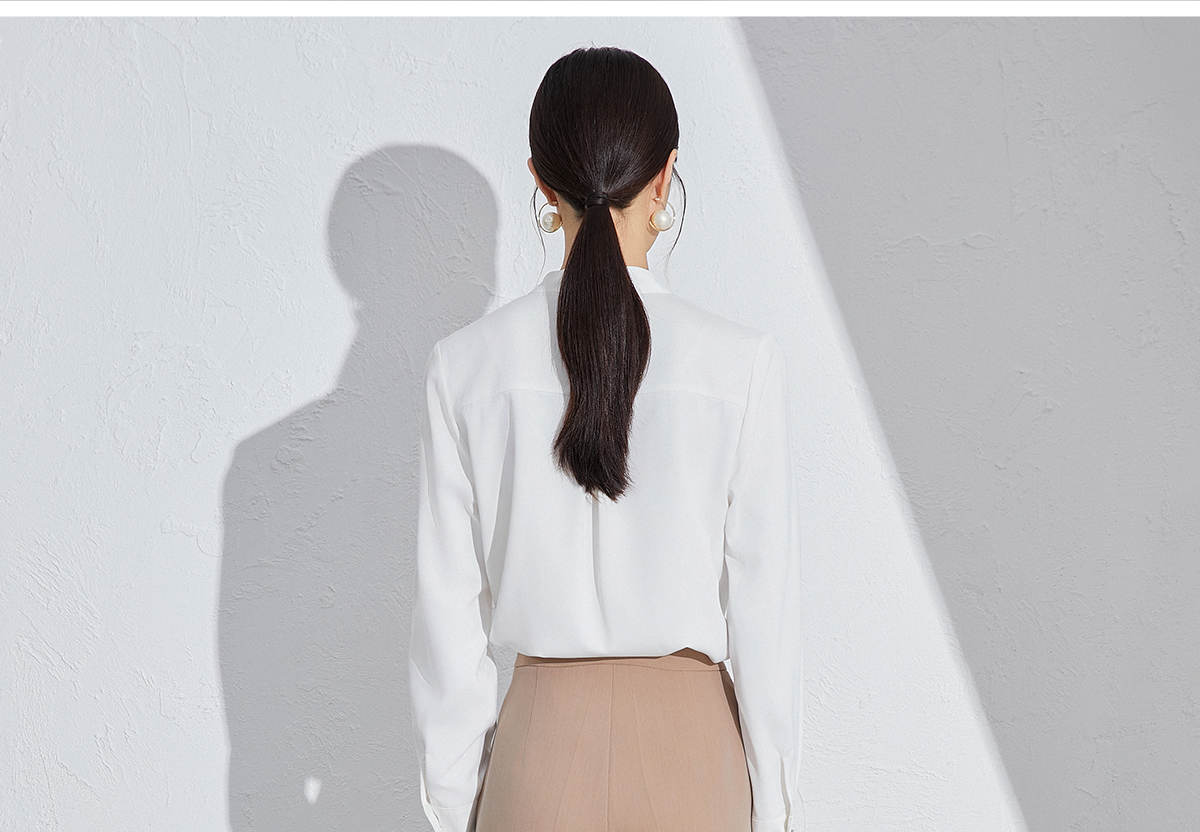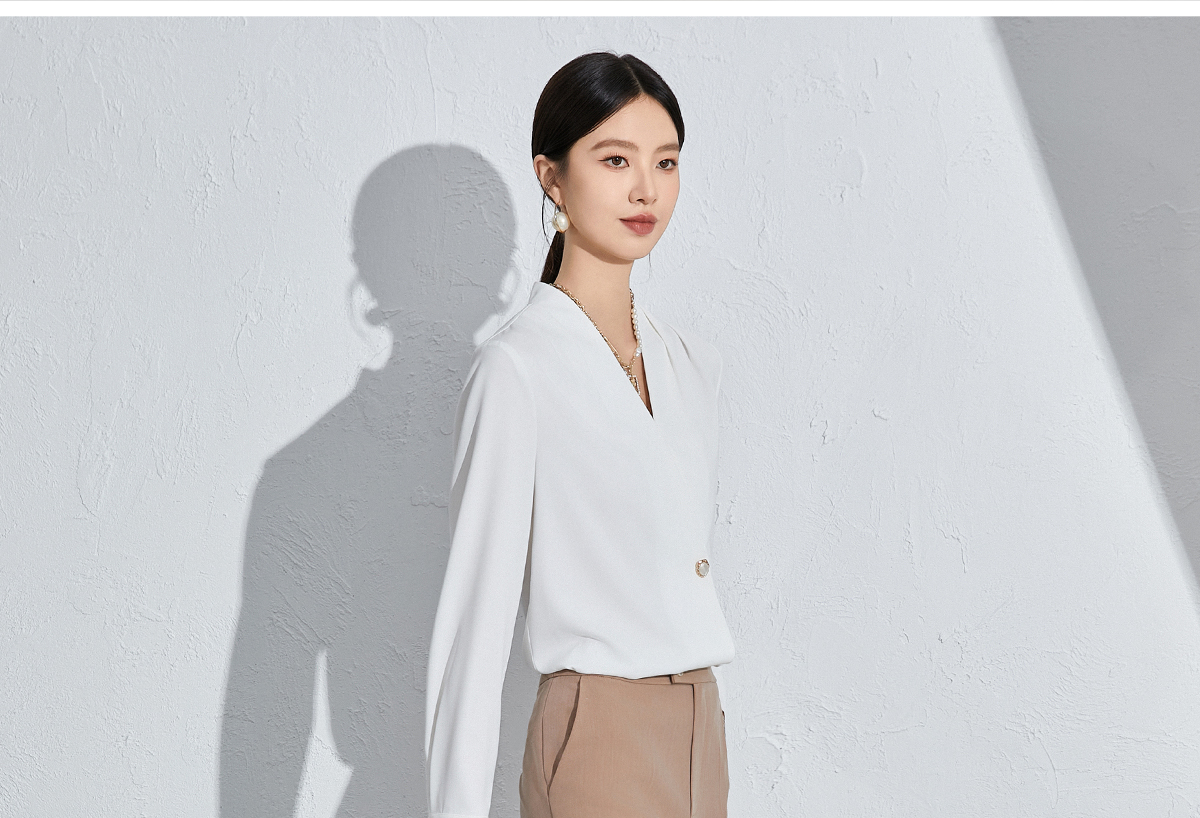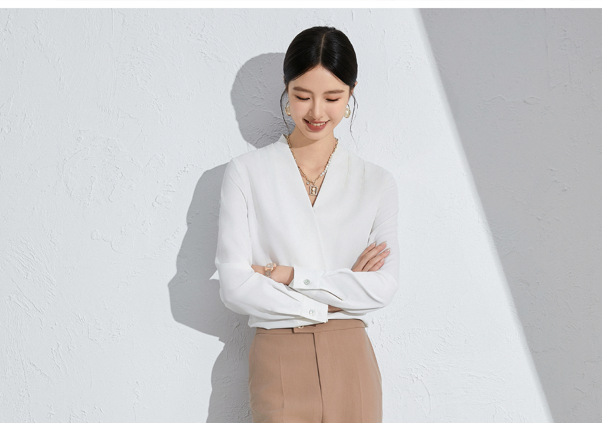 艾尚臣白色V领衬衫2024新款女轻奢高级感女装长袖职业面试正装女