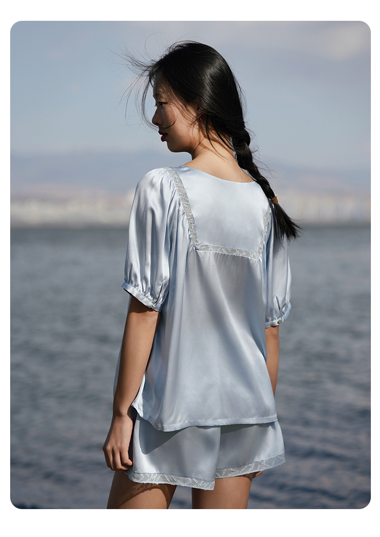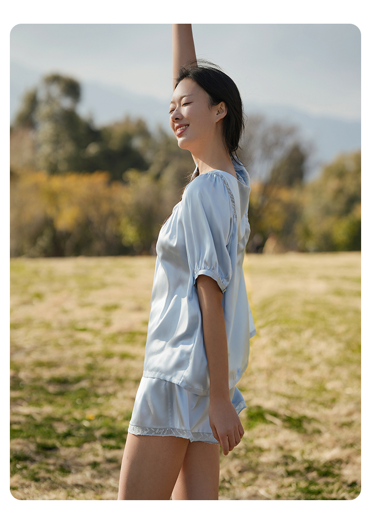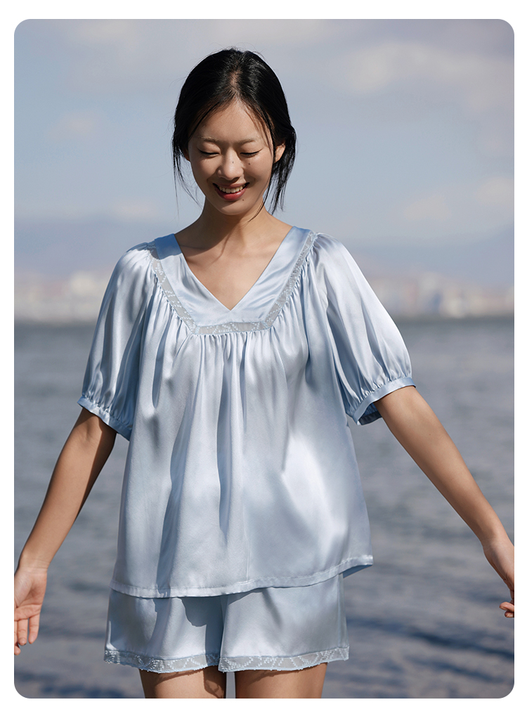 【新品】桑罗真丝V领娃娃衫泡泡袖套装女时尚显瘦减龄设计感短袖春夏新款