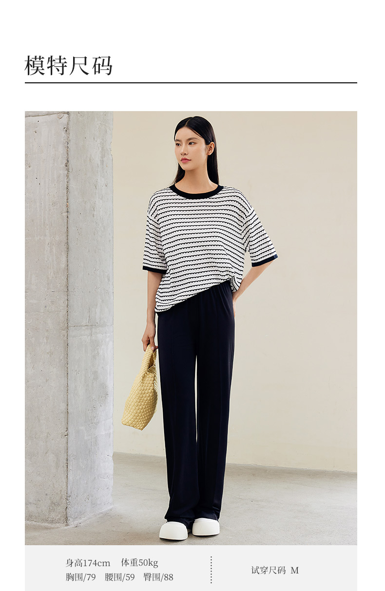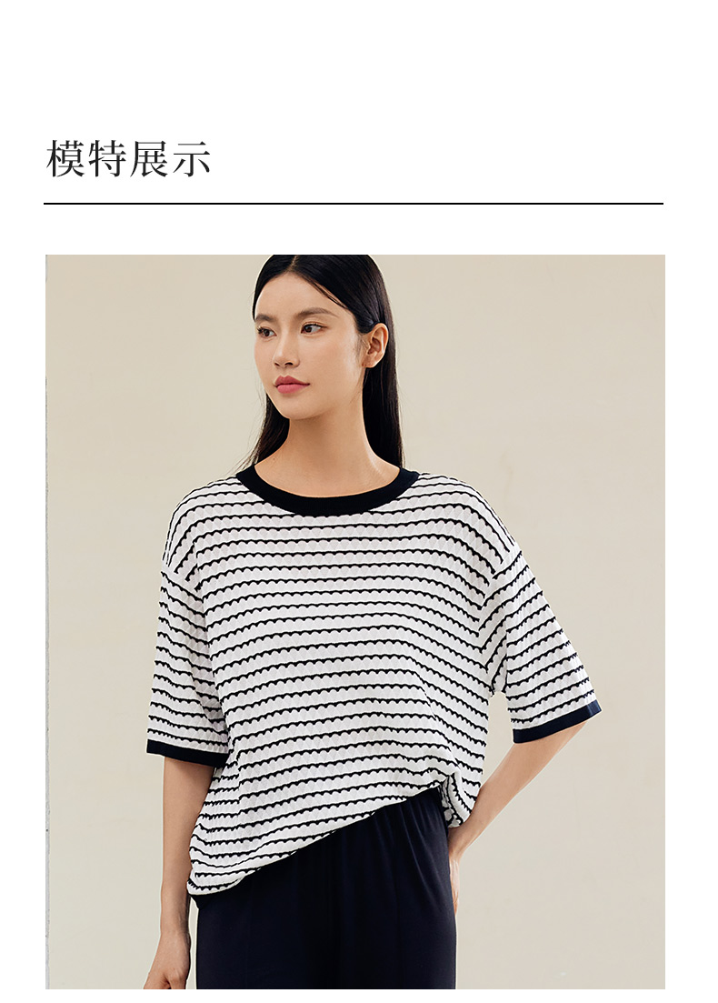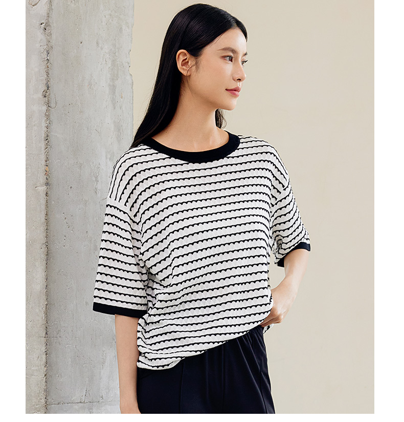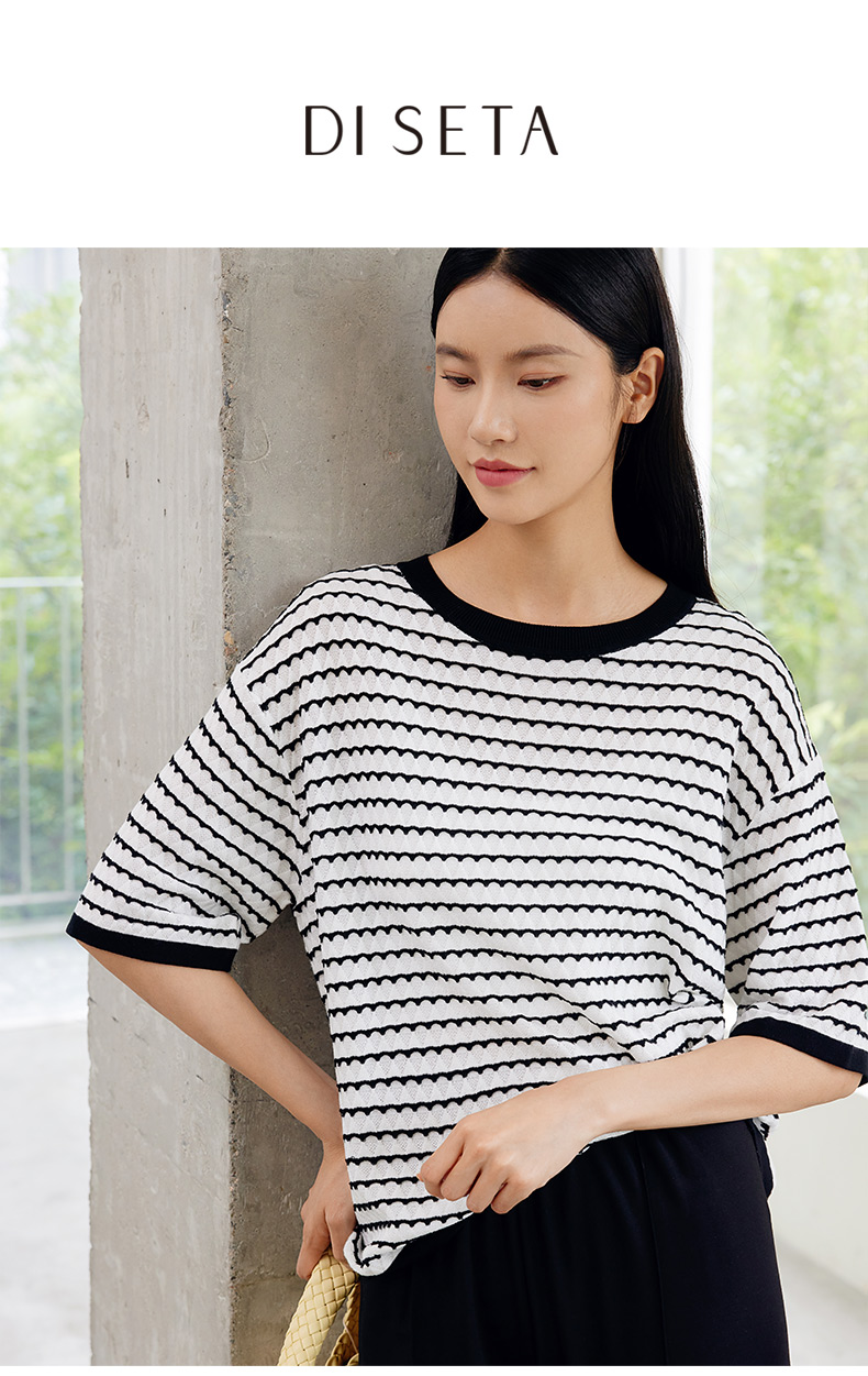 玳莎落肩袖宽松套头针织衫女2024秋季新款波浪纹圆领莱赛尔上衣 EC33104