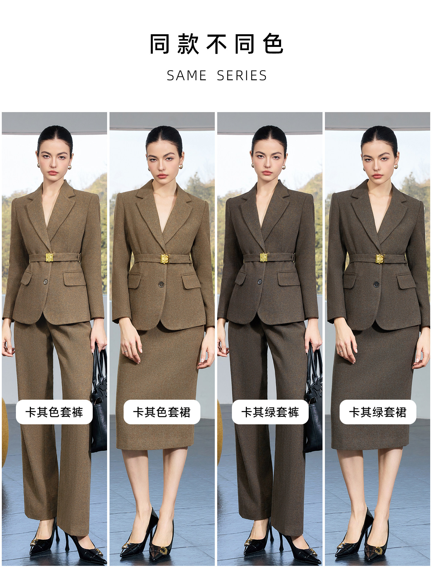 老钱风卡其绿复古羊毛人字纹西装套装女收腰通勤职业装西裤厚
