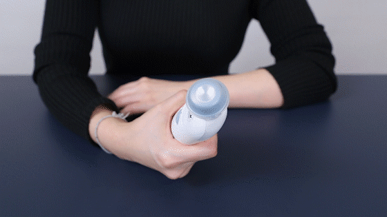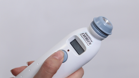 温度计测量步骤:关机状态下 → 贴紧皮肤 → 按一下按钮 → 滑动需要测量的位置 → 按一下按钮 → 拿起温度计查看温度