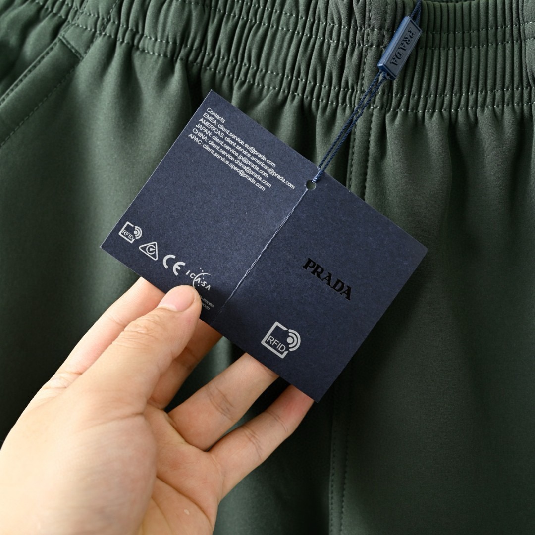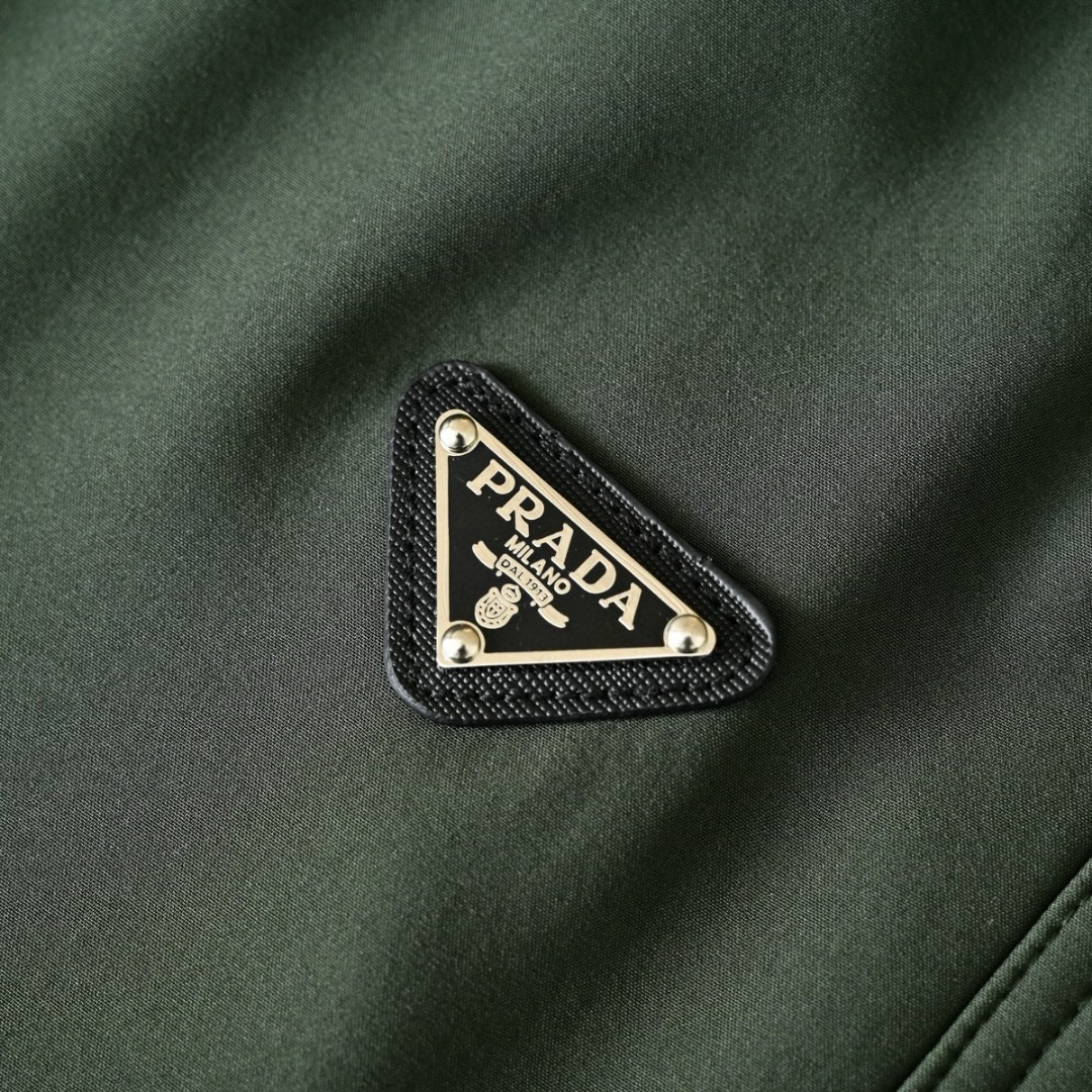 腿前PRADA经典刺绣倒立三角皮标logo点缀,彰显品牌身份!