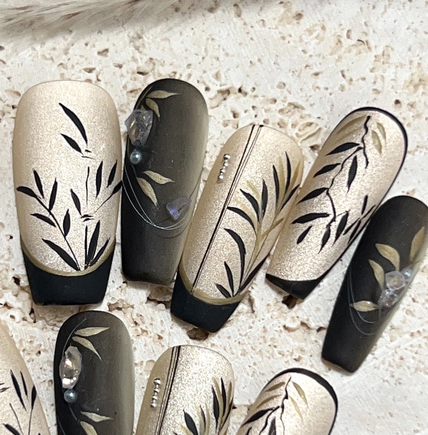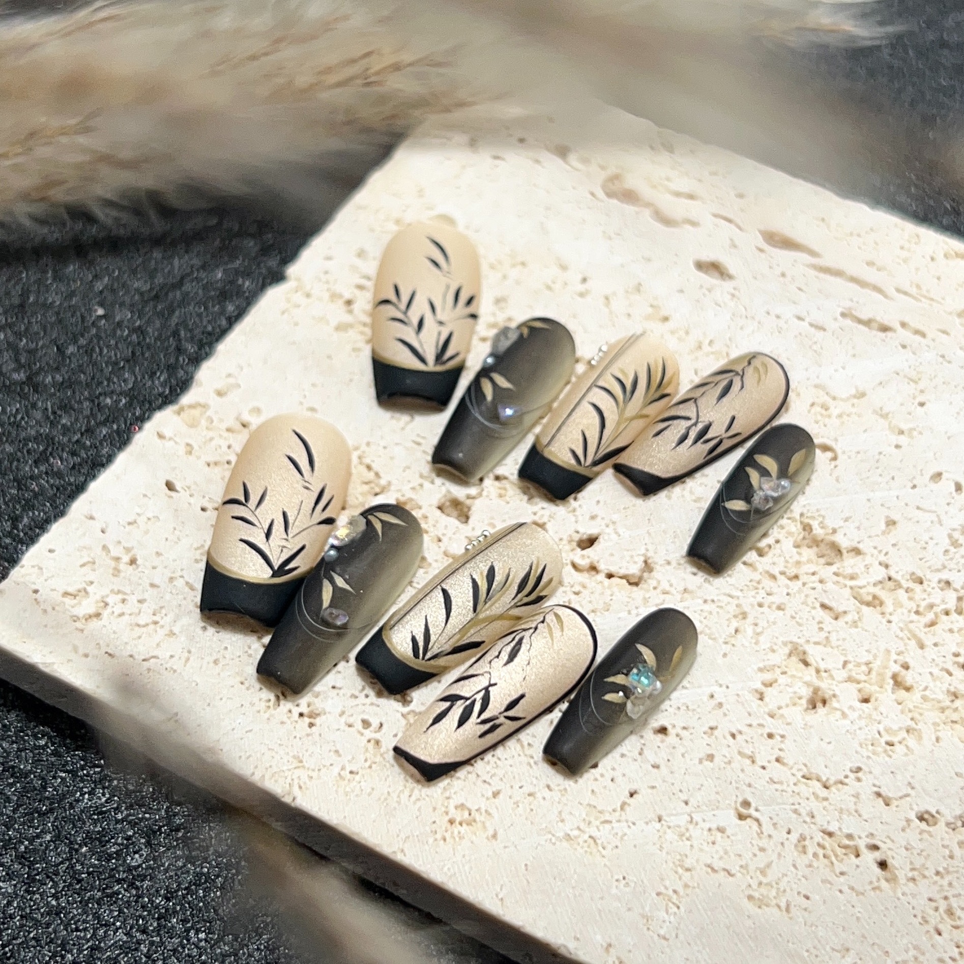美妆饰品-墨染竹林纯手工穿戴甲中长款爆闪国风美甲贴复古手绘轻奢可拆卸