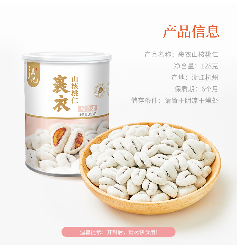 汪记新品裹衣山核桃仁临安山核桃杭州特产小核桃净重128g