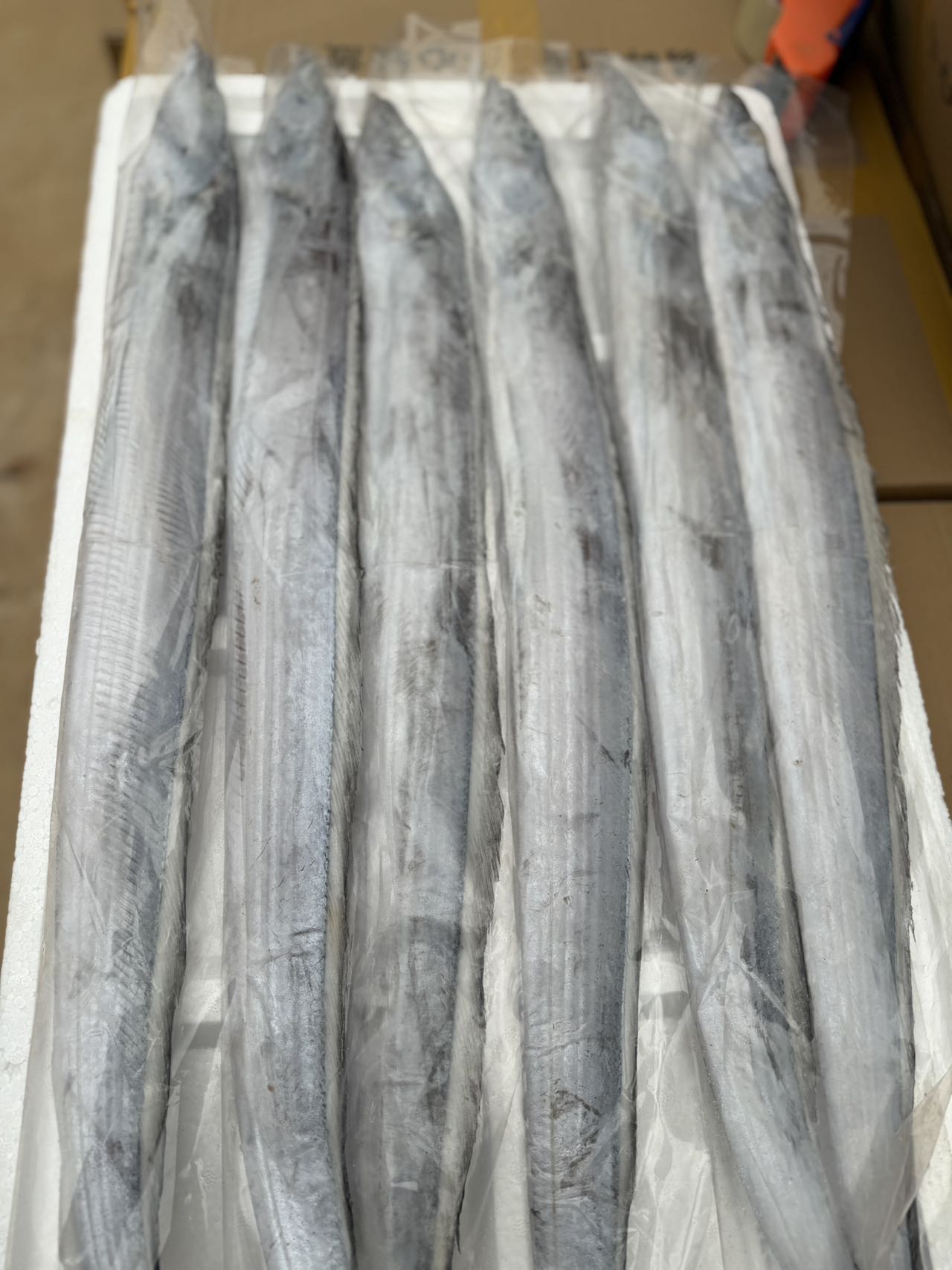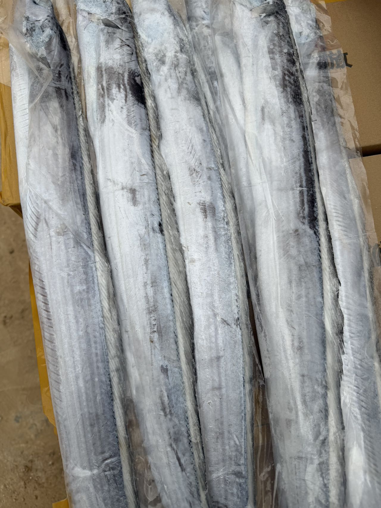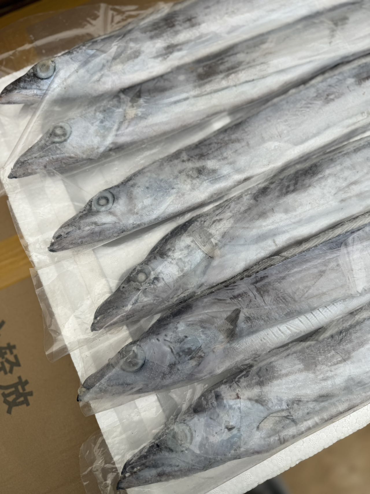钓带常栖息于水深100米以上的近海,渔民们除了使用网具大量捕捞外,还用食饵诱钧捕获的方法,钓上的带鱼称为“钓带”,其鱼体长大,表面色白如银,闪闪发亮,品质优于一般带鱼。一箱约斤,6条!一点冰衣没有