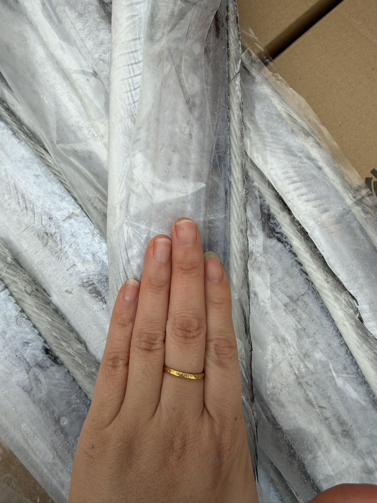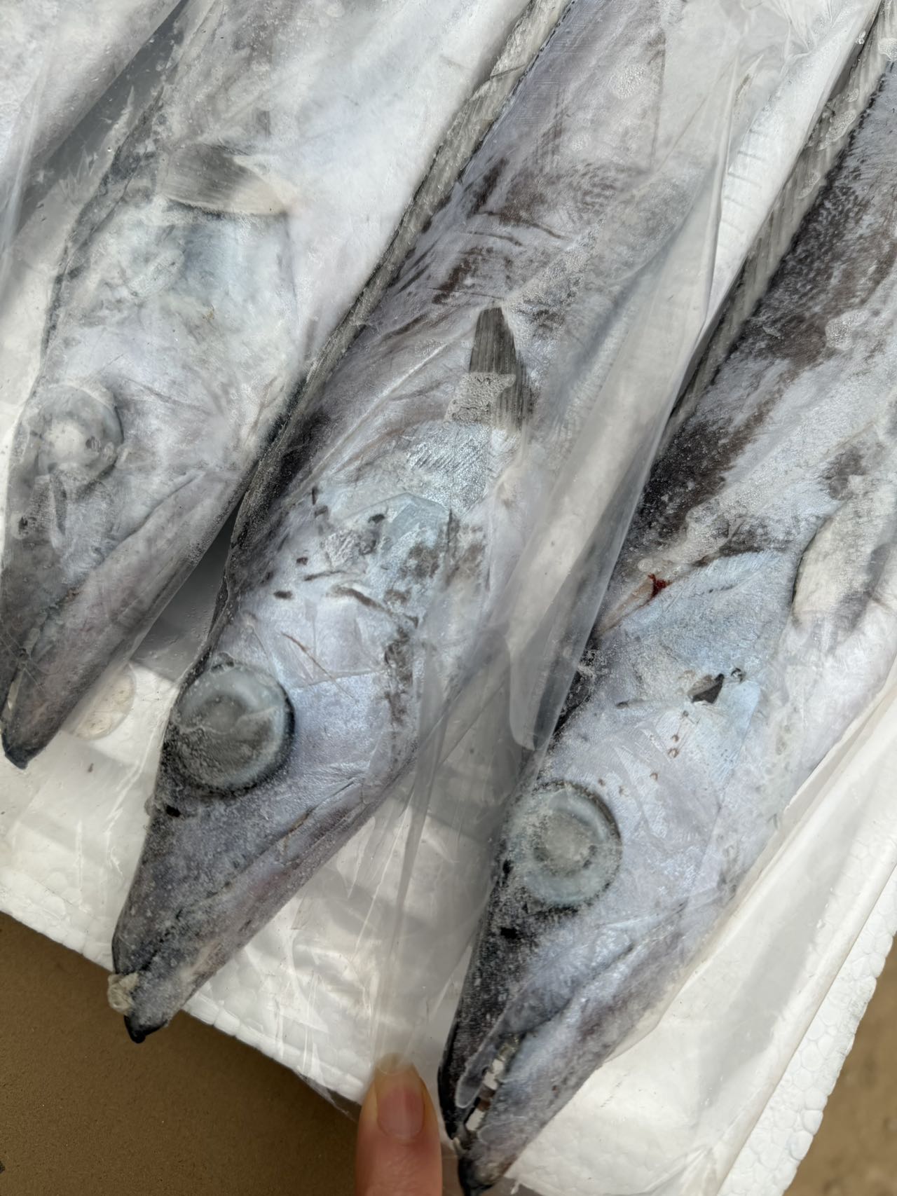 野生海钓带鱼,身上只有一层自身水分,遇冷凝结成的小冰壳并没有进行包冰,也没有添加剂。等你解冻之后,你就会知道这个鱼有多新鲜了,它的鱼鳍都能看到水润感,而且你按它的鱼肉是很嫩的,有回弹。