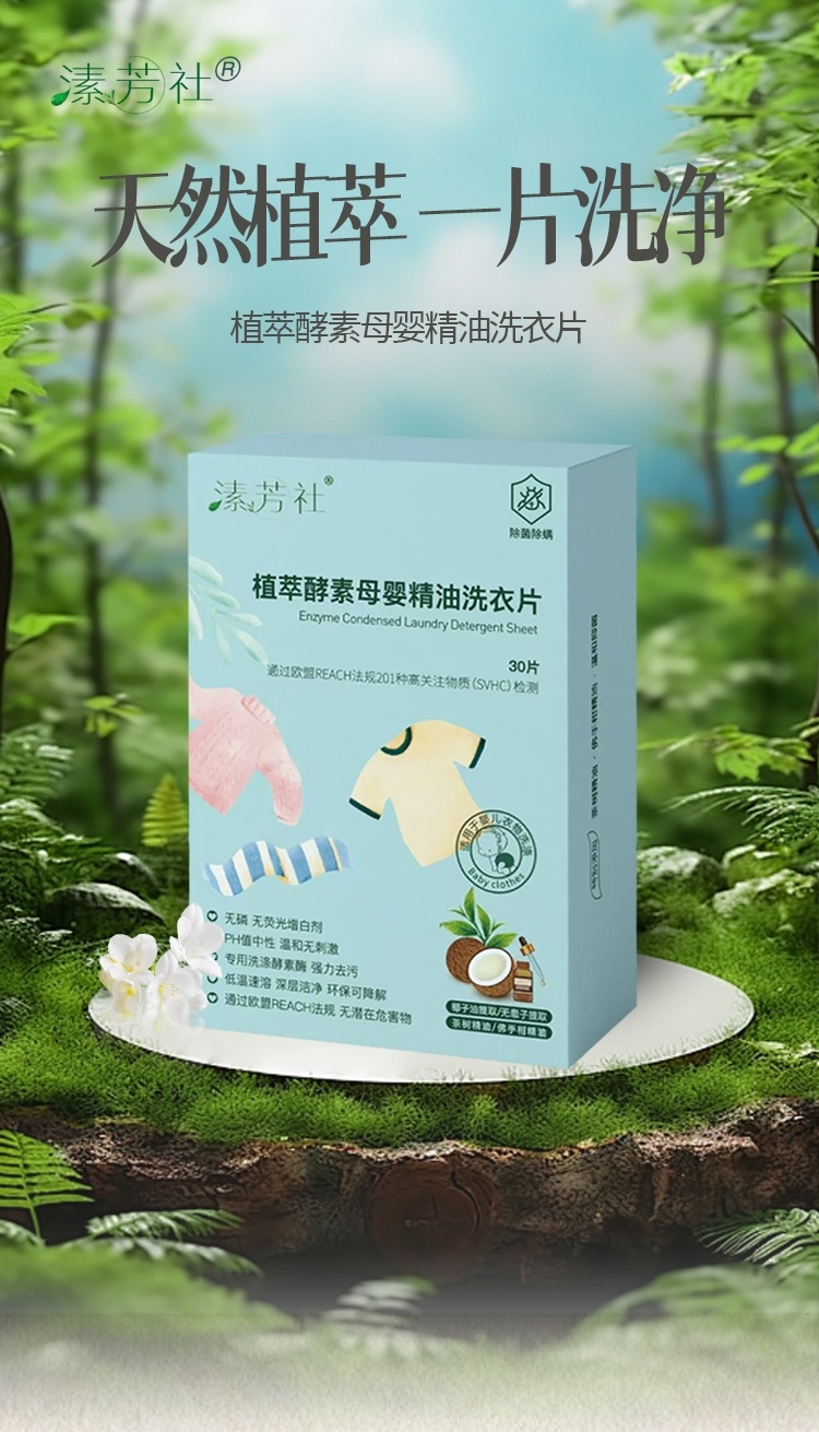溸芳社植萃酵素母婴洗衣片经过潜心研发,成功推出了成分天然无毒、环保无害的高浓缩洗衣片产品,告别塑料瓶包装。
