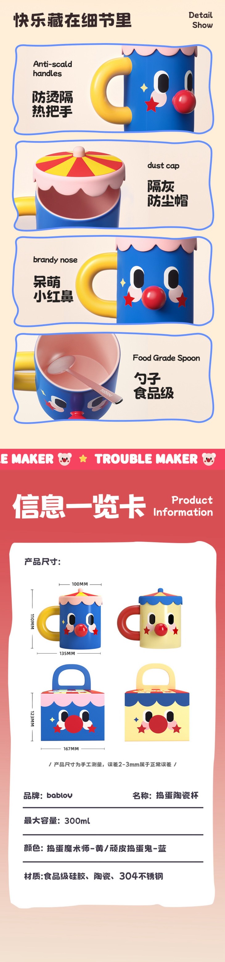 捣蛋陶瓷杯,来自品质超靠谱的bablov花伴森!材质是陶瓷质地哦,细腻又扎实,还有一点手工感,杯壁厚厚的,安全感满满;杯盖是食品级硅胶,不仅防尘效果超棒,还能做到滴水不漏,不用担心一不小心打翻弄得到处都是水了,对迷糊星人极度友好;杯子的把手设计也相当贴心,防烫隔热,握在手里稳稳当当!