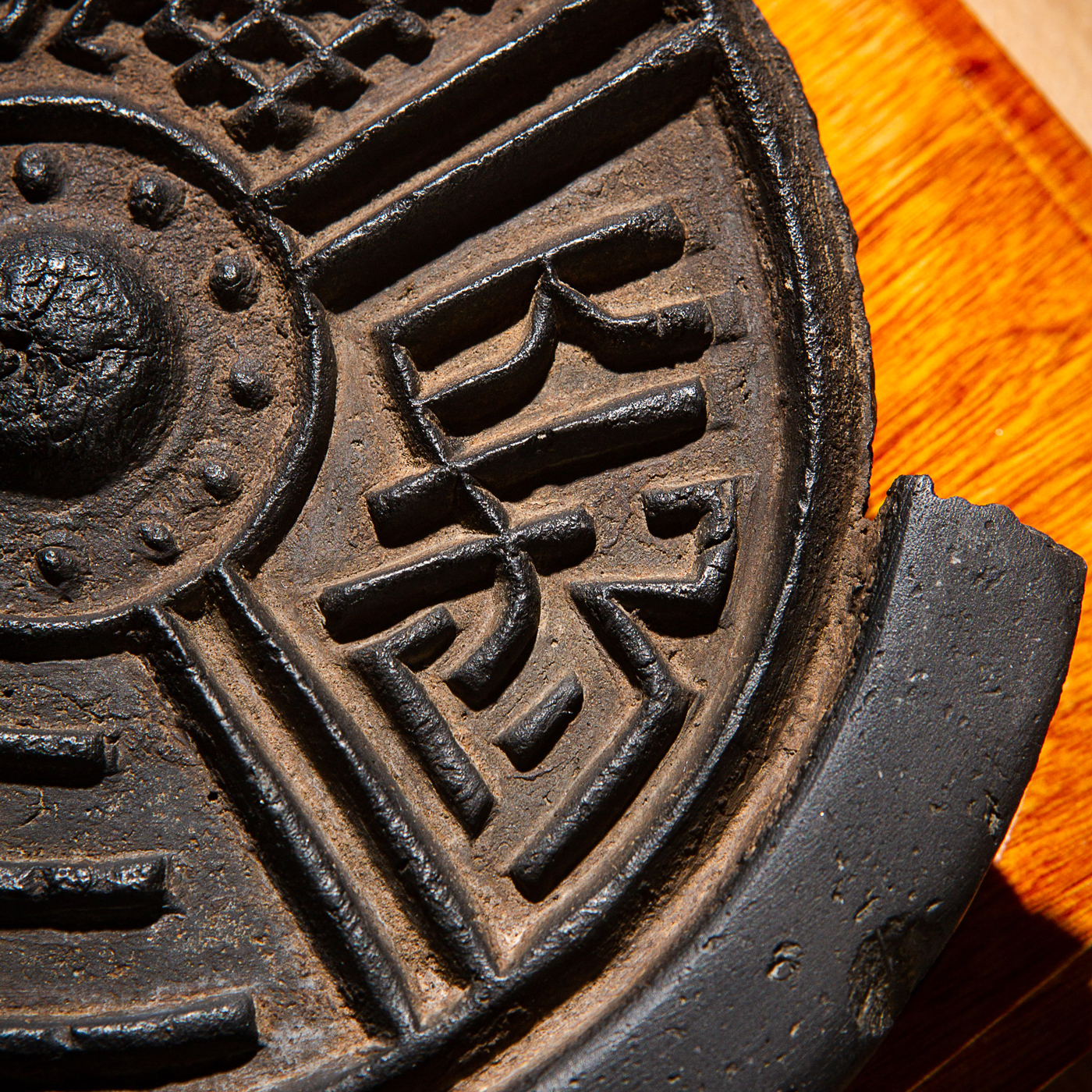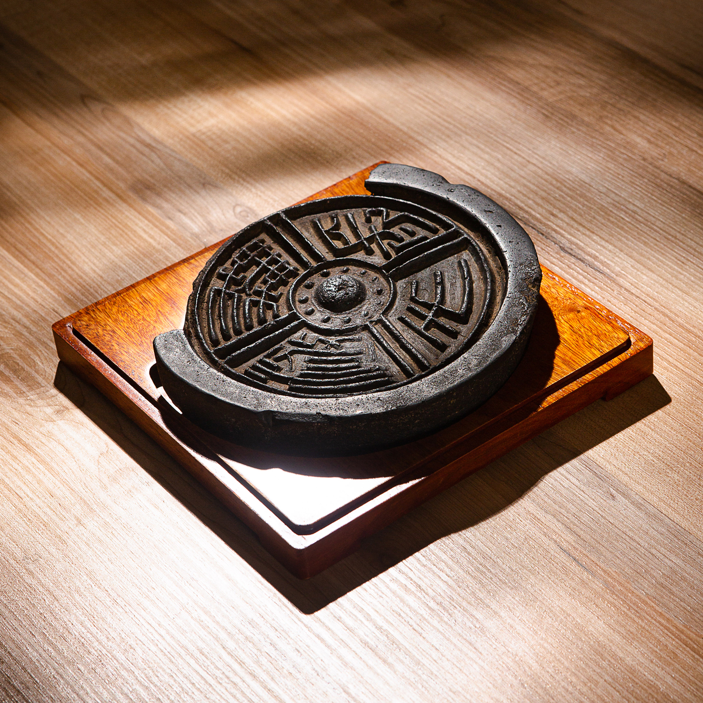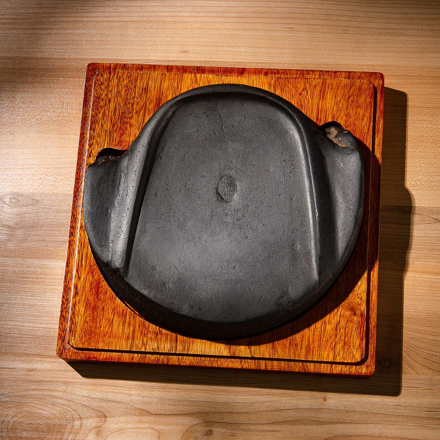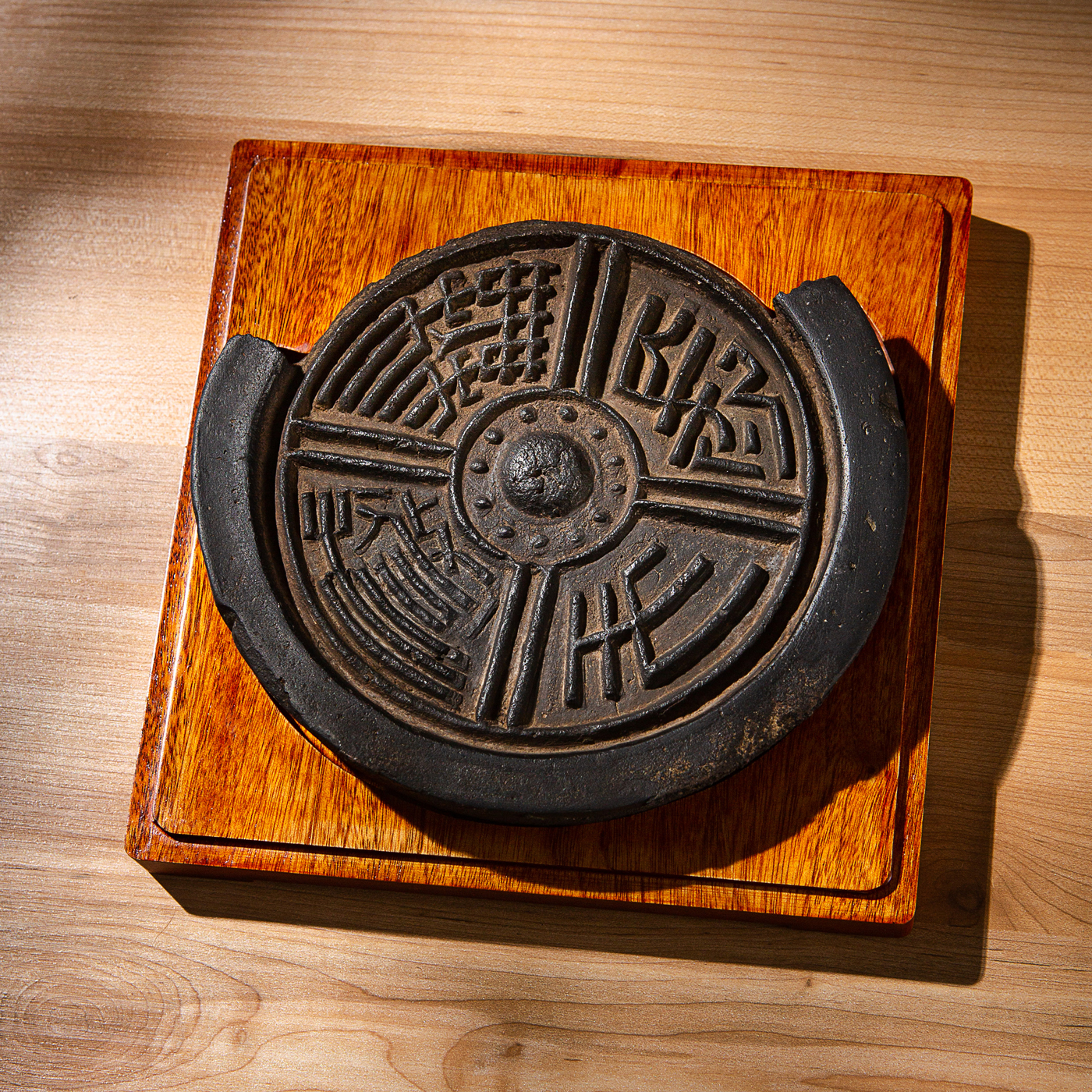 汉代“长生无极”瓦当制砚。其文字精美古拙,字口清晰有力度,胎质坚实细腻,整体呈现古朴之气息,且配有手工精制刻字木盒。