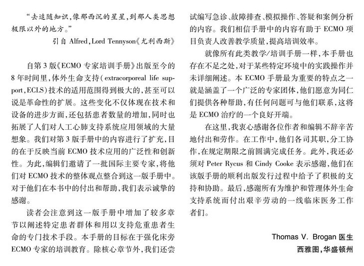 本书结合近10年全球ECMO临床积累的丰富经验更新了许多临床实际困难的解决方案,突出了ECMO患者的综合管理要义,是临床一线ECMO管理者不可多得的参考书籍。这一版手册中增加较多章节阐述特定患者群体使用ECMO的专门技术手段,还包含了急诊、故障排查、模拟操作、答疑和案例分析的内容。我们相信手册中的内容有助于ECMO团队负责人改善教学质量、提高培训效率。