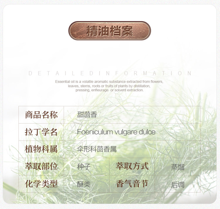 德国O家甜茴香精油 单方精油 香薰精油 稀释做精华油