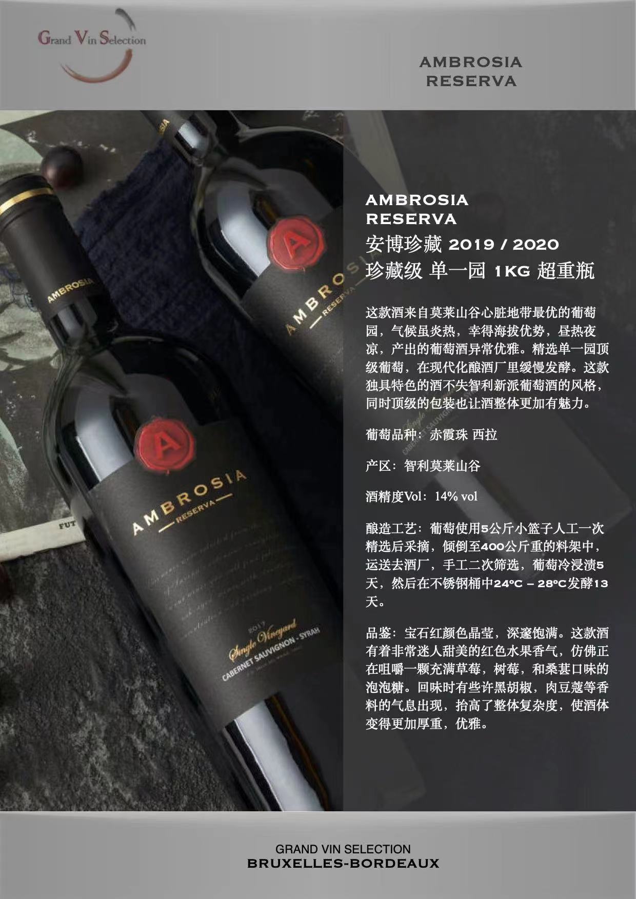 安博精选红葡萄酒100%使用来自单一葡萄园的赤霞珠 (Cabernet Sauvignon)酿造而成。葡萄由工人手工采收,并用小篮子盛装,避免葡萄之间相互挤压破裂导致氧化,从而最大程度地保持果实的新鲜。在经过4天的冷浸渍之后,葡萄汁在不锈钢罐中进行10天的发酵。安博精选红葡萄酒有着清新迷人的西梅、黑醋栗和黑莓等黑色水果香气,同时伴有智利赤霞珠典型的黑醋栗叶和青草气息;口感圆润饱演单宁柔顺,果实成熟而又不乏足够的酸度,适宜搭配牛排、肋排和羊肉等美食。