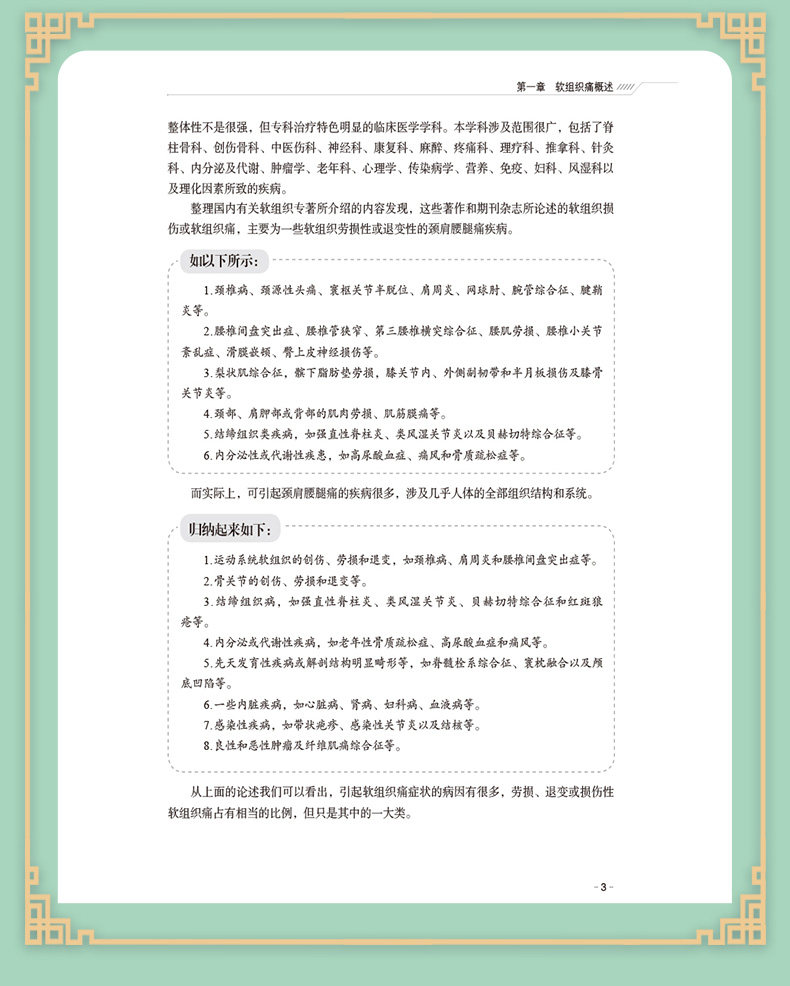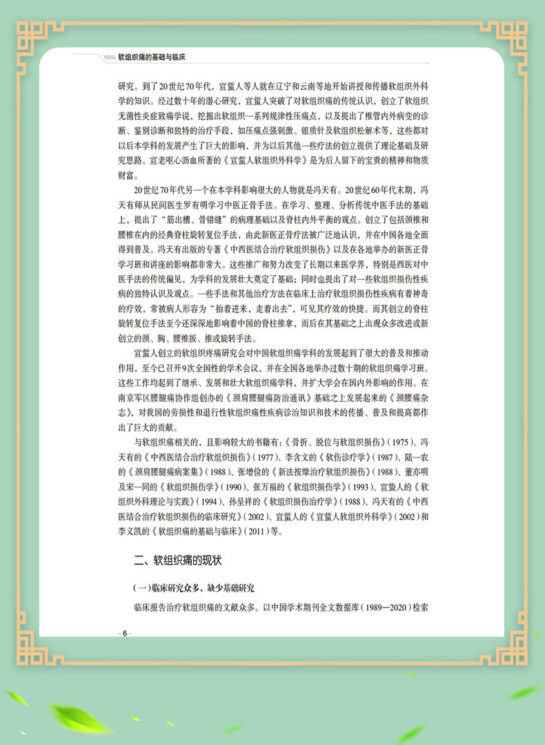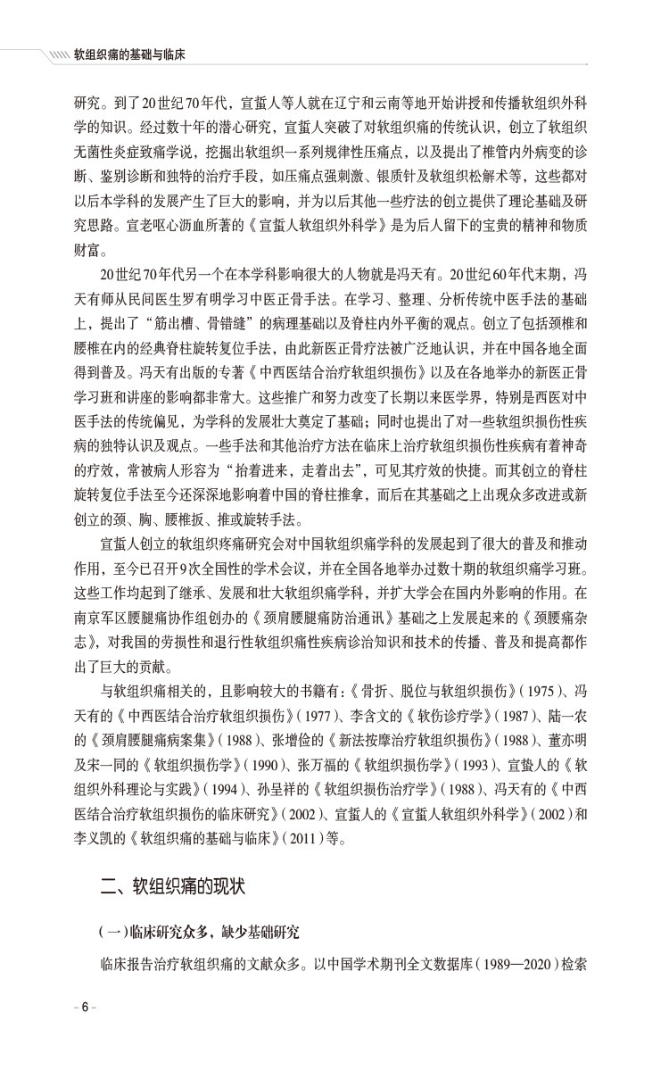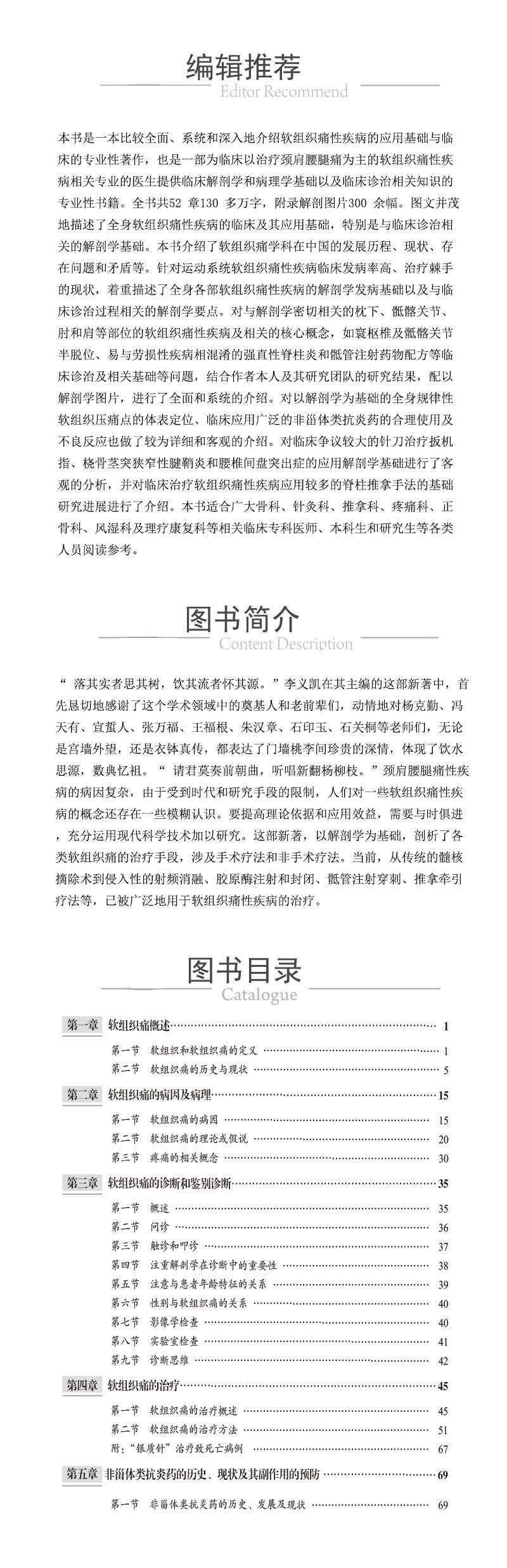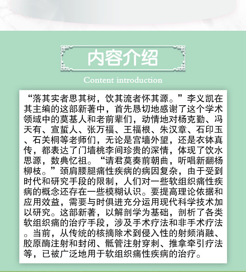 “落其实者思其树,饮其流者怀其源。”李义凯在其主编的这部新著中,首先恳切地感谢了这个学术领域中的奠基人和老前辈们,动情地对杨克勤、冯天有、宣蜇人、张万福、王福根、朱汉章、石印玉、石关桐等老师们,无论是宫墙外望,还是衣钵真传,都表达了门墙桃李间珍贵的深情,体现了饮水思源,数典忆祖。“请君莫奏前朝曲,听唱新翻杨柳枝。”颈肩腰腿痛性疾病的病因复杂,由于受到时代和研究手段的限制,人们对一些软组织痛性疾病的概念还存在一些模糊认识。要提高理论依据和应用效益,需要与时俱进,充分运用现代科学技术加以研究。这部新著,以解剖学为基础,剖析了各类软组织痛的治疗手段,涉及手术疗法和非手术疗法。当前,从传统的髓核摘除术到侵入性的射频消融、胶原酶注射和封闭、骶管注射穿刺、推拿牵引疗法等,已被广泛地用于软组织痛性疾病的治疗。