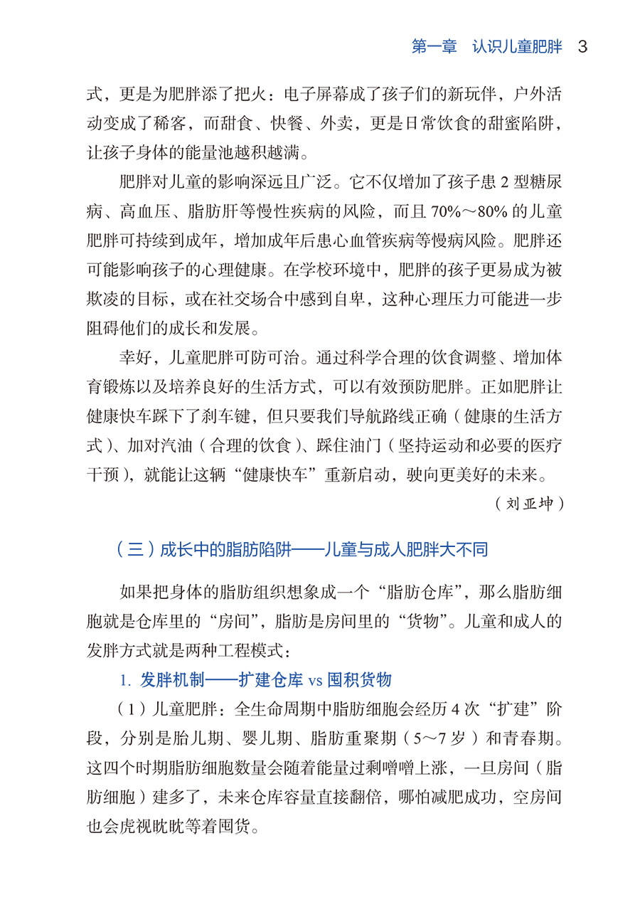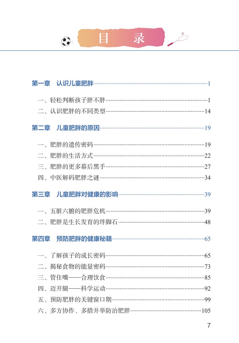 本书分为七章。第一章是概述。第二章是儿童肥胖的危害,讲解儿童肥胖会对儿童生长发育的过程及各个器官系统造成相应的危害,书中将详细介绍儿童肥胖相关危害(并发症)的定义、识别及相关注意事项。第三章是儿童肥胖的评估,讲解家庭中如何帮助孩子进行儿童肥胖的自我识别及判断;社区工作者如何对儿童肥胖进行科学、全面的评估;以及导致肥胖的相关原因评估。第四章是特殊的儿童肥胖:介绍临床上存在一些特殊类型的儿童肥胖。第五章是肥胖儿童的体重管理技巧,包括饮食、运动、睡眠、行为管理、心理健康指导、中医治疗。第六章是常见误区。第七章是实操案例分析及食谱举例。
