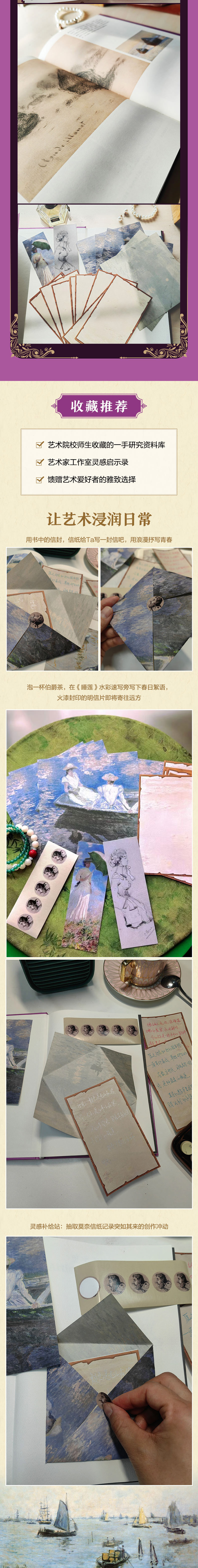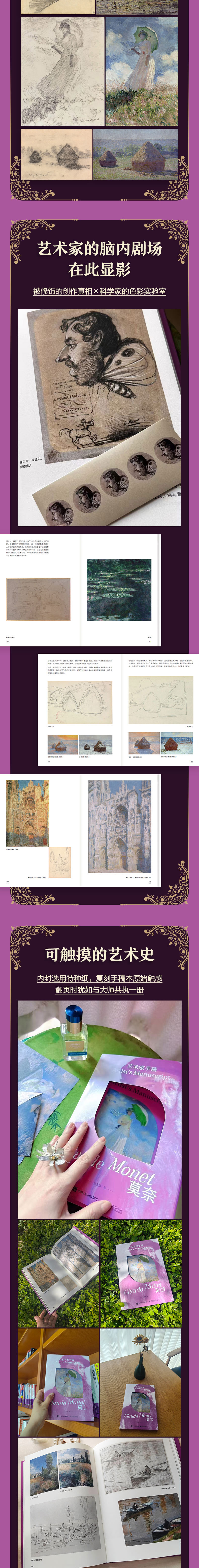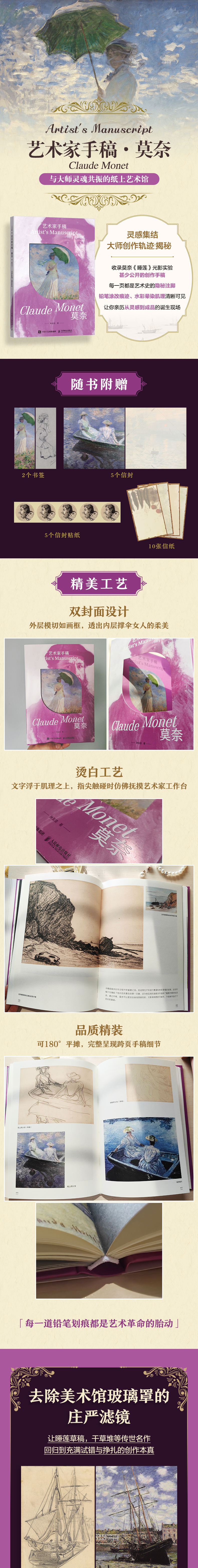 本书围绕着艺术家莫奈的手稿展开,带读者走进印象派大师莫奈的艺术世界,这些手稿是莫奈艺术生涯的珍贵印记。手稿中,有对光影效果的细腻捕捉,从晨曦到日落,从不同季节到各类天气,莫奈用简单的笔触勾勒出光的变幻。我们能看到他为画作所做的构思,无论是色彩的搭配尝试,还是构图的初步设想。这些手稿还体现了莫奈独特的绘画技巧,快速而灵动的线条彰显出他对瞬间印象的捕捉能力。 无论是艺术的爱好者,还是专业的艺术研究者,*能从本书中探寻到莫奈的艺术密码,这些手稿不仅是莫奈艺术灵感的源泉,更反映出印象派注重瞬间、追求户外写生和光影表达的艺术风格,它们是理解莫奈和印象派艺术发展的关键资料。