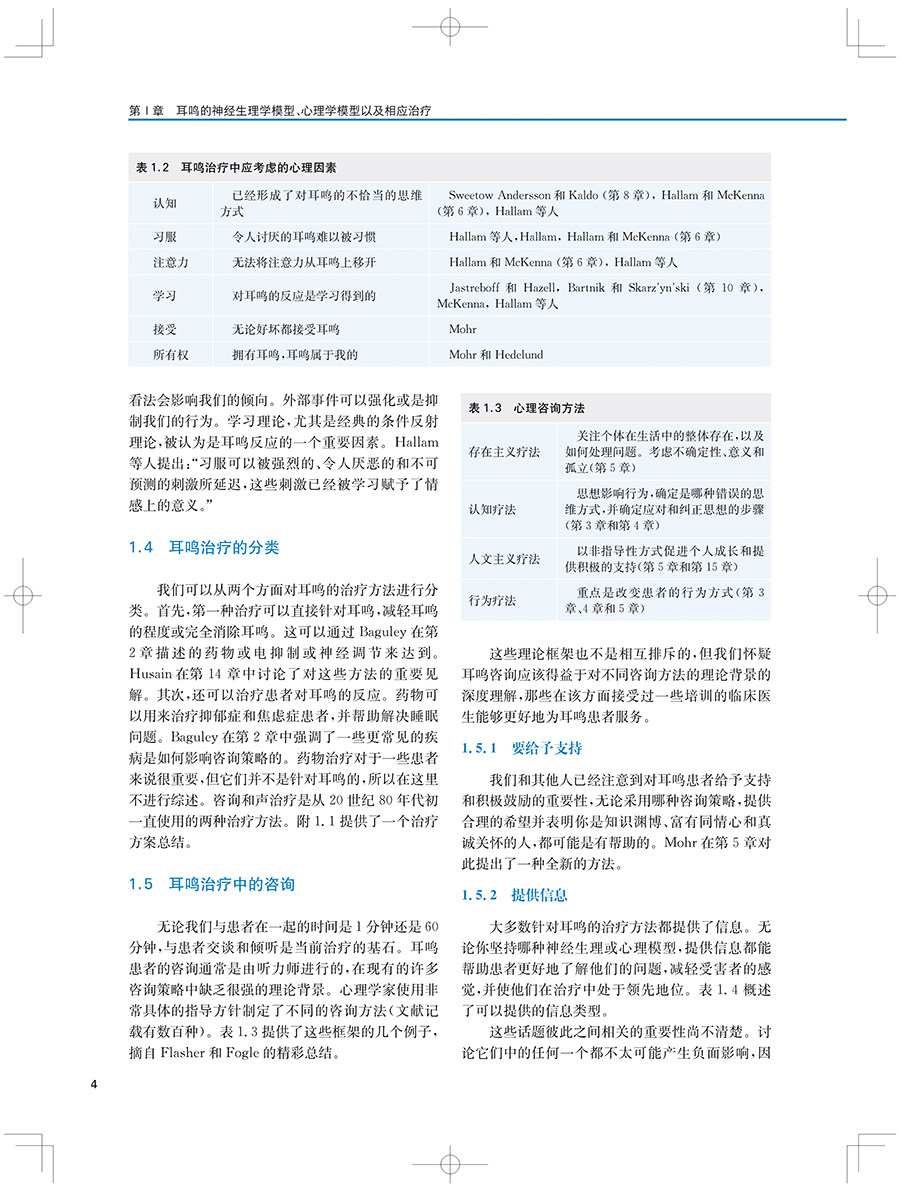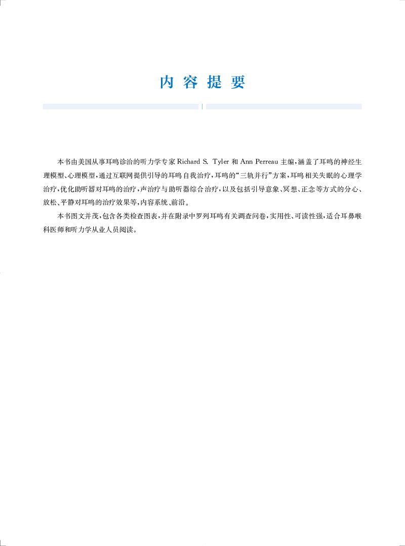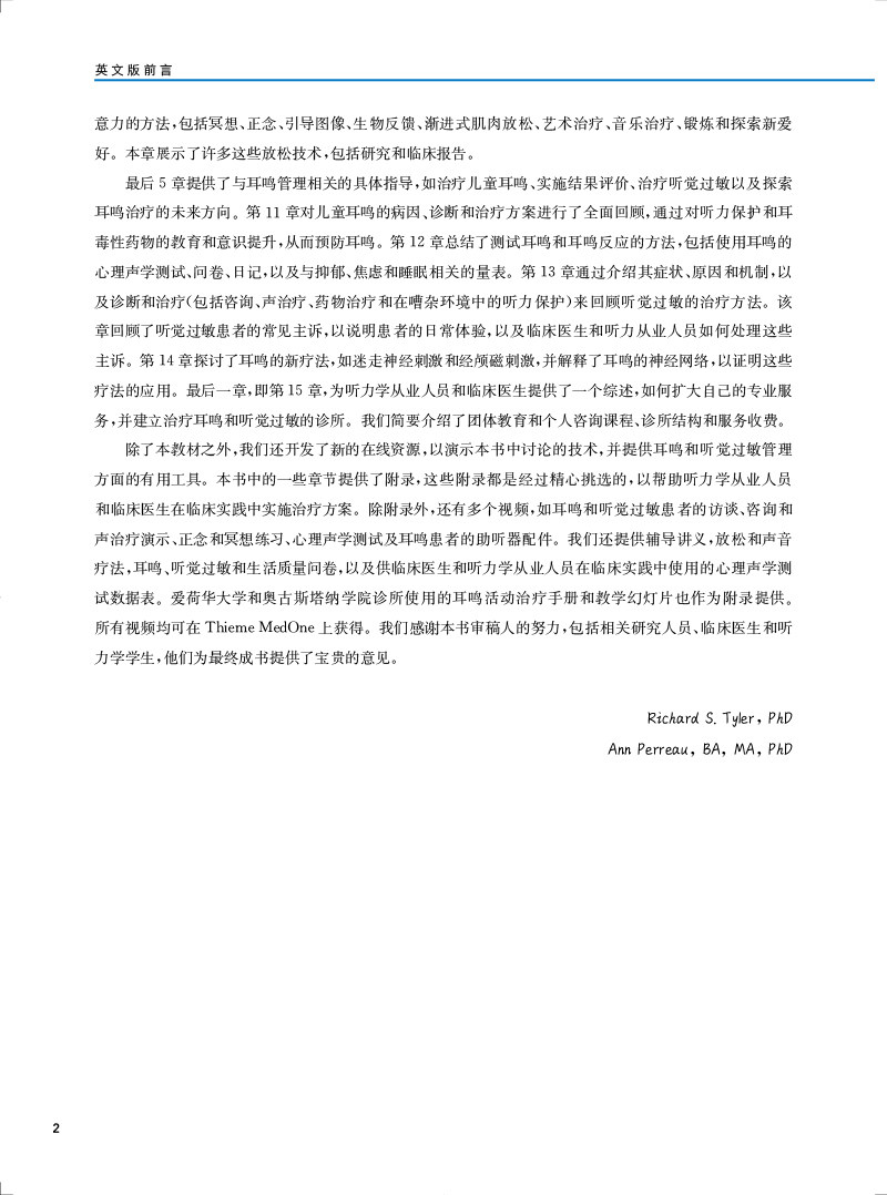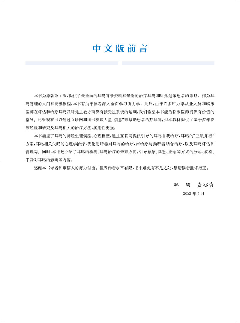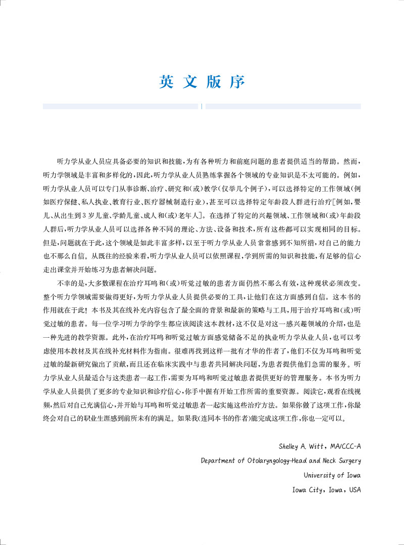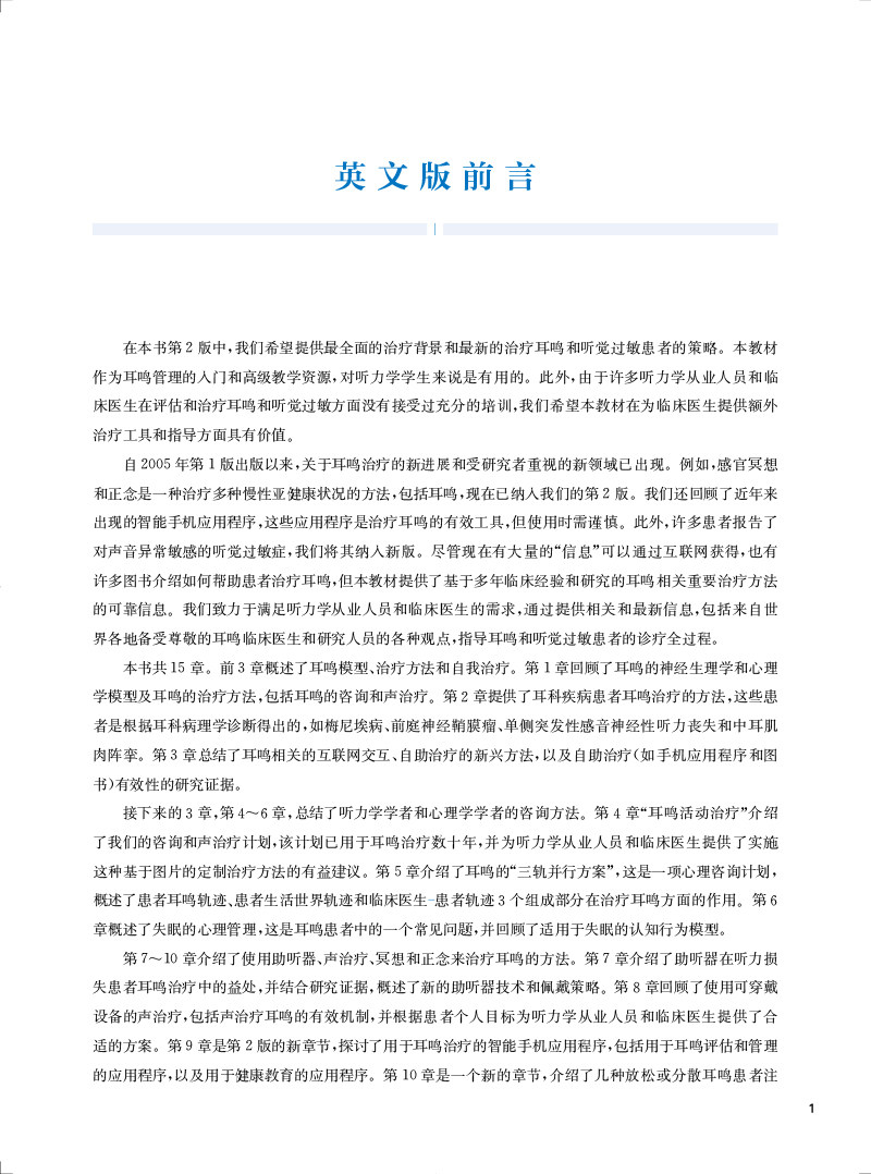 "本书及其在线补充内容包含了最全面的背景和近期新的策略与工具,用于治疗耳鸣和(或)听 觉过敏的患者。每一位学习听力学的学生都应该阅读这本教材。这不仅是对这一感兴趣领域的介绍,也是一种优选的教学资源。此外,任何在治疗耳鸣和听觉过敏方面感觉储备不足的执业听力学从业人员都应该考虑使用本教材及其在线补充材料作为指南。"