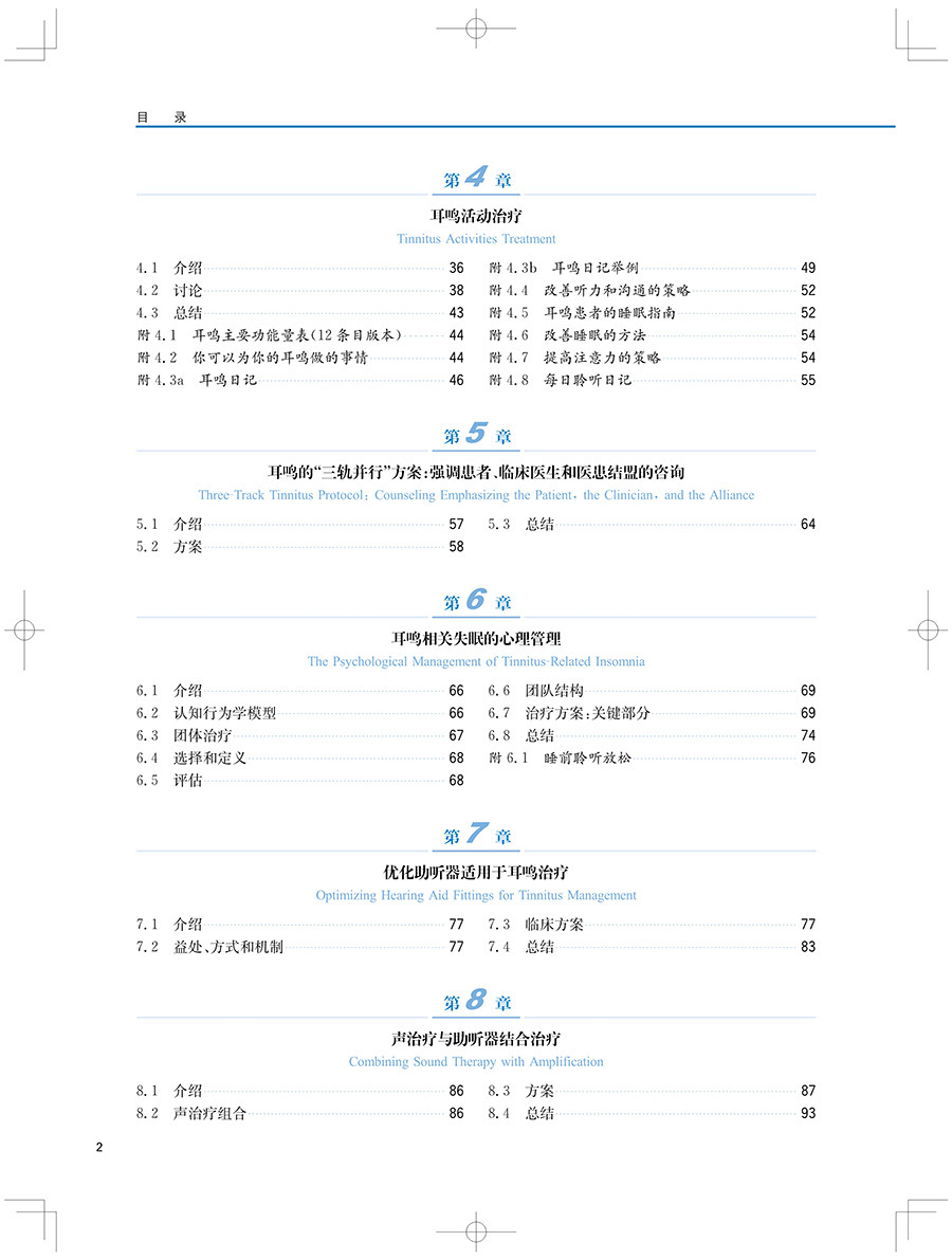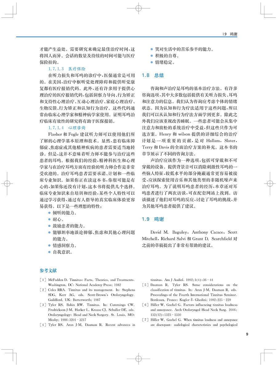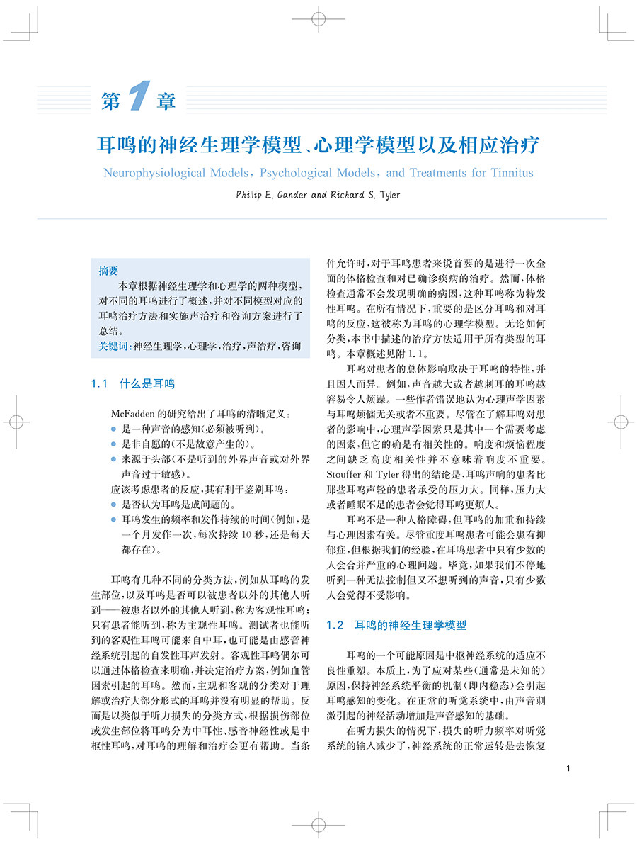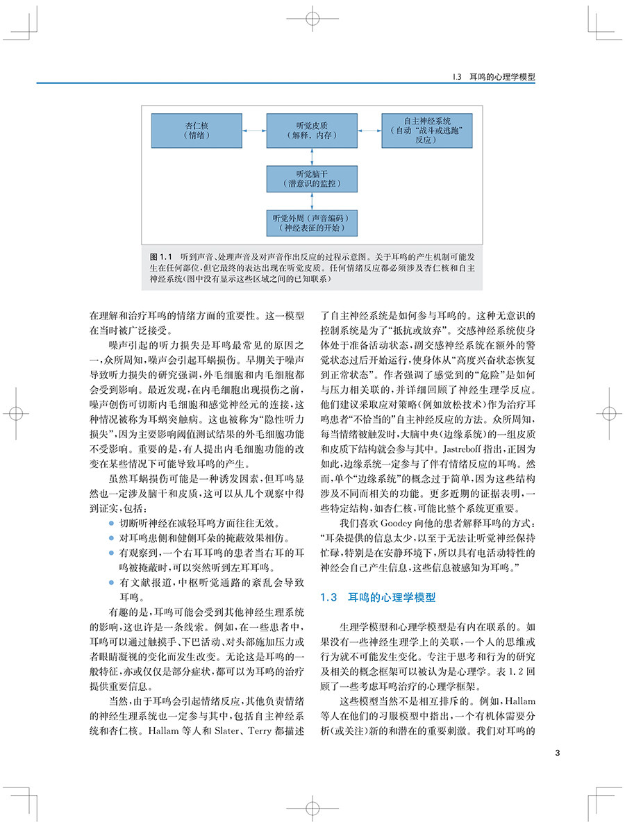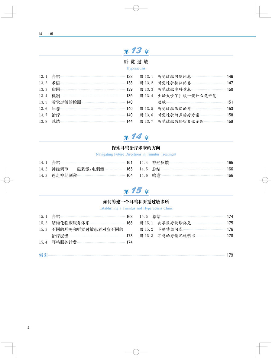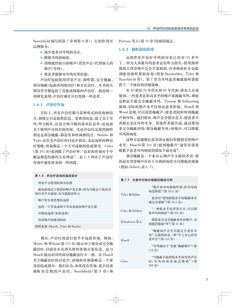 "本书及其在线补充内容包含了最全面的背景和近期新的策略与工具,用于治疗耳鸣和(或)听 觉过敏的患者。每一位学习听力学的学生都应该阅读这本教材。这不仅是对这一感兴趣领域的介绍,也是一种优选的教学资源。此外,任何在治疗耳鸣和听觉过敏方面感觉储备不足的执业听力学从业人员都应该考虑使用本教材及其在线补充材料作为指南。"