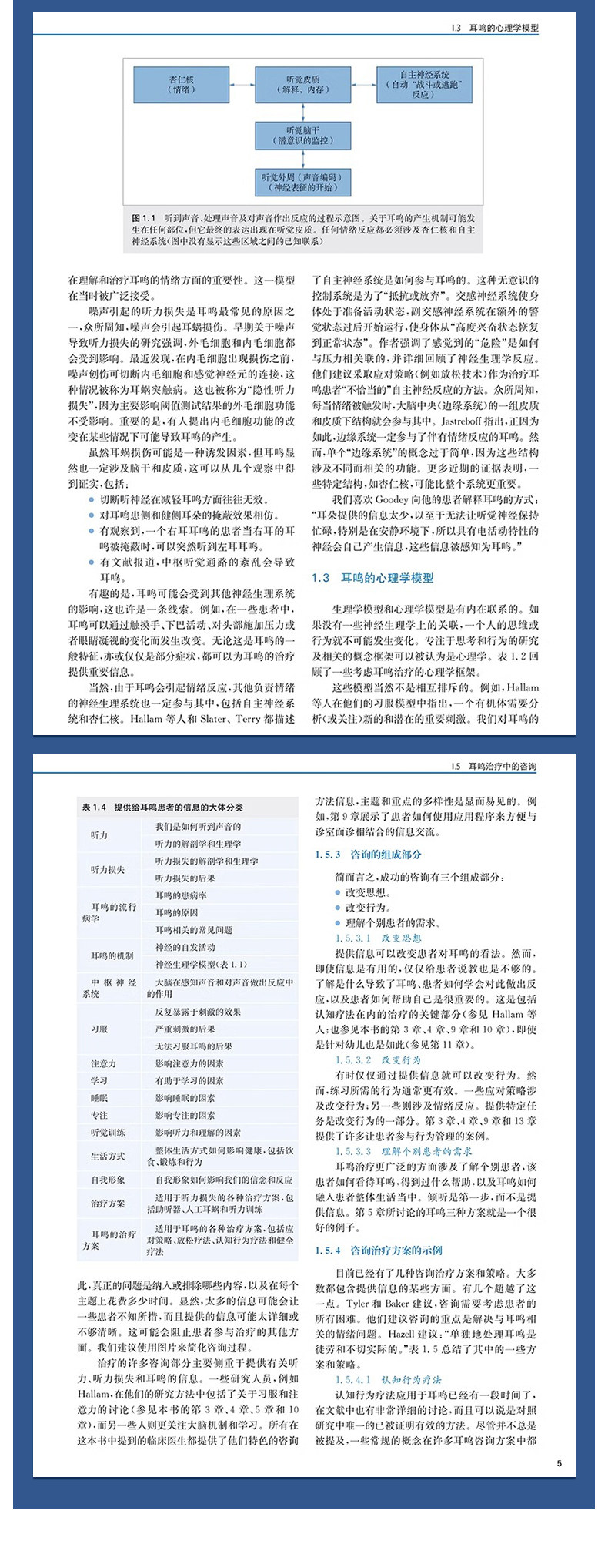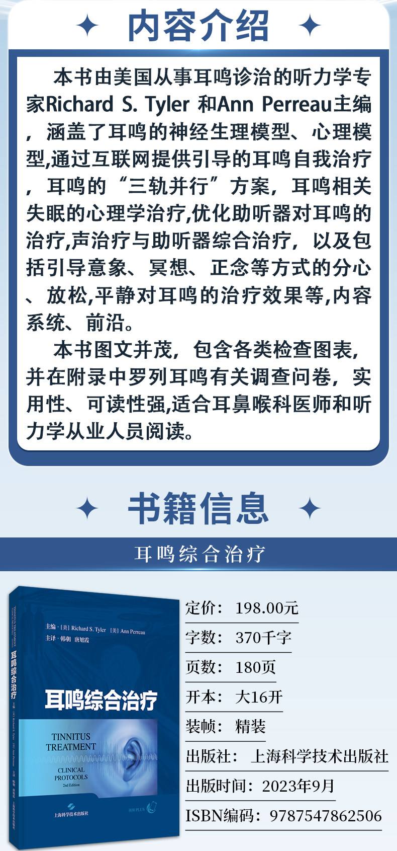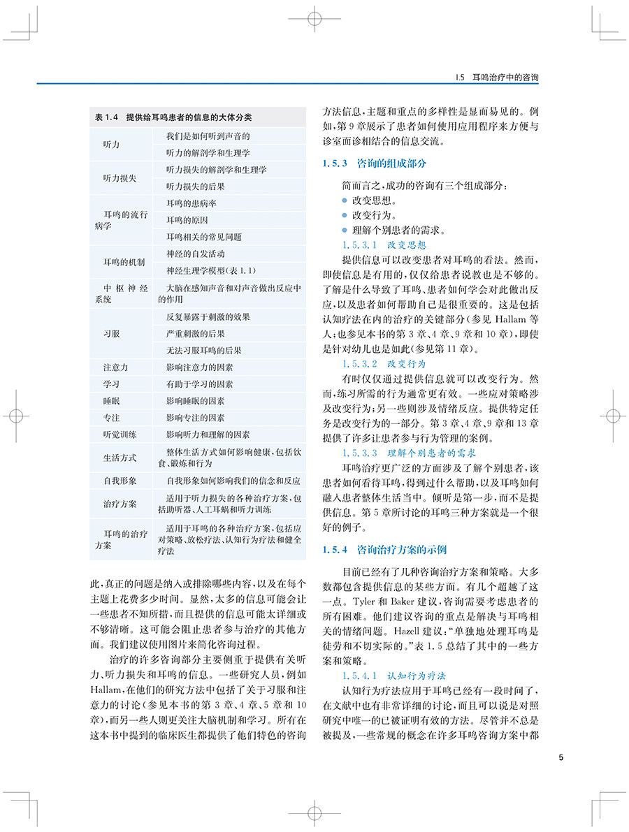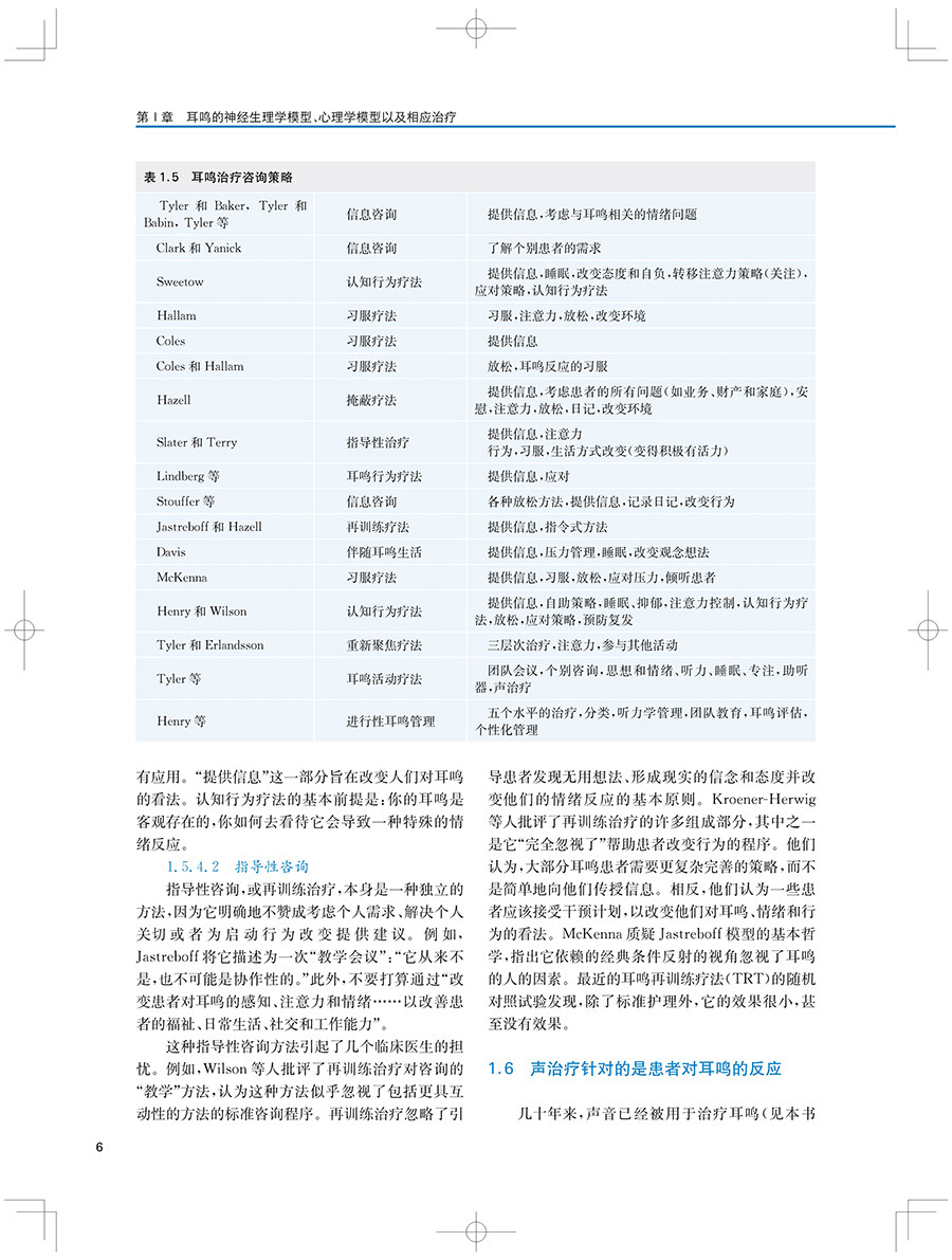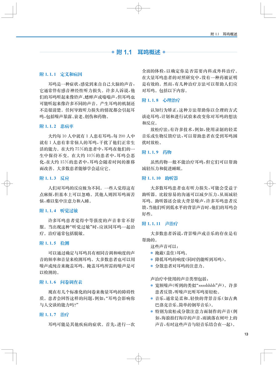 "本书及其在线补充内容包含了最全面的背景和近期新的策略与工具,用于治疗耳鸣和(或)听 觉过敏的患者。每一位学习听力学的学生都应该阅读这本教材。这不仅是对这一感兴趣领域的介绍,也是一种优选的教学资源。此外,任何在治疗耳鸣和听觉过敏方面感觉储备不足的执业听力学从业人员都应该考虑使用本教材及其在线补充材料作为指南。"