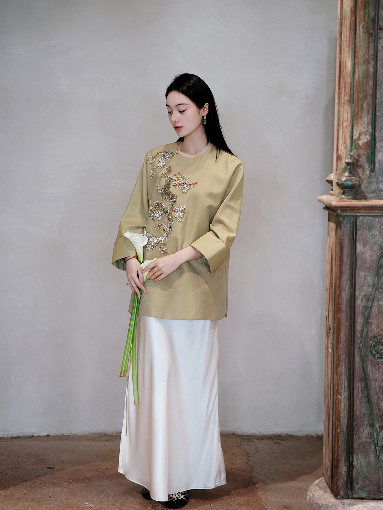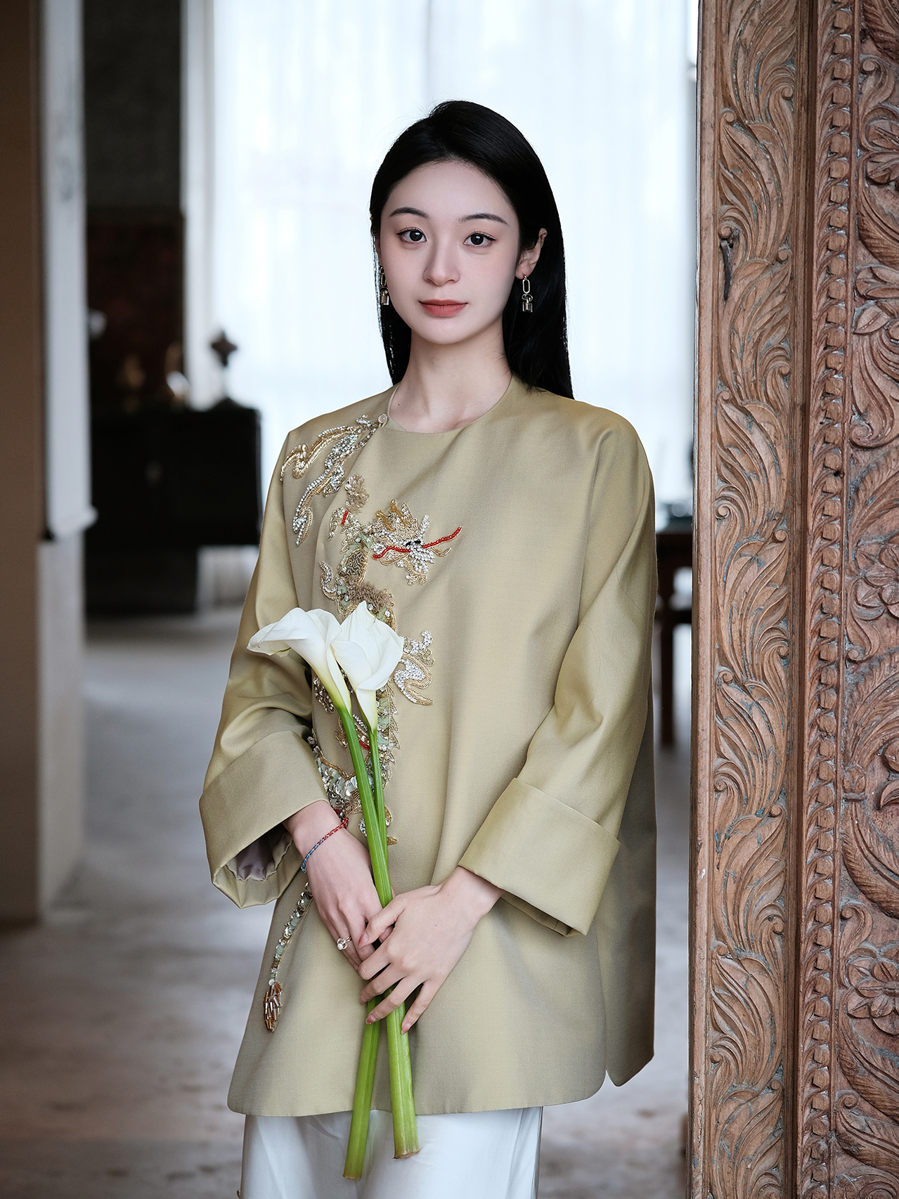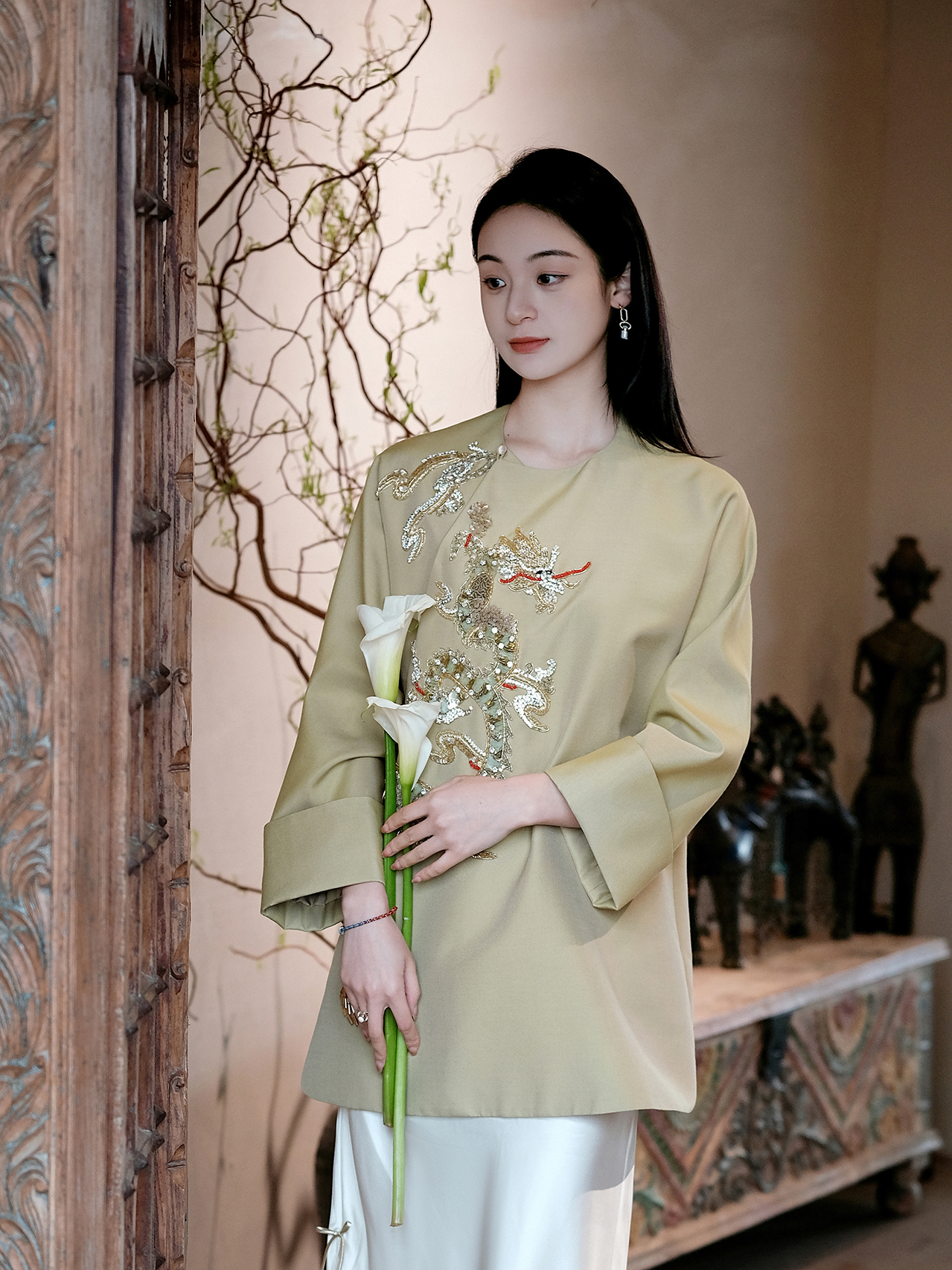 盛唐牡丹 |真丝提花梅兰竹菊偏襟上衣